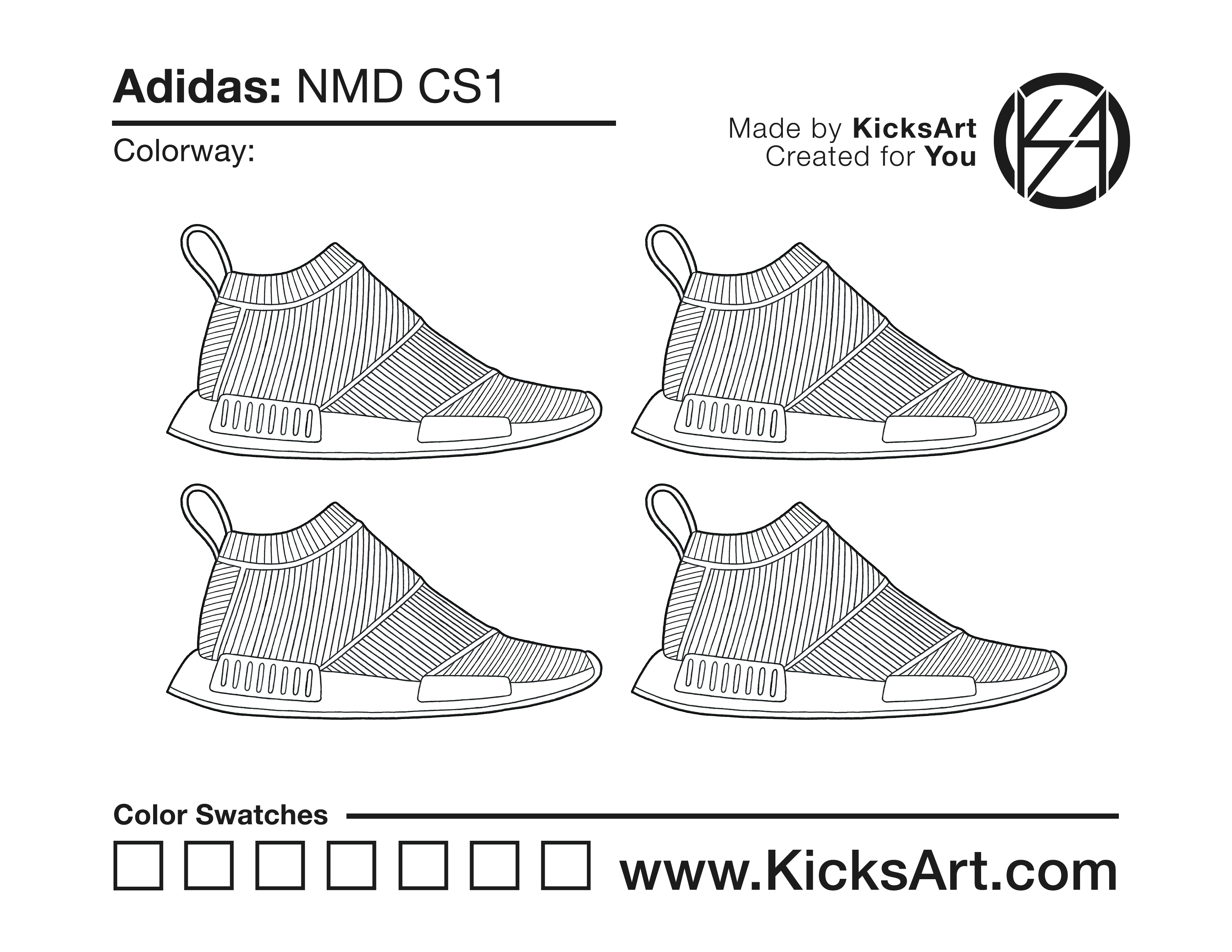 Adidas NMD CS1 Sneaker Coloring Pages March 15, 2019 kicksart05 For any sneaker coloring page, click on the button above the image to start the instant download! FREE Download: Adidas NMD CS1 Art materials can be expensive!Try out colorways on these smaller templates so your supplies can last longer! Adidas NMD CS1 (4UP)