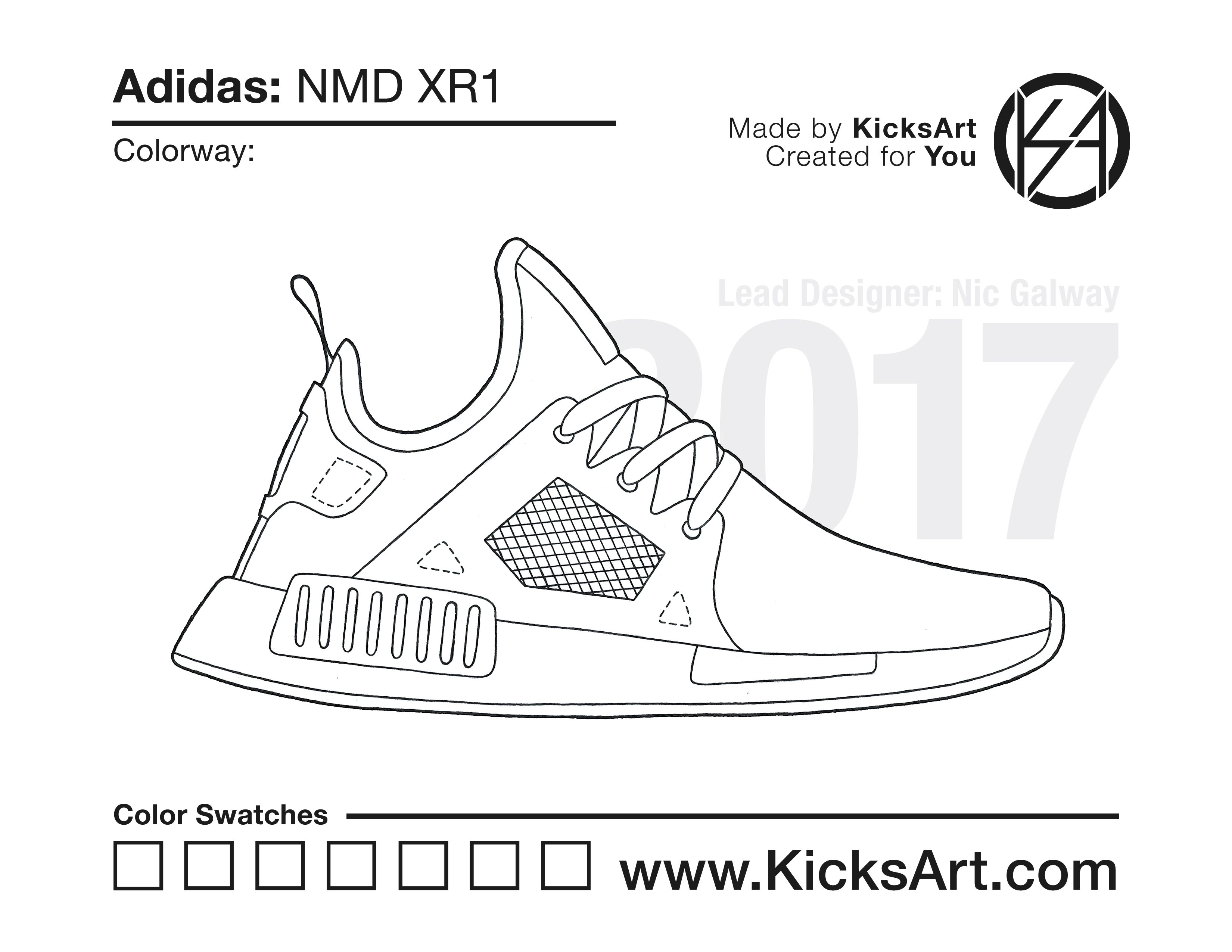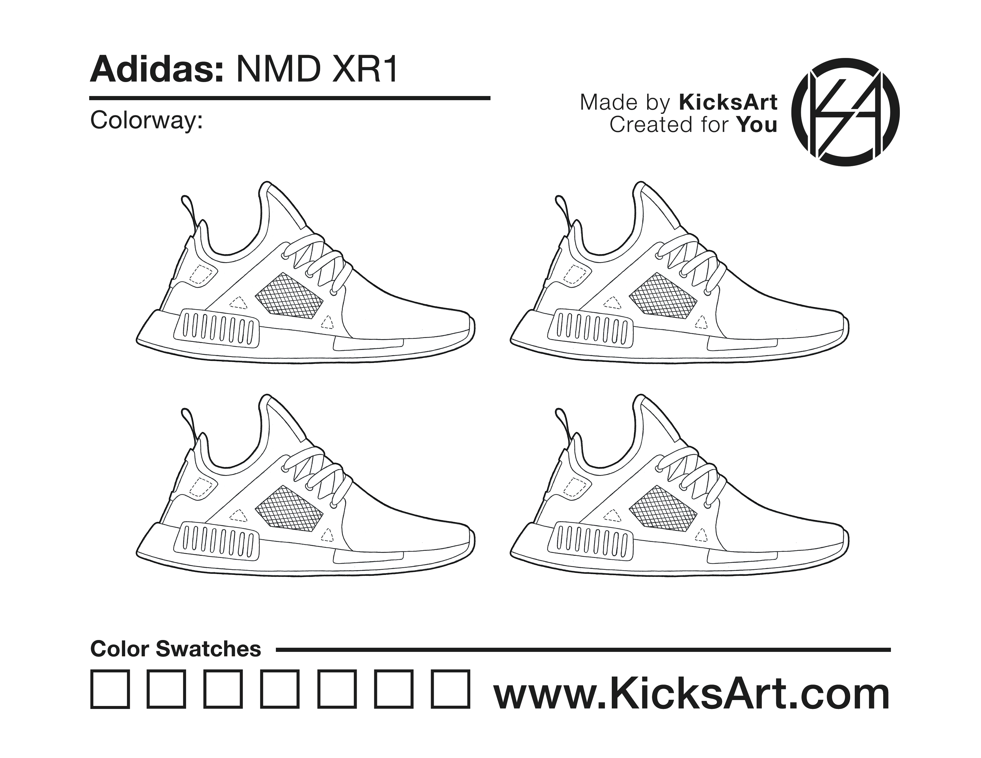 Adidas NMD XR1 Sneaker Coloring Pages March 15, 2019 kicksart05 For any sneaker coloring page, click on the button above the image to start the instant download! FREE Download: Adidas NMD XR1 Art materials can be expensive!Try out colorways on these smaller templates so your supplies can last longer! Adidas NMD XR1 (4UP)