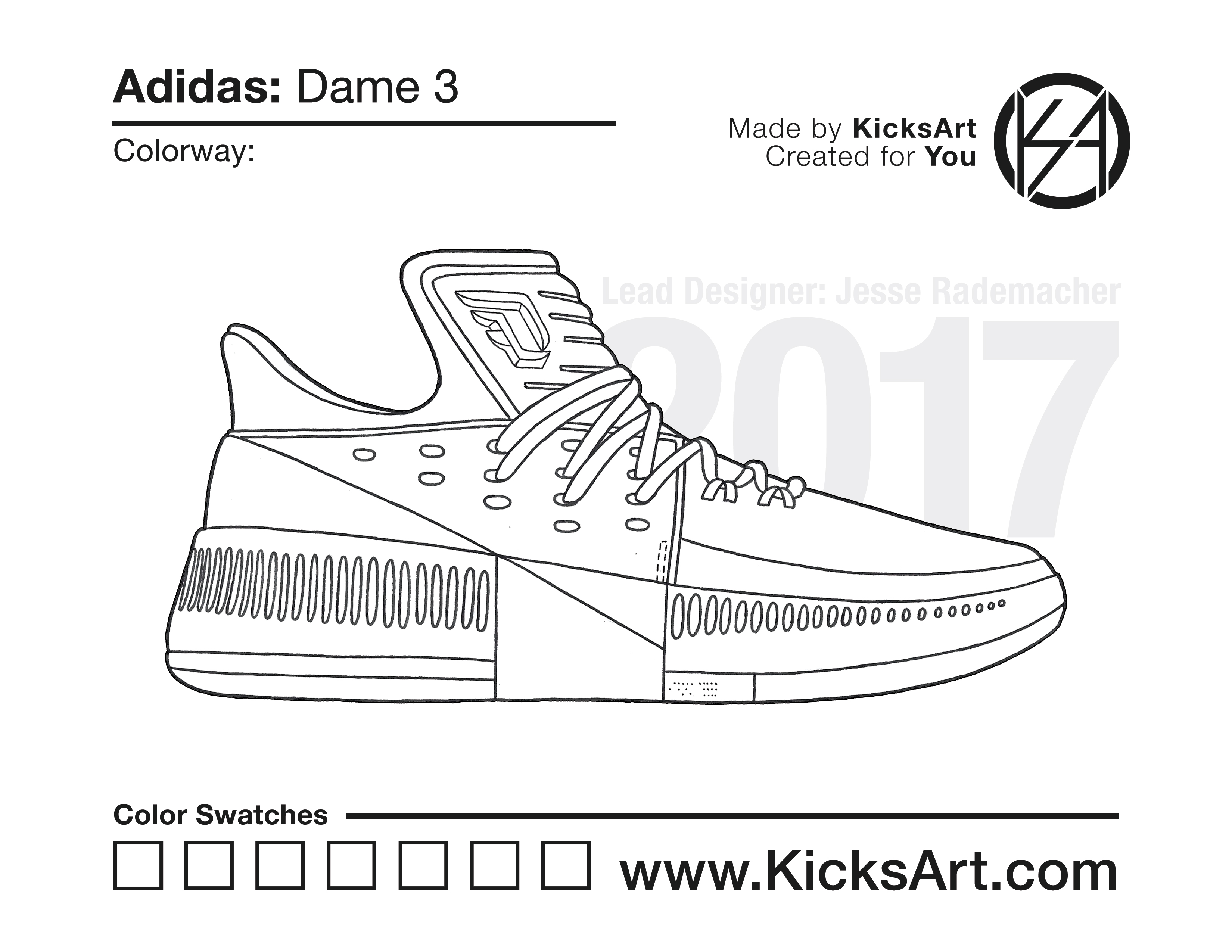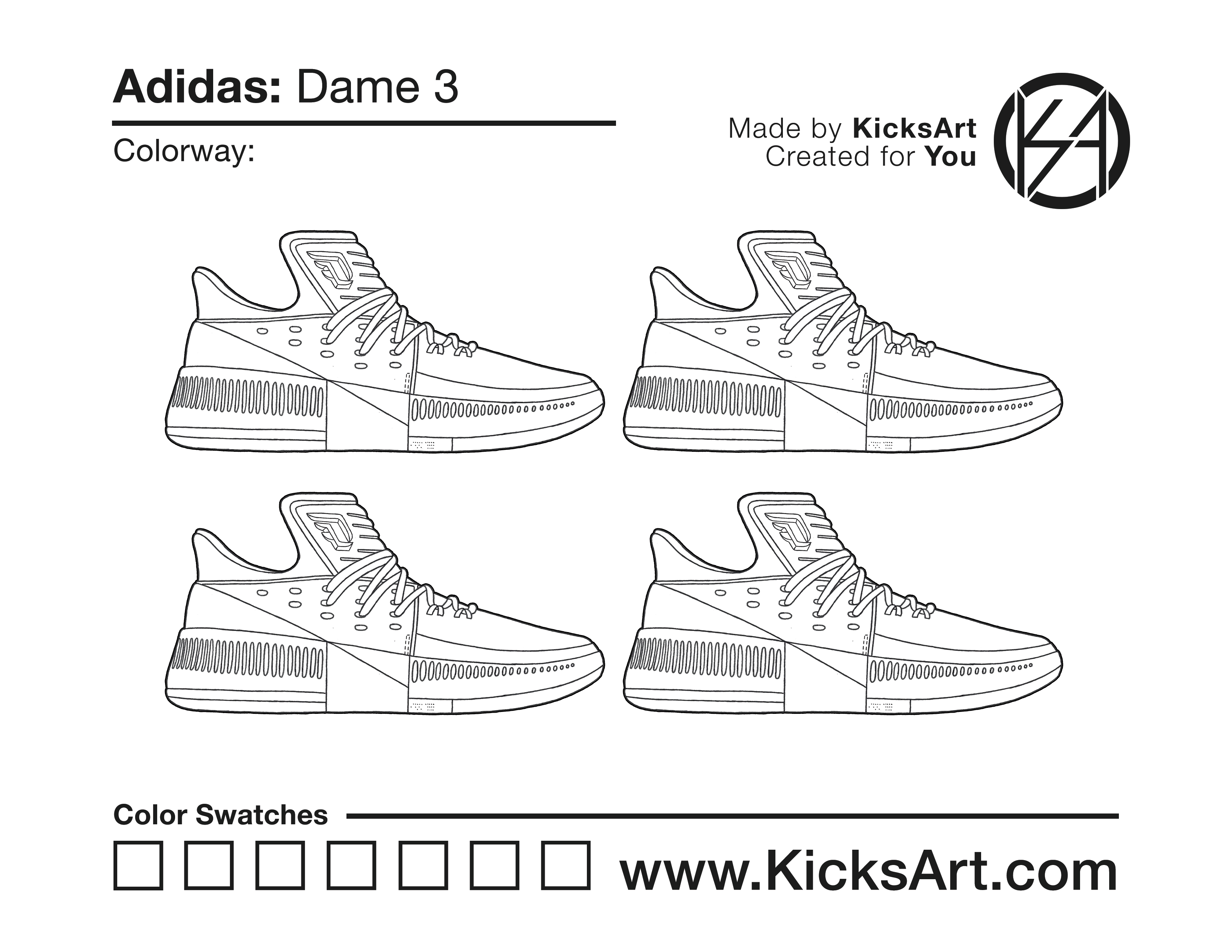 Adidas Dame 3 Sneaker Coloring Pages February 26, 2019 kicksart05 For any sneaker coloring page, click on the button above the image to start the instant download! FREE Download: Adidas Dame 3 Art materials can be expensive!Try out colorways on these smaller templates so your supplies can last longer! Adidas Dame 3 (4UP)