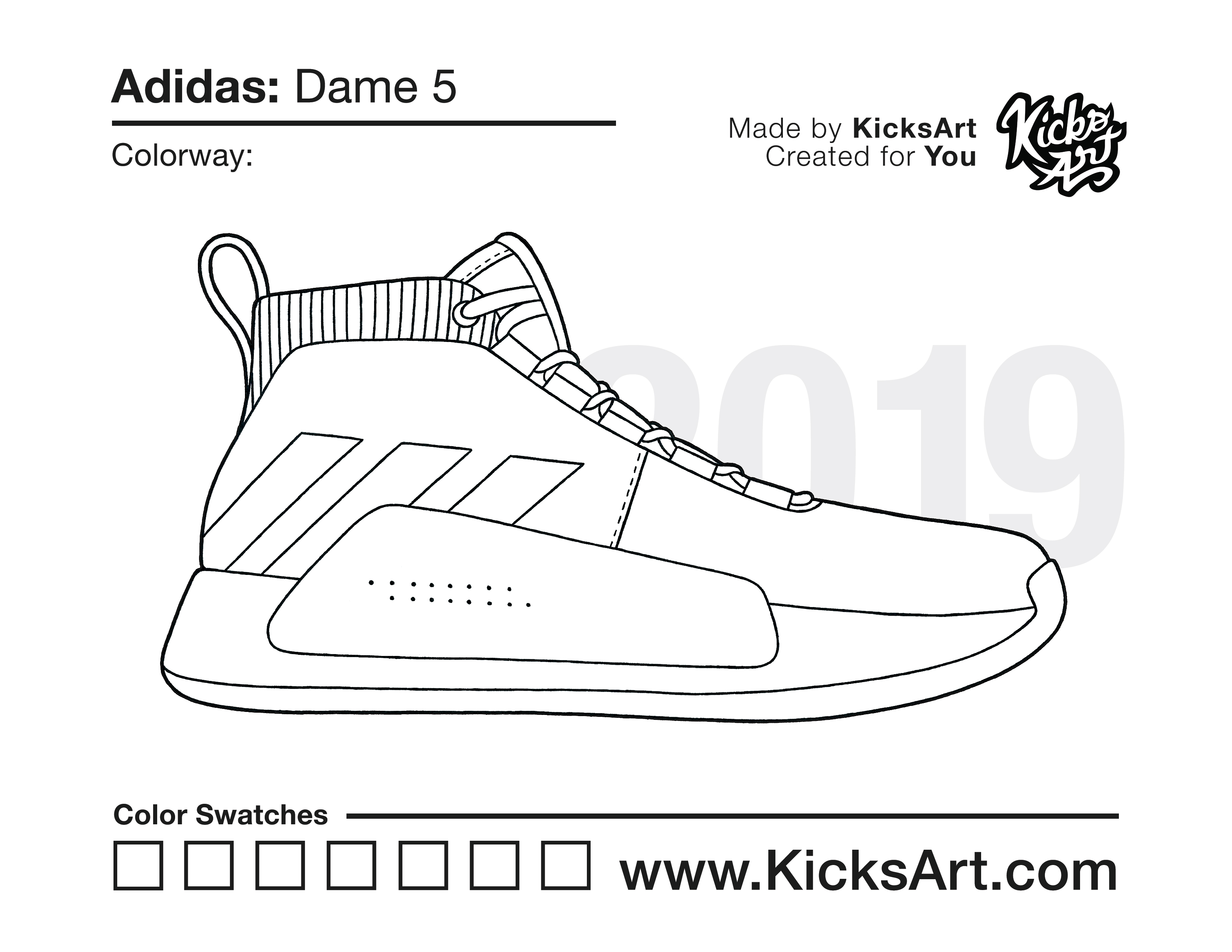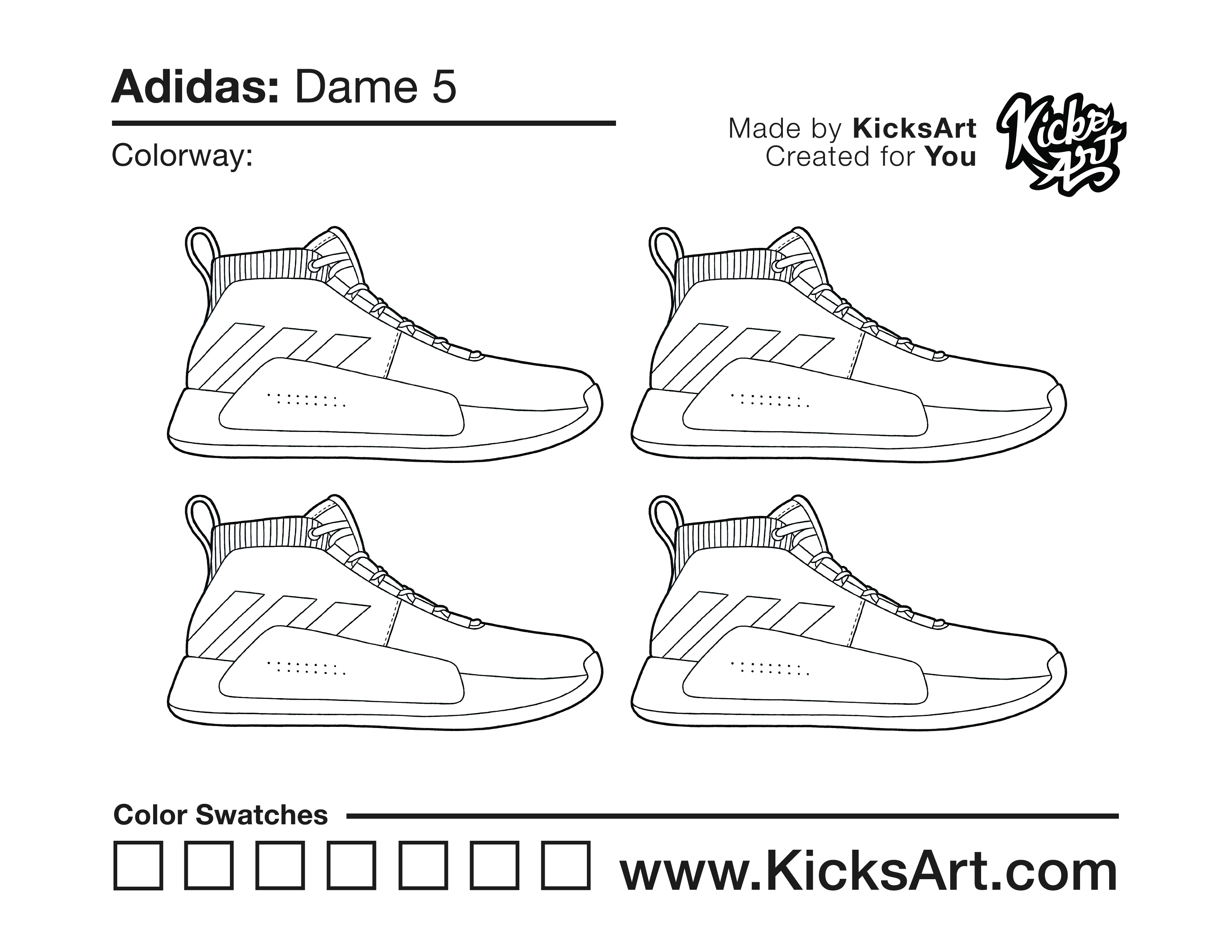 Adidas Dame 5 Sneaker Coloring Pages October 21, 2020 kicksart05 For any sneaker coloring page, click on the button above the image to start the instant download! FREE Download: Adidas Dame 5 Art materials can be expensive!Try out colorways on these smaller templates so your supplies can last longer! Adidas Dame 5 (4UP)