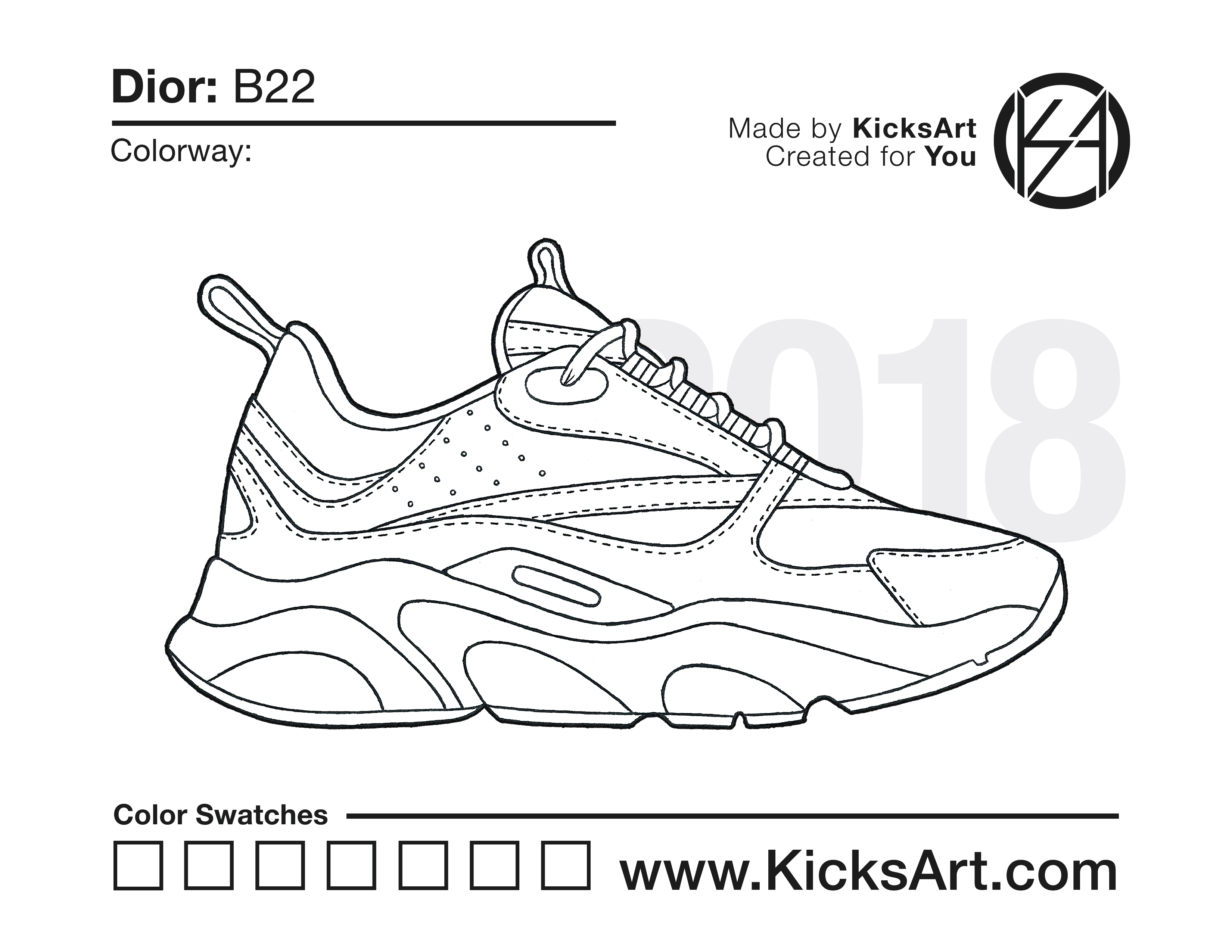 Dior B22 Sneaker Coloring Pages March 17, 2019 kicksart05 For any sneaker coloring page, click on the button above the image to start the instant download! FREE Download: Dior B22 Art materials can be expensive!Try out colorways on these smaller templates so your supplies can last longer! Dior B22 (4UP)