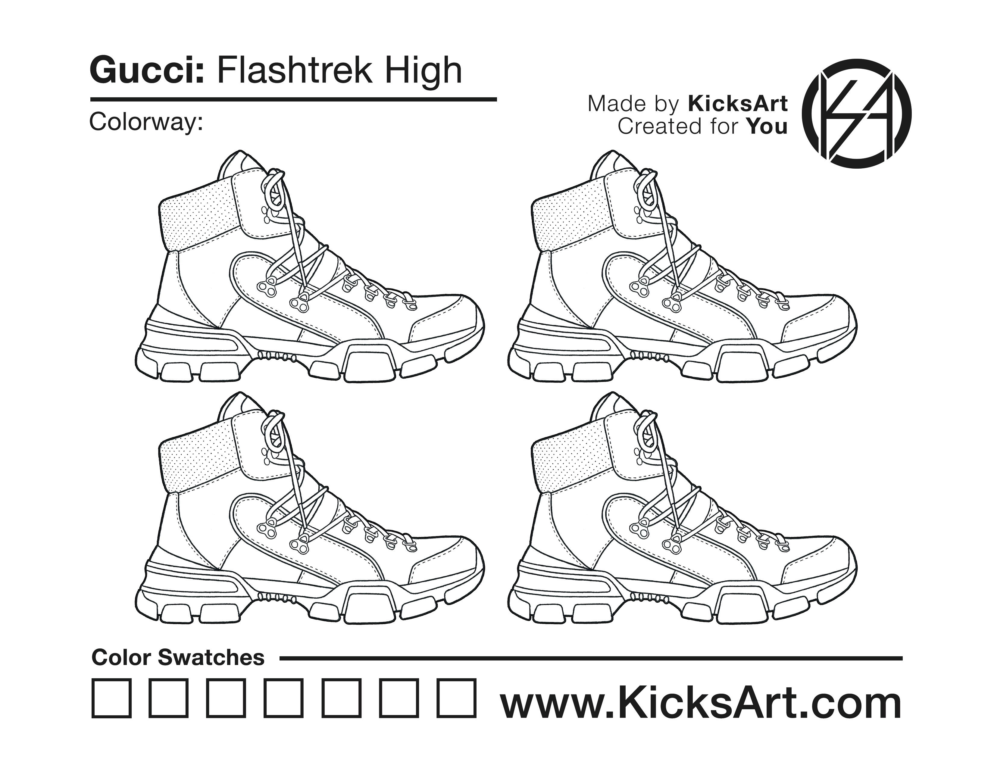 Gucci Flashtrek High Sneaker Coloring Pages March 17, 2019 kicksart05 For any sneaker coloring page, click on the button above the image to start the instant download! FREE Download: Gucci Flashtrek High Art materials can be expensive!Try out colorways on these smaller templates so your supplies can last longer! Gucci Flashtrek High (4UP)
