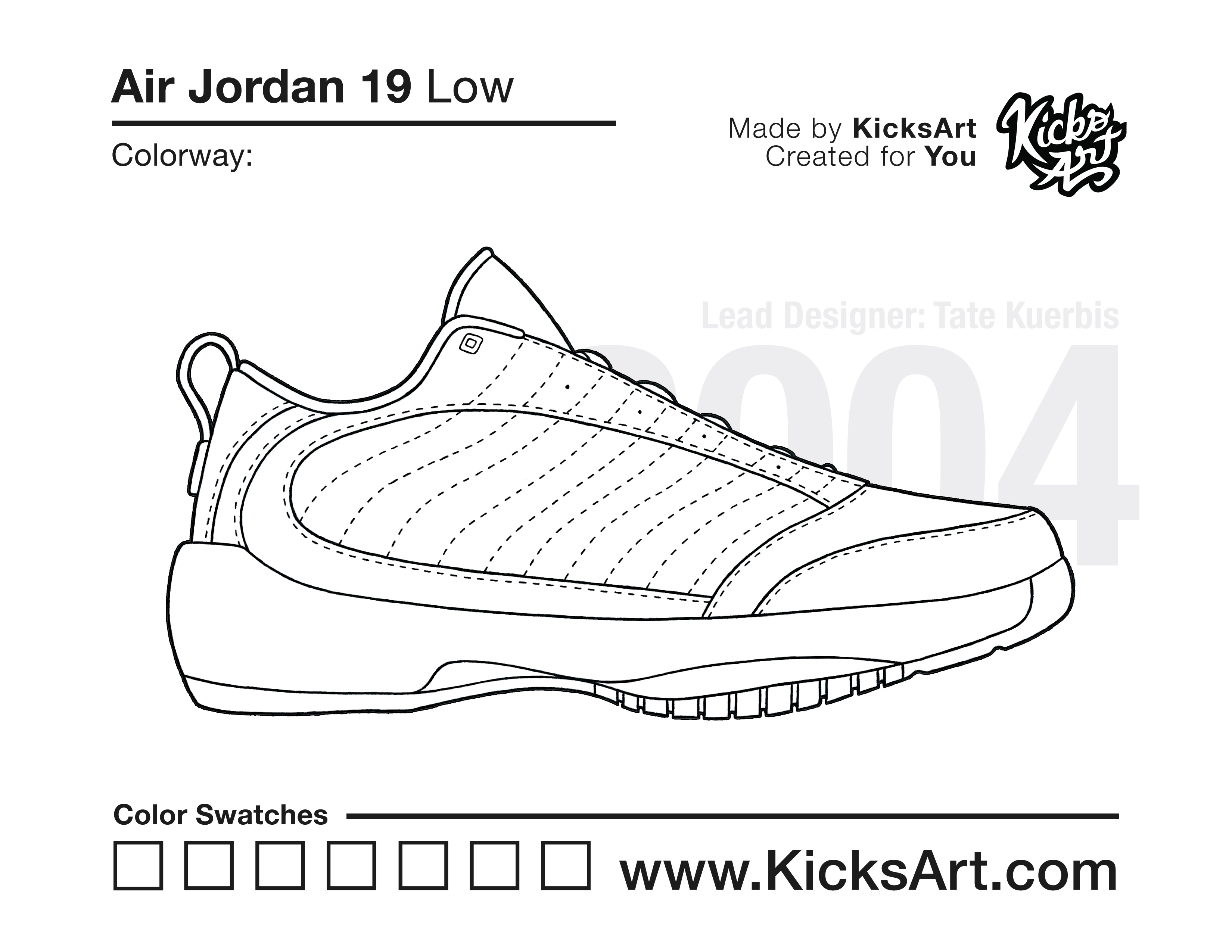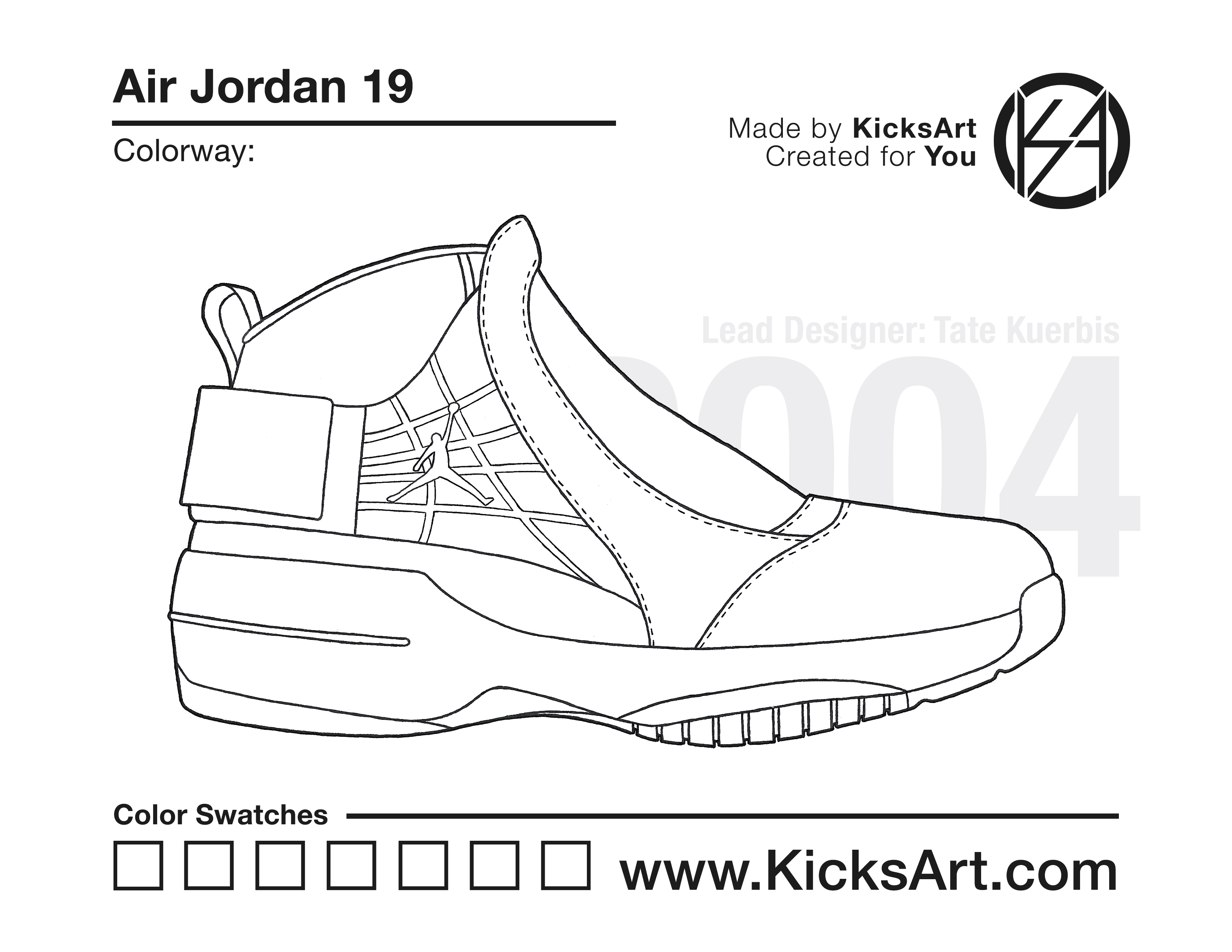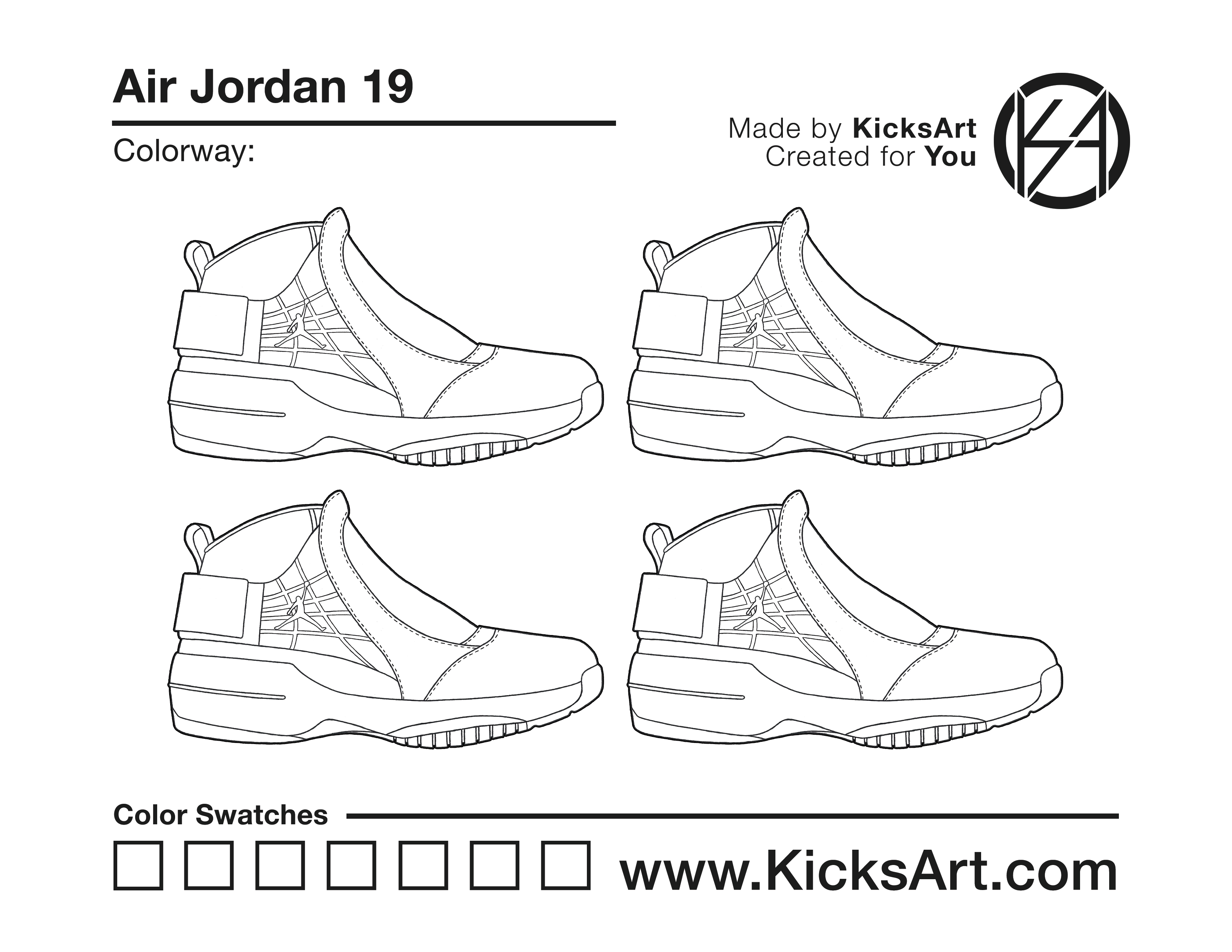 Air Jordan 19 Sneaker Coloring Pages March 10, 2019 kicksart05 For any sneaker coloring page, click on the button above the image to start the instant download! FREE Download: Air Jordan 19 Art materials can be expensive!Try out colorways on these smaller templates so your supplies can last longer! Air Jordan 19 (4UP) Air Jordan 19 (Drawing Guide) Drawing Guide (Page 2) Additional Variants Air Jordan 19 Low XX