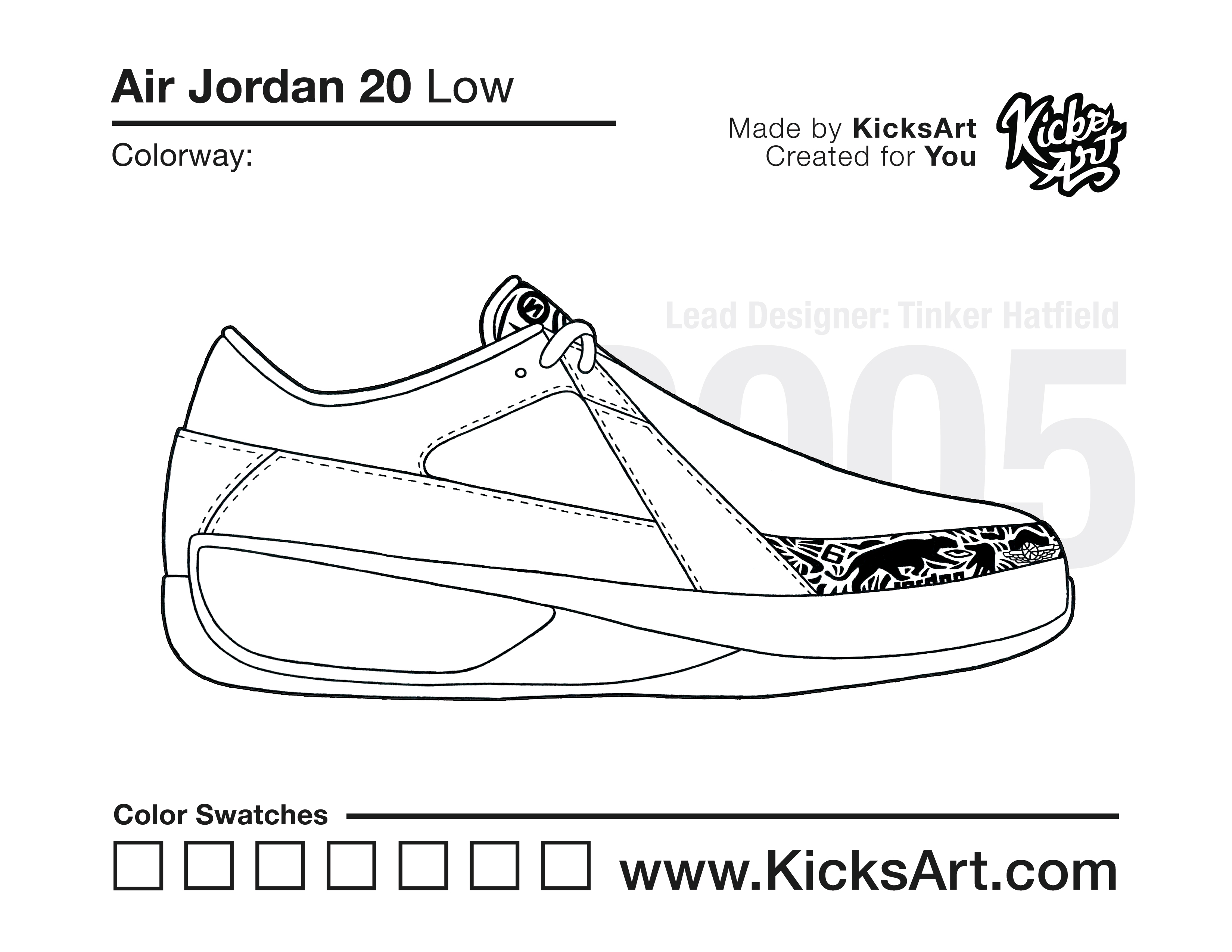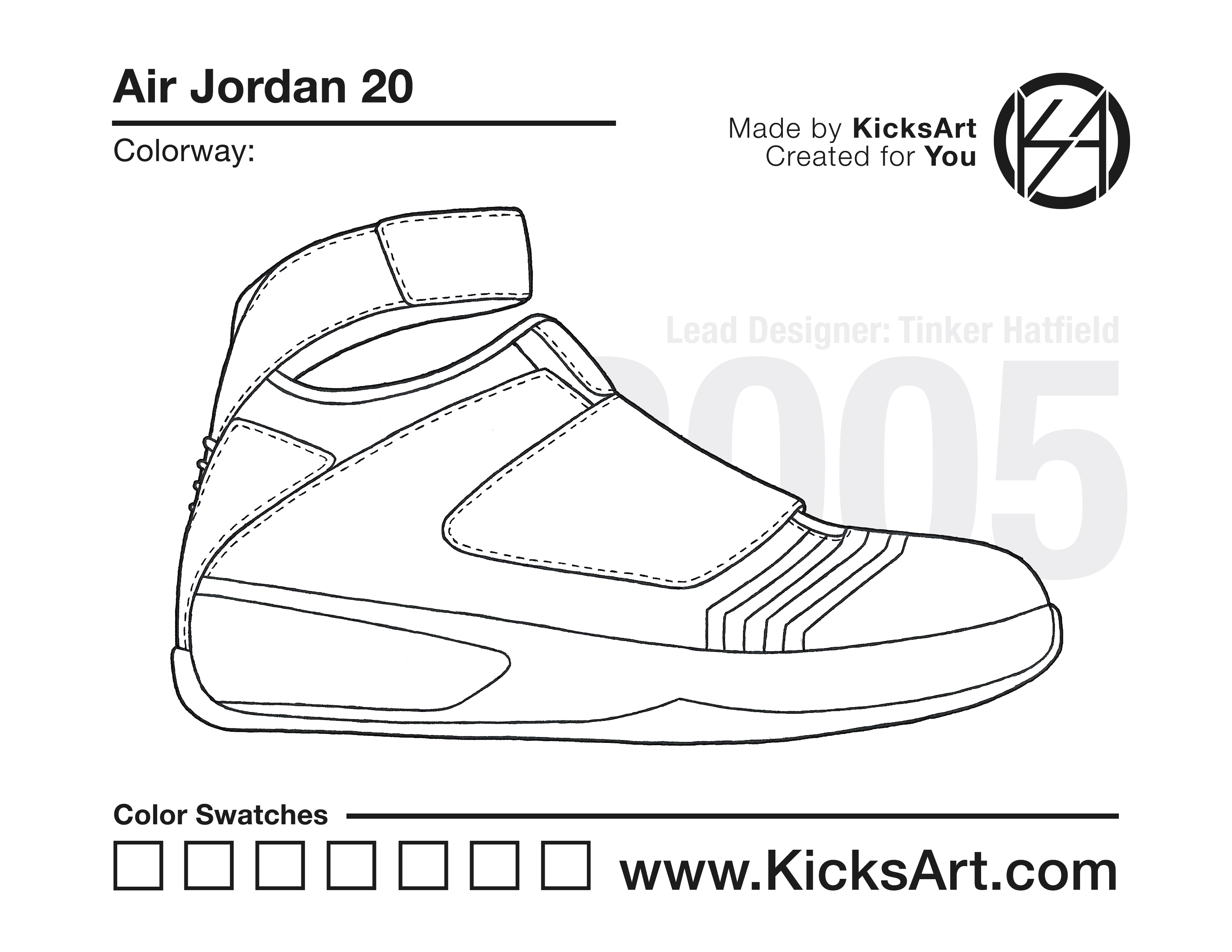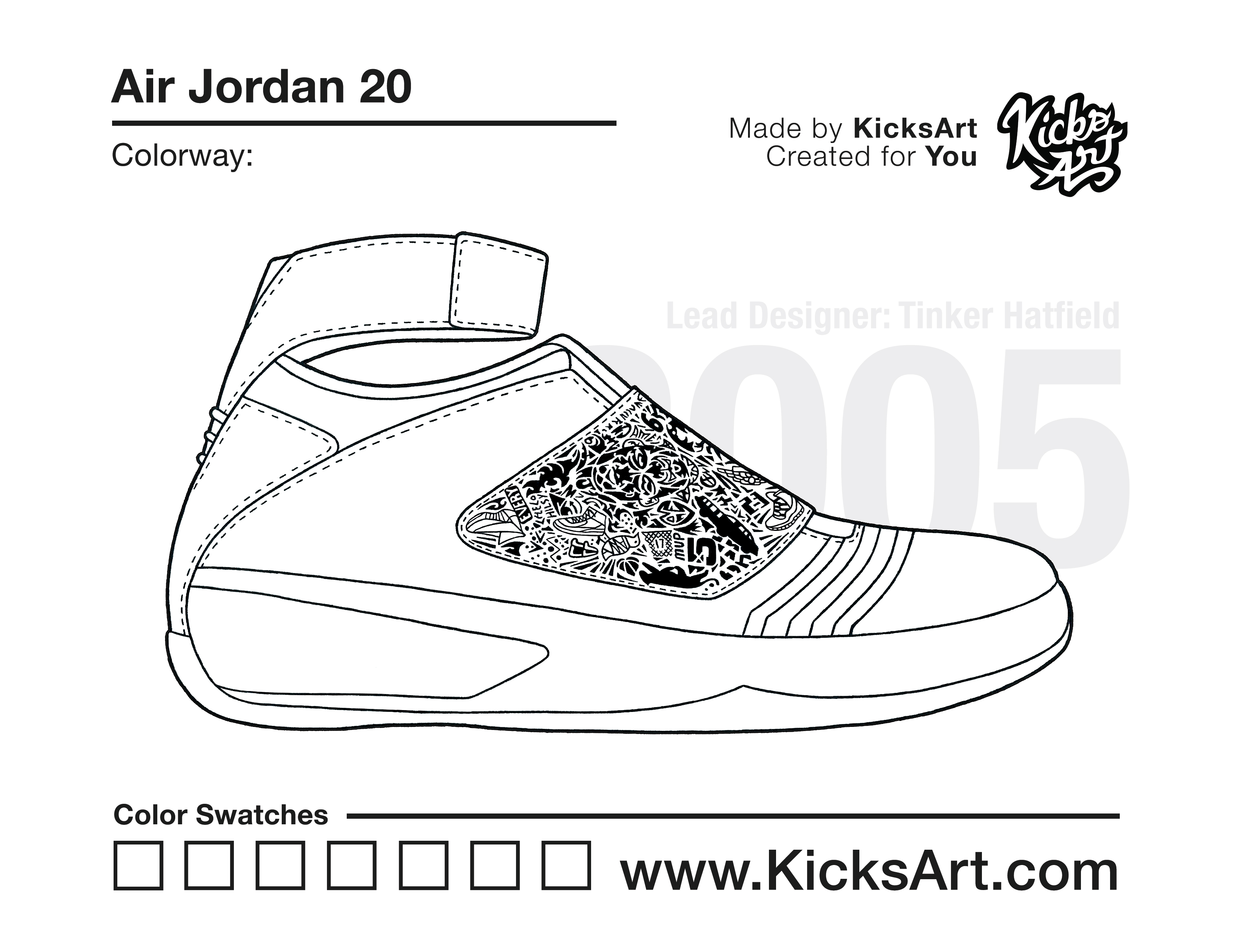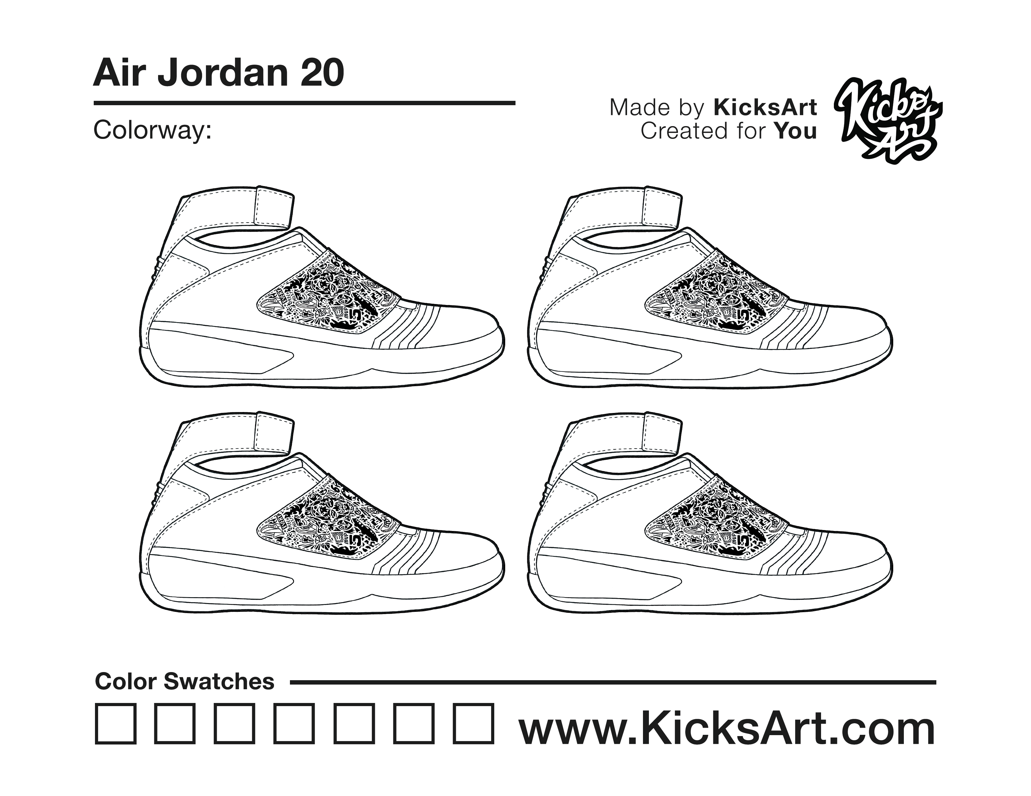 Air Jordan 20 Sneaker Coloring Pages March 10, 2019 kicksart05 For any sneaker coloring page, click on the button above the image to start the instant download! FREE Download: Air Jordan 20 Art materials can be expensive!Try out colorways on these smaller templates so your supplies can last longer! Air Jordan 20 (4UP) Air Jordan 20 (Drawing Guide) Drawing Guide (Page 2) Additional Variants Air Jordan 20 Low Air Jordan 20 (White Strap)