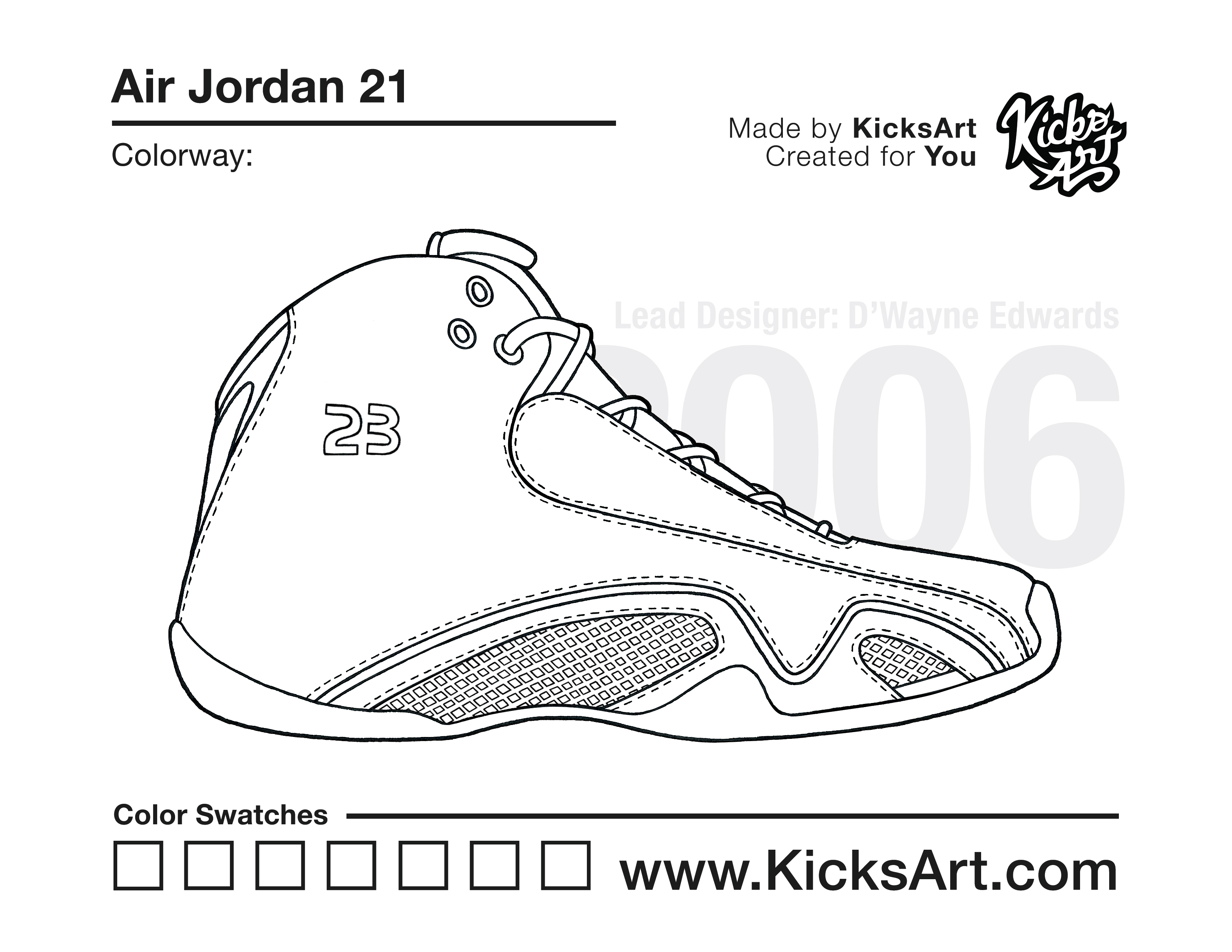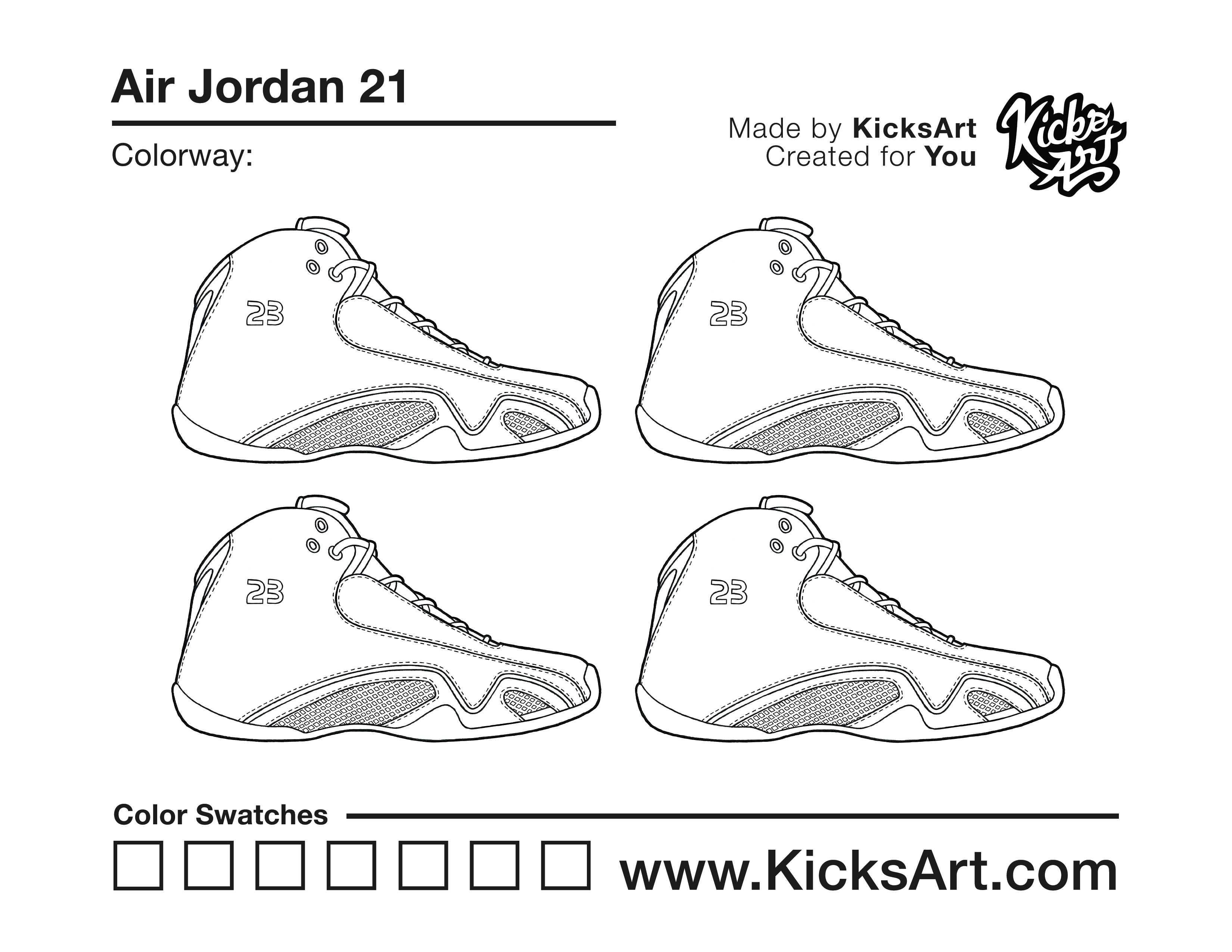 Air Jordan 21 Sneaker Coloring Pages March 10, 2019 kicksart05 For any sneaker coloring page, click on the button above the image to start the instant download! FREE Download: Air Jordan 21 Art materials can be expensive!Try out colorways on these smaller templates so your supplies can last longer! Air Jordan 21 (4UP) Air Jordan 21 (Drawing Guide) Drawing Guide (Page 2) Additional Variants Air Jordan 21 Low