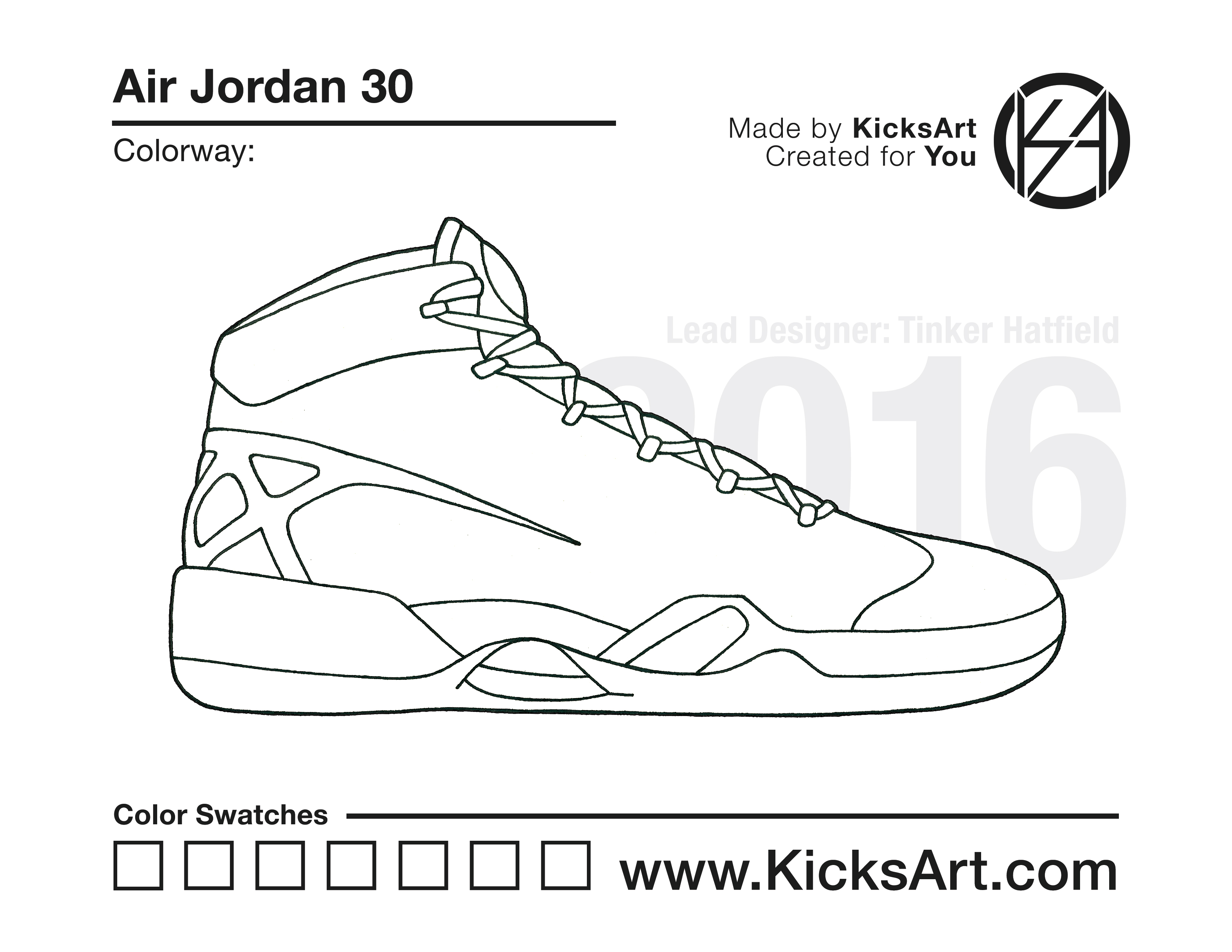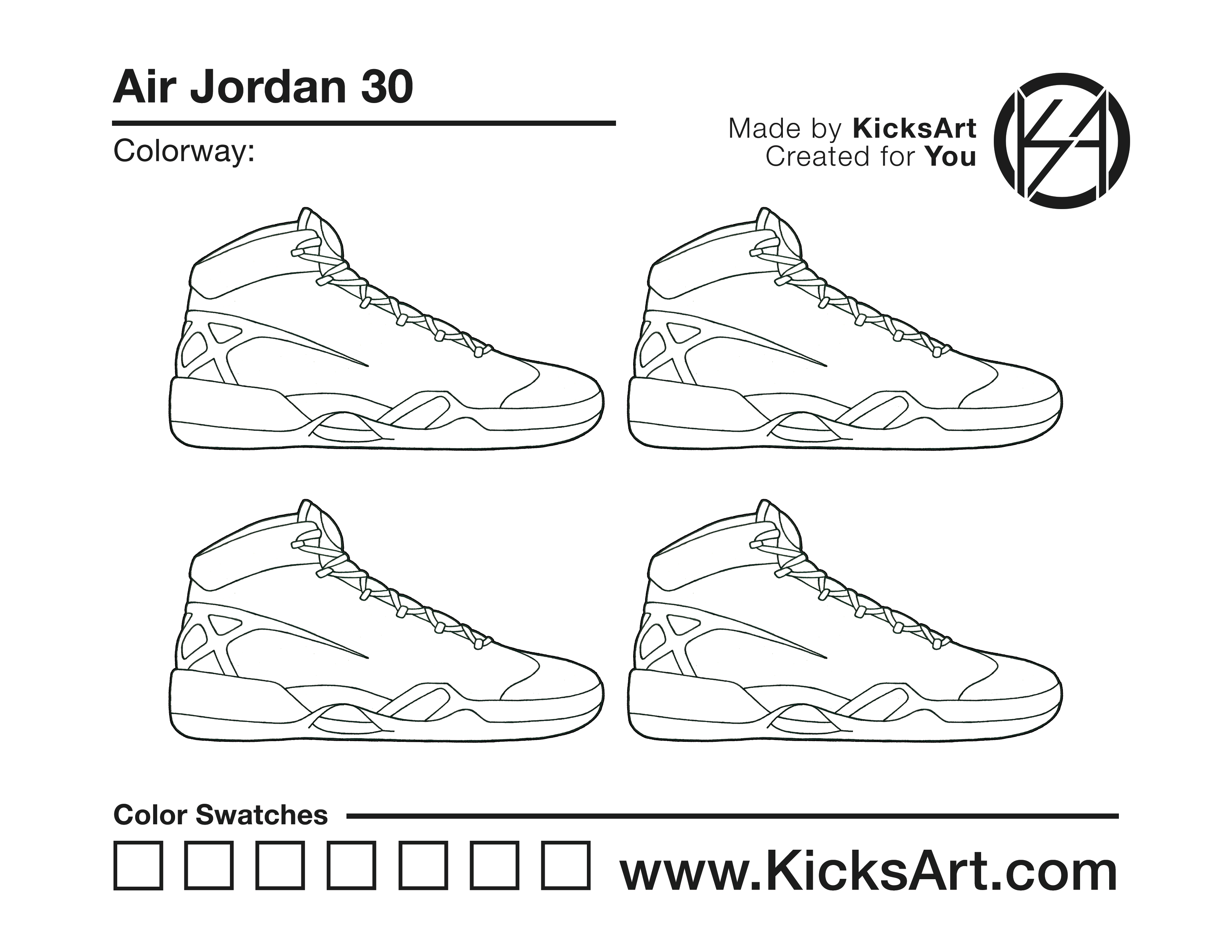 Air Jordan 30 Sneaker Coloring Page March 10, 2019 kicksart05 For any sneaker coloring page, click on the button above the image to start the instant download! FREE Download: Air Jordan 30 Art materials can be expensive!Try out colorways on these smaller templates so your supplies can last longer! Air Jordan 30 (4UP)