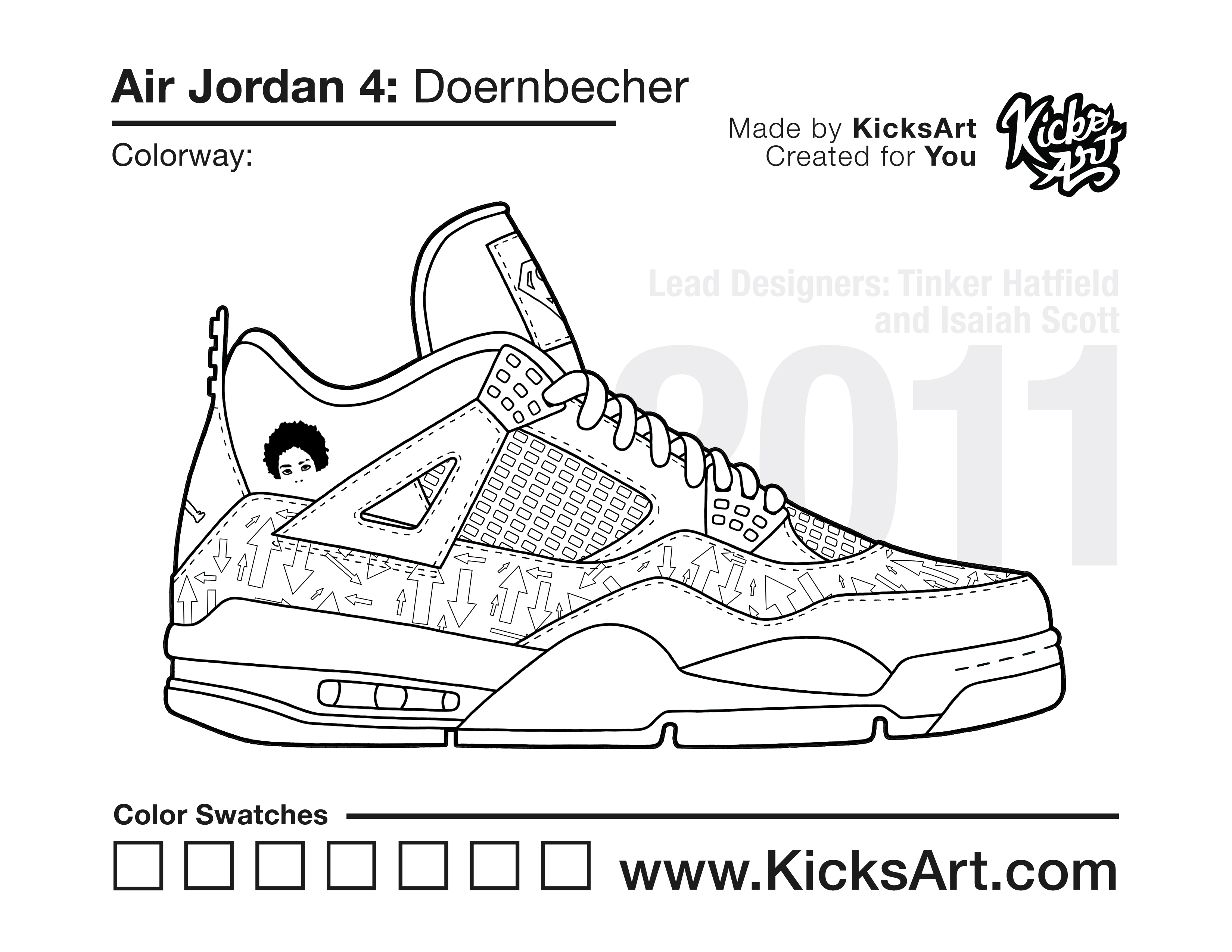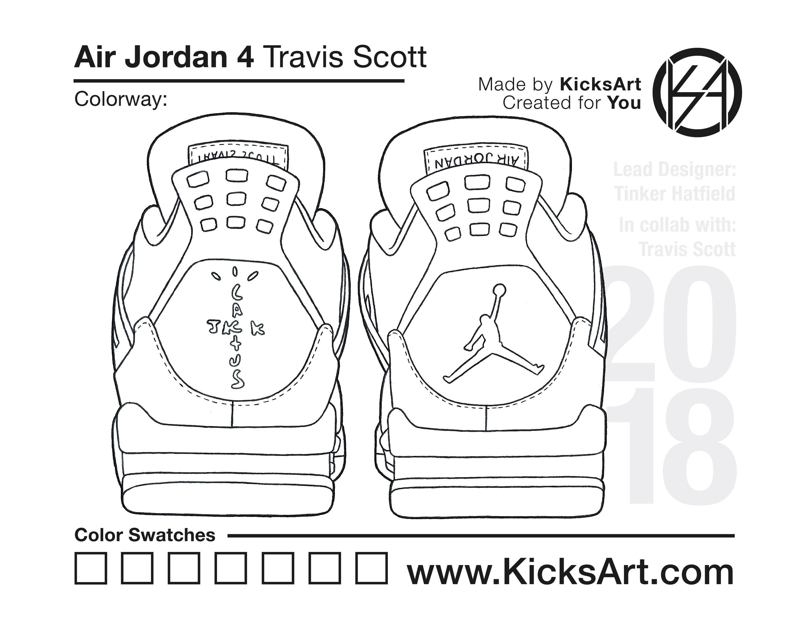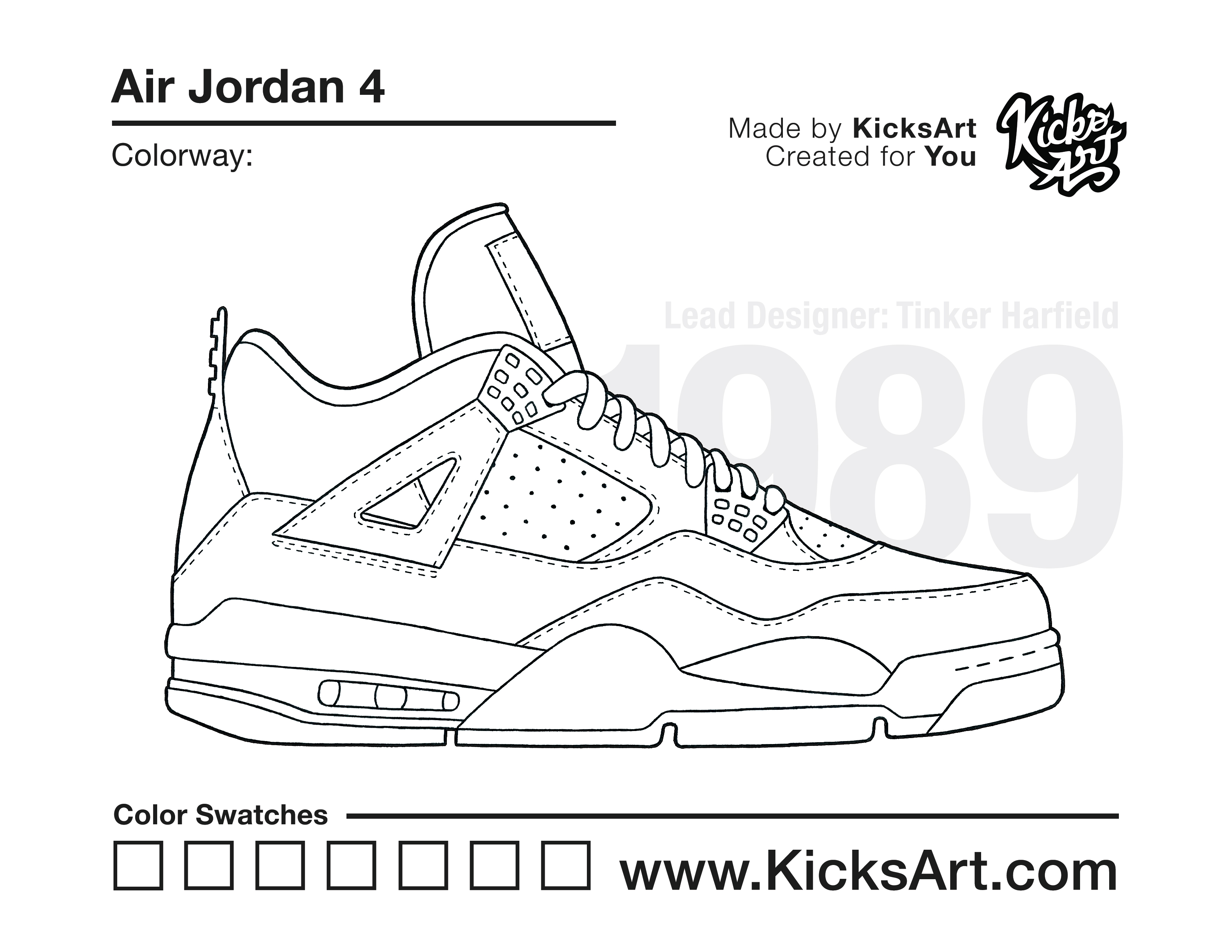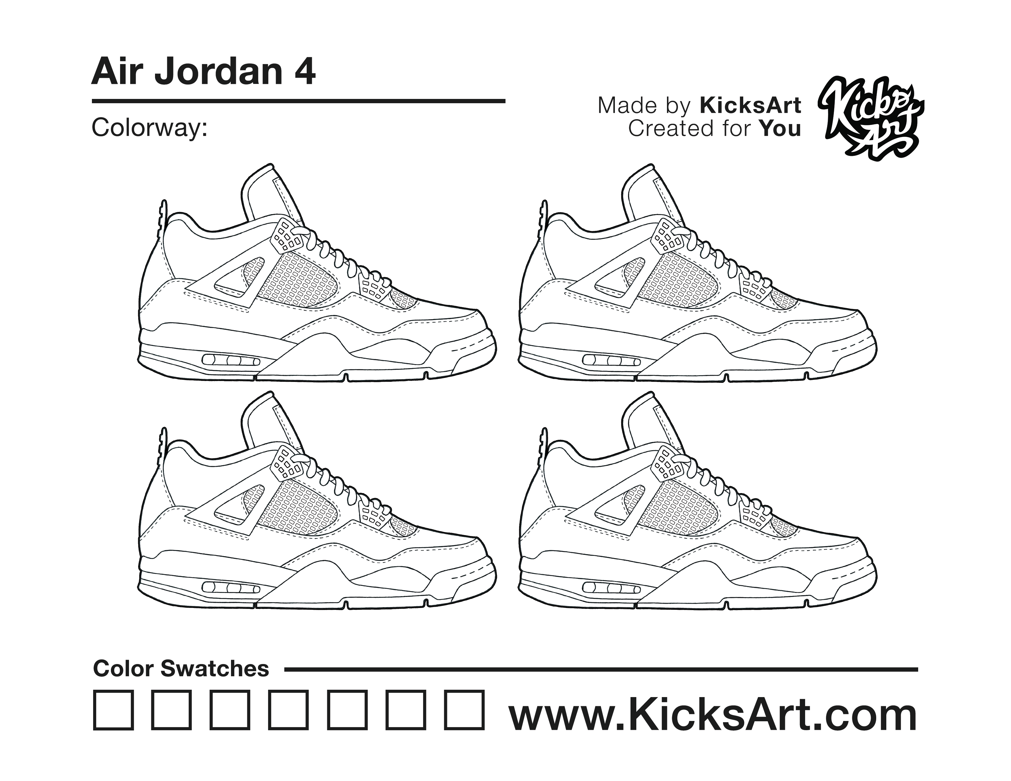 Air Jordan 4 Sneaker Coloring Pages March 10, 2019 kicksart05 For any sneaker coloring page, click on the button above the image to start the instant download! FREE Download: Air Jordan 4 Art materials can be expensive!Try out colorways on these smaller templates so your supplies can last longer! Air Jordan 4 (4UP) Air Jordan 4 (Drawing Guide) Drawing Guide (Page 2) Additional Variants Air Jordan 4 (2) Air Jordan 4 Leather Air Jordan 4 Travis Scott (Rear) Air Jordan 4 Doernbecher