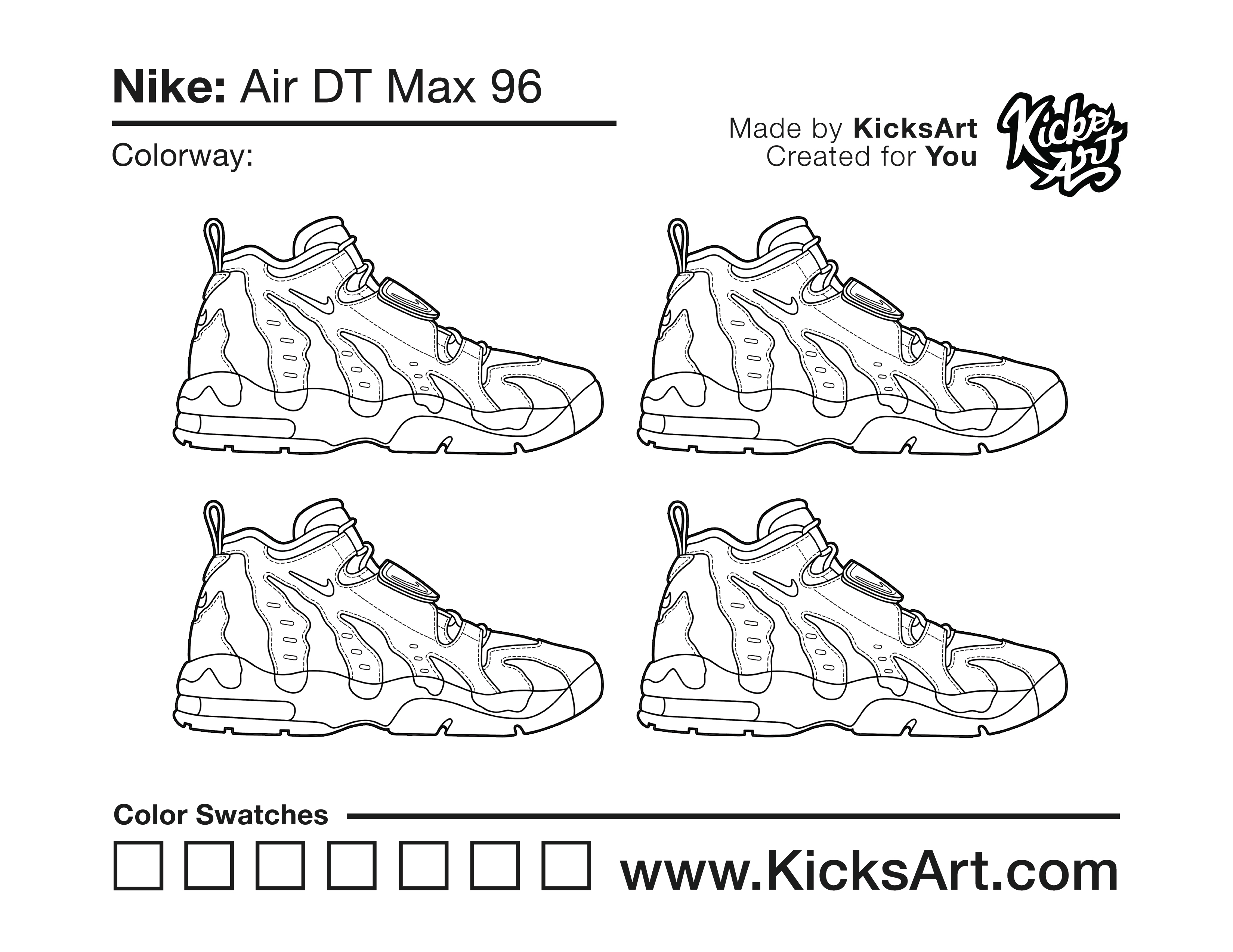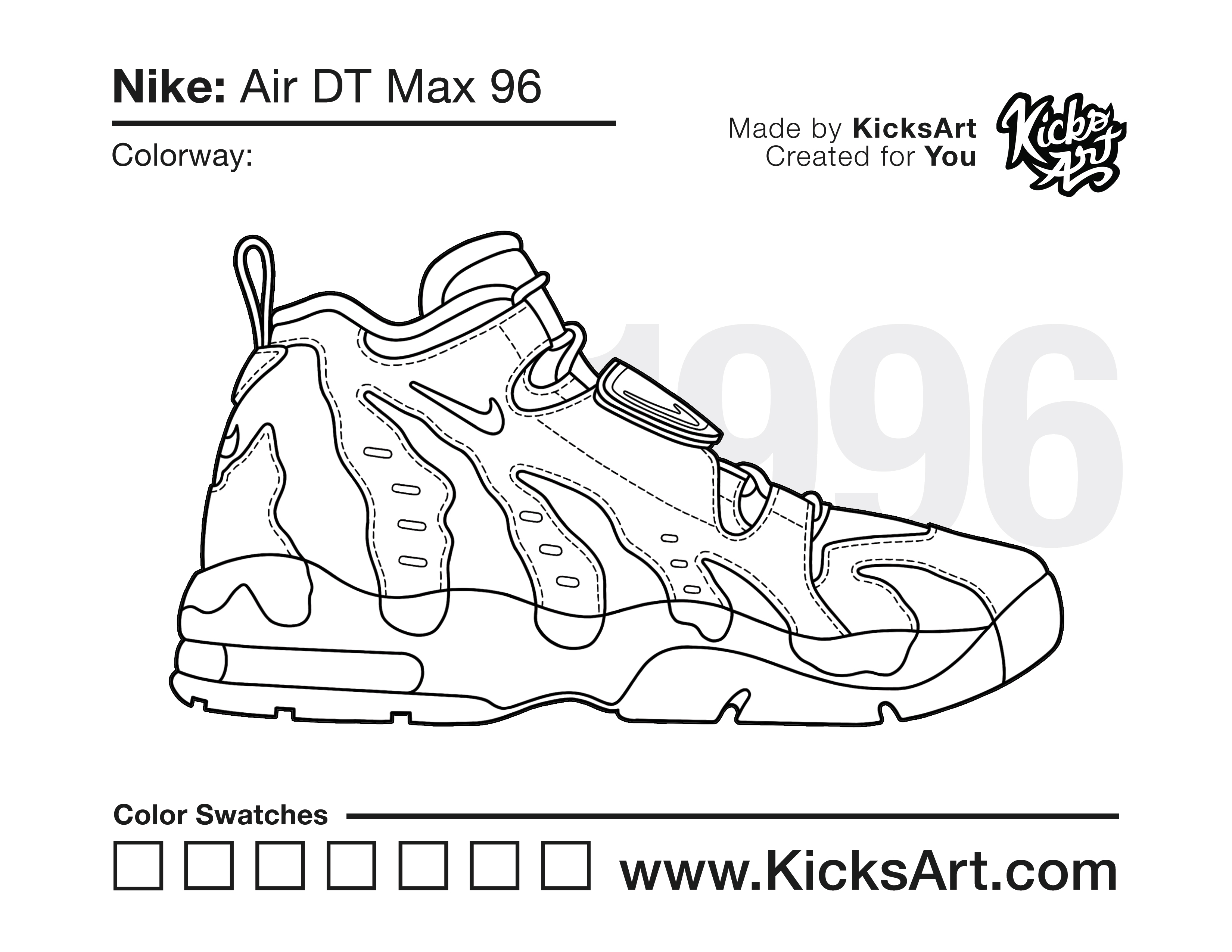 Nike Air DT Max 96 Sneaker Coloring Pages July 24, 2021 kicksart05 For any sneaker coloring page, click on the button above the image to start the instant download! FREE Download: Nike Air DT Max 96 Art materials can be expensive!Try out colorways on these smaller templates so your supplies can last longer! Nike Air DT Max 96 (4UP)