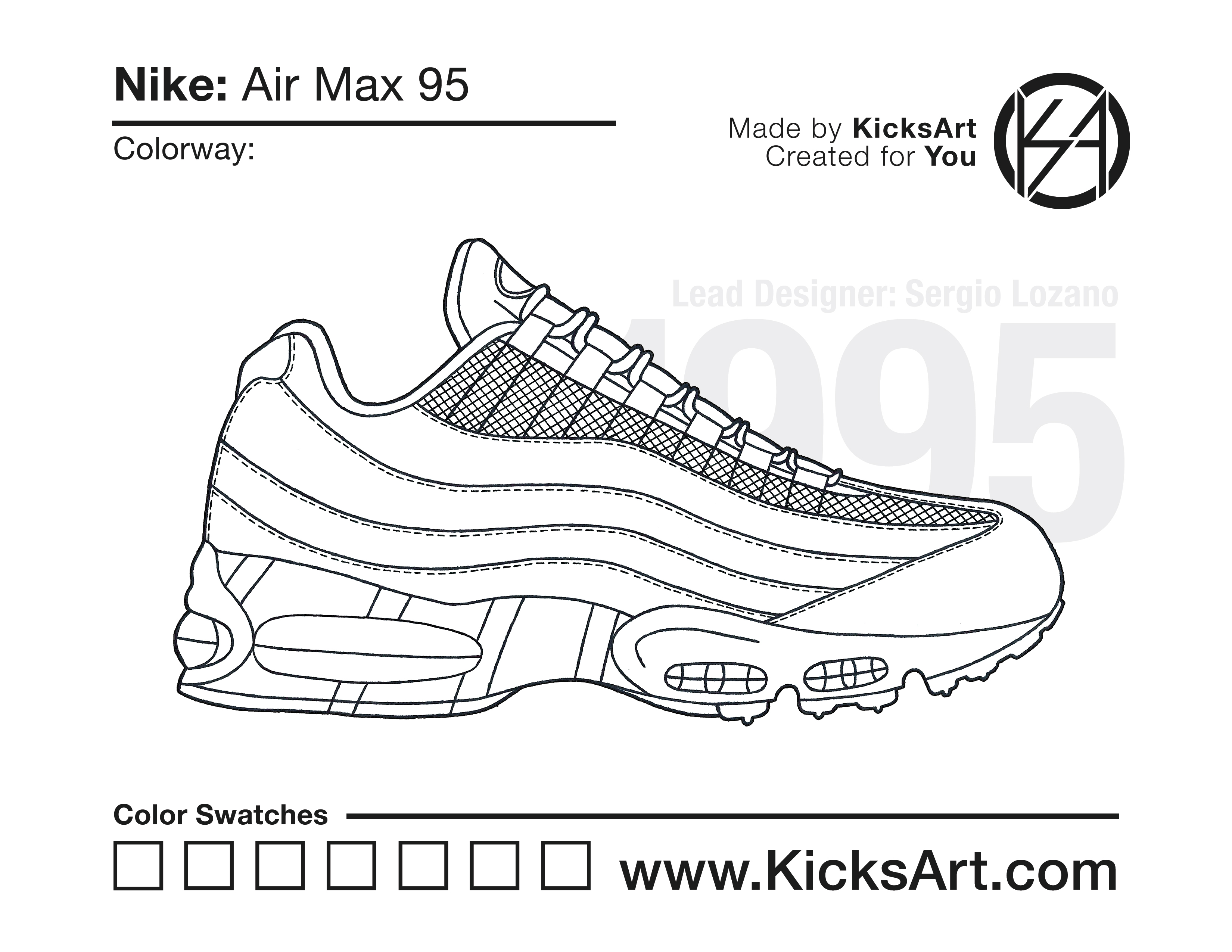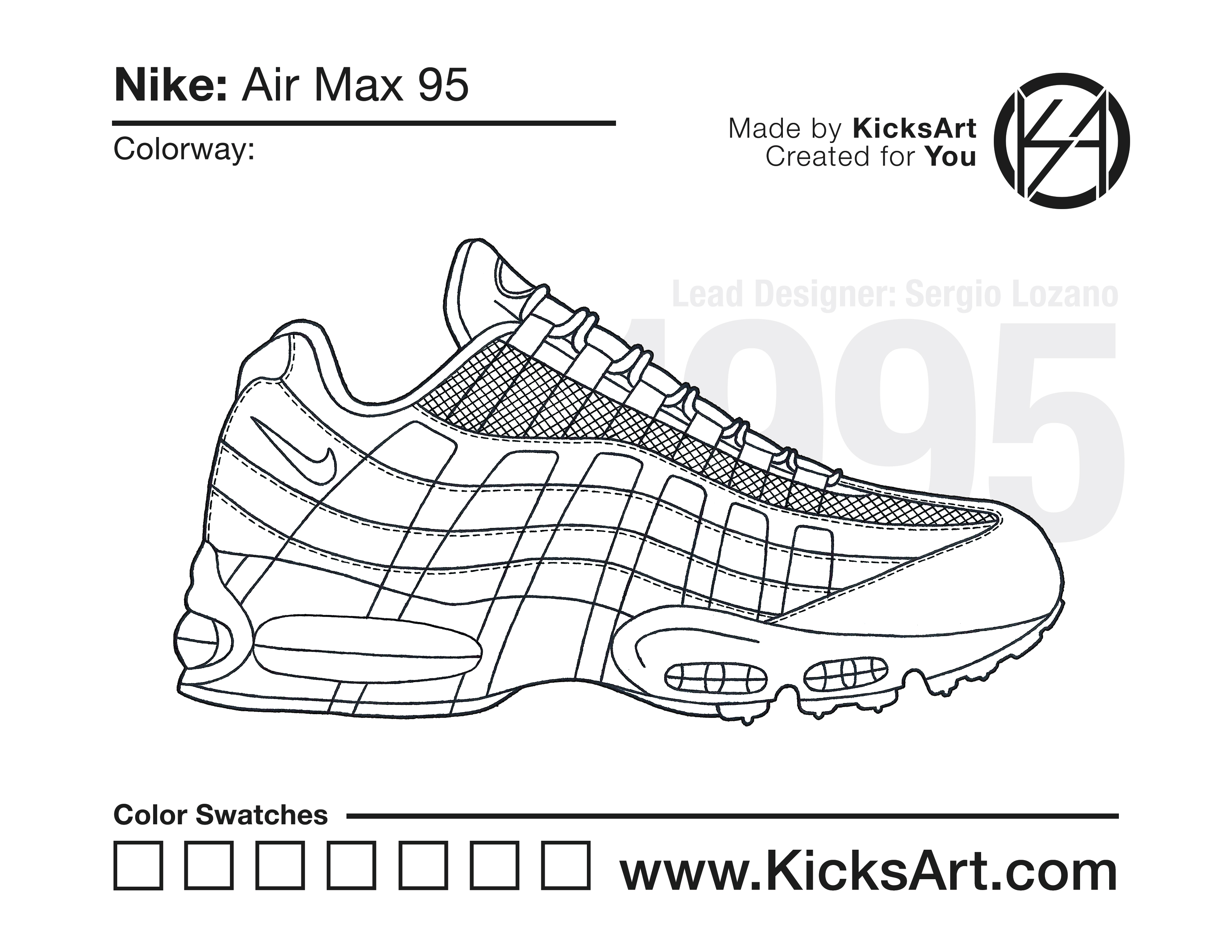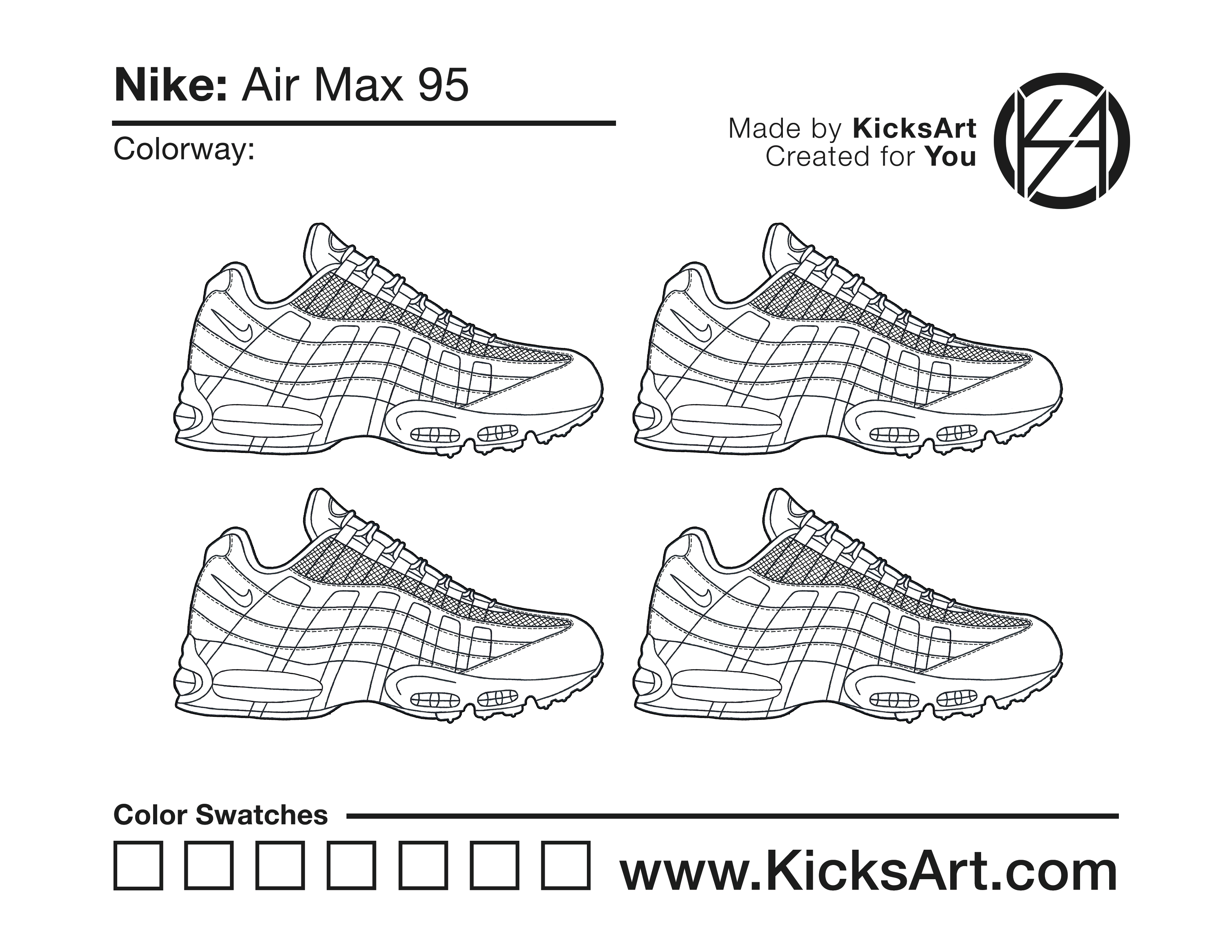 Nike Air Max 95 Sneaker Coloring Pages March 13, 2019 kicksart05 For any sneaker coloring page, click on the button above the image to start the instant download! FREE Download: Nike Air Max 95 Art materials can be expensive!Try out colorways on these smaller templates so your supplies can last longer! Nike Air Max 95 (4UP) Nike Air Max 95 (Drawing Guide) Drawing Guide (Page 2) Additional Variants Nike Air Max 95 (V2)