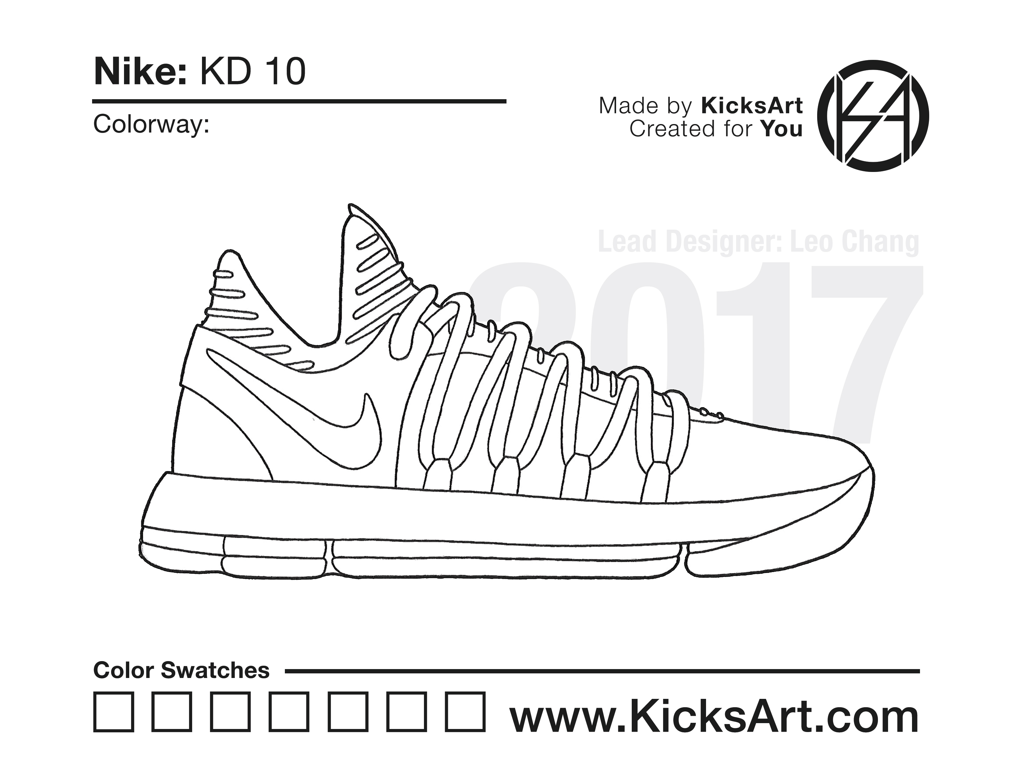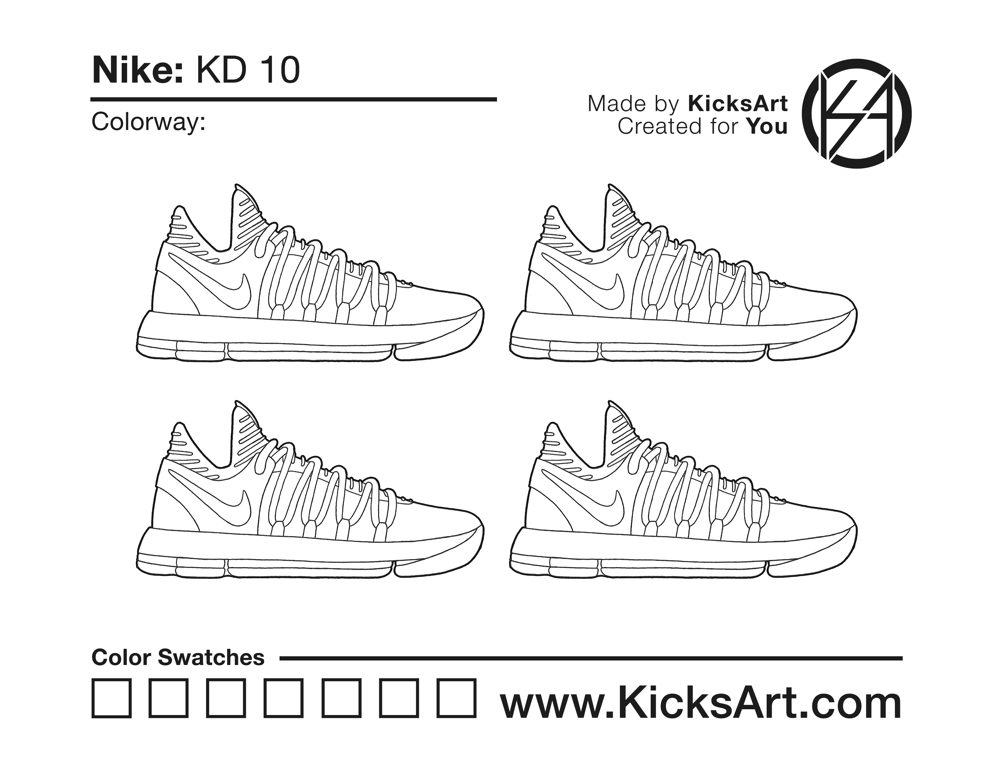 Nike KD 10 Sneaker Coloring Pages March 8, 2019 kicksart05 For any sneaker coloring page, click on the button above the image to start the instant download! FREE Download: Nike KD 10 Art materials can be expensive!Try out colorways on these smaller templates so your supplies can last longer! Nike KD 10 (4UP)