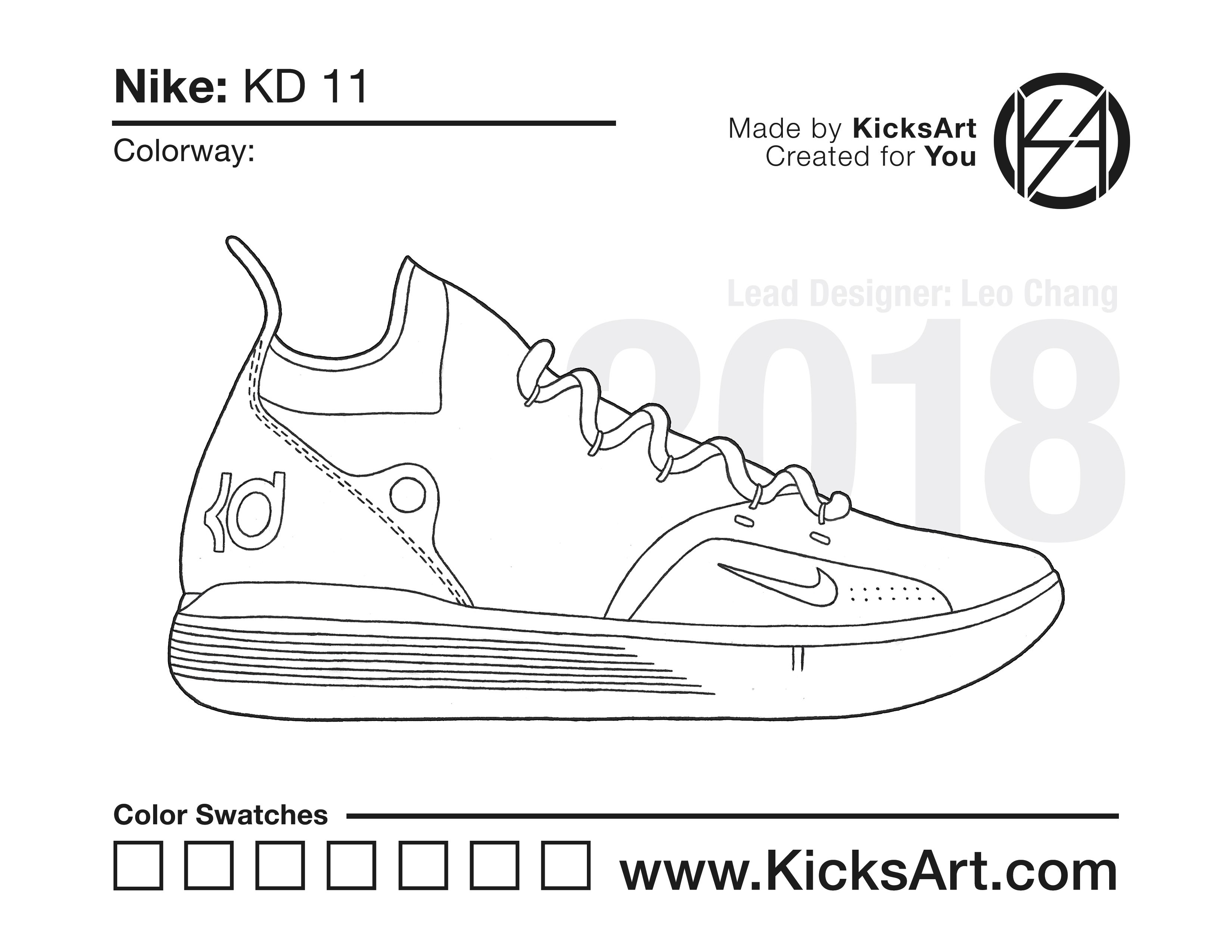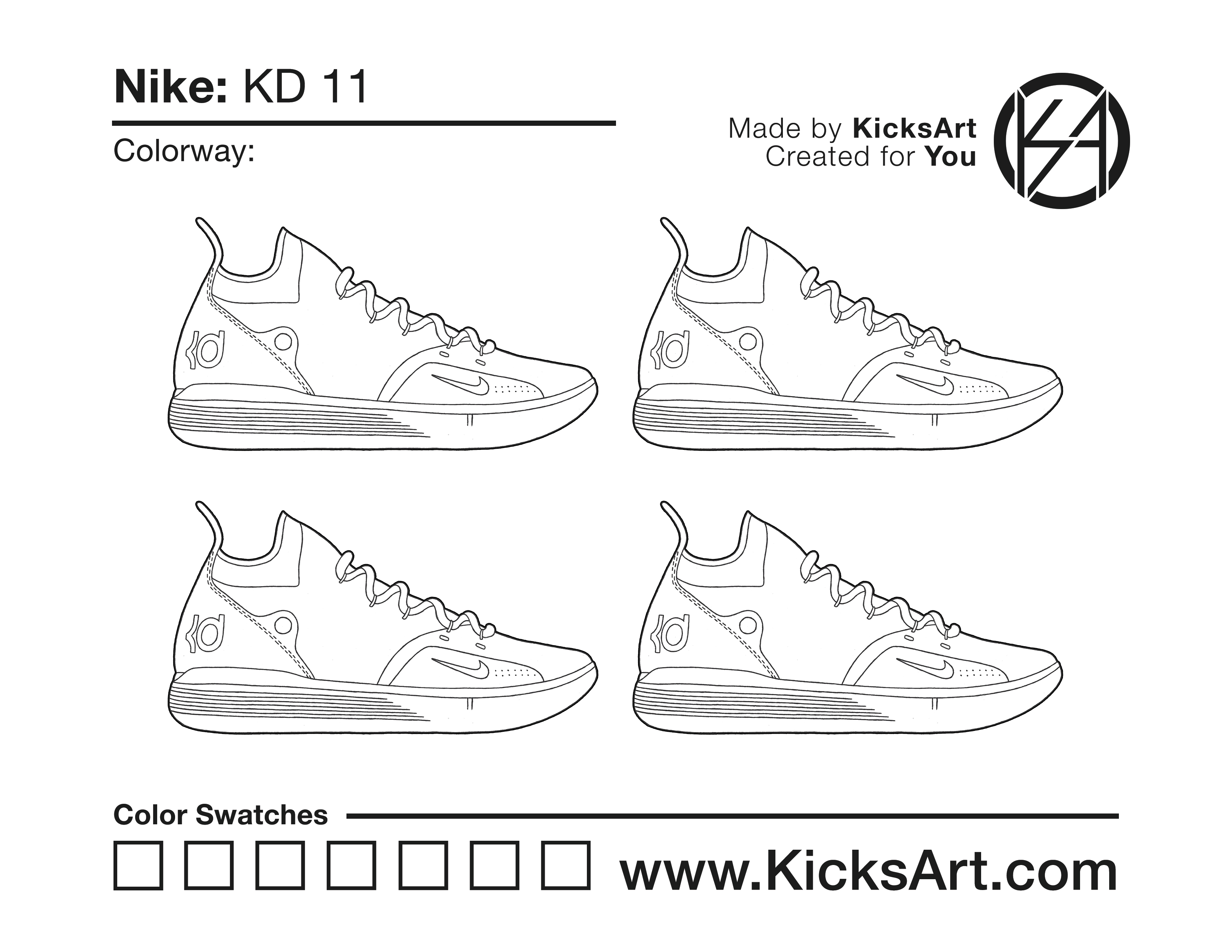 Nike KD 11 Sneaker Coloring Pages March 8, 2019 kicksart05 For any sneaker coloring page, click on the button above the image to start the instant download! FREE Download: Nike KD 11 Art materials can be expensive!Try out colorways on these smaller templates so your supplies can last longer! Nike KD 11 (4UP)