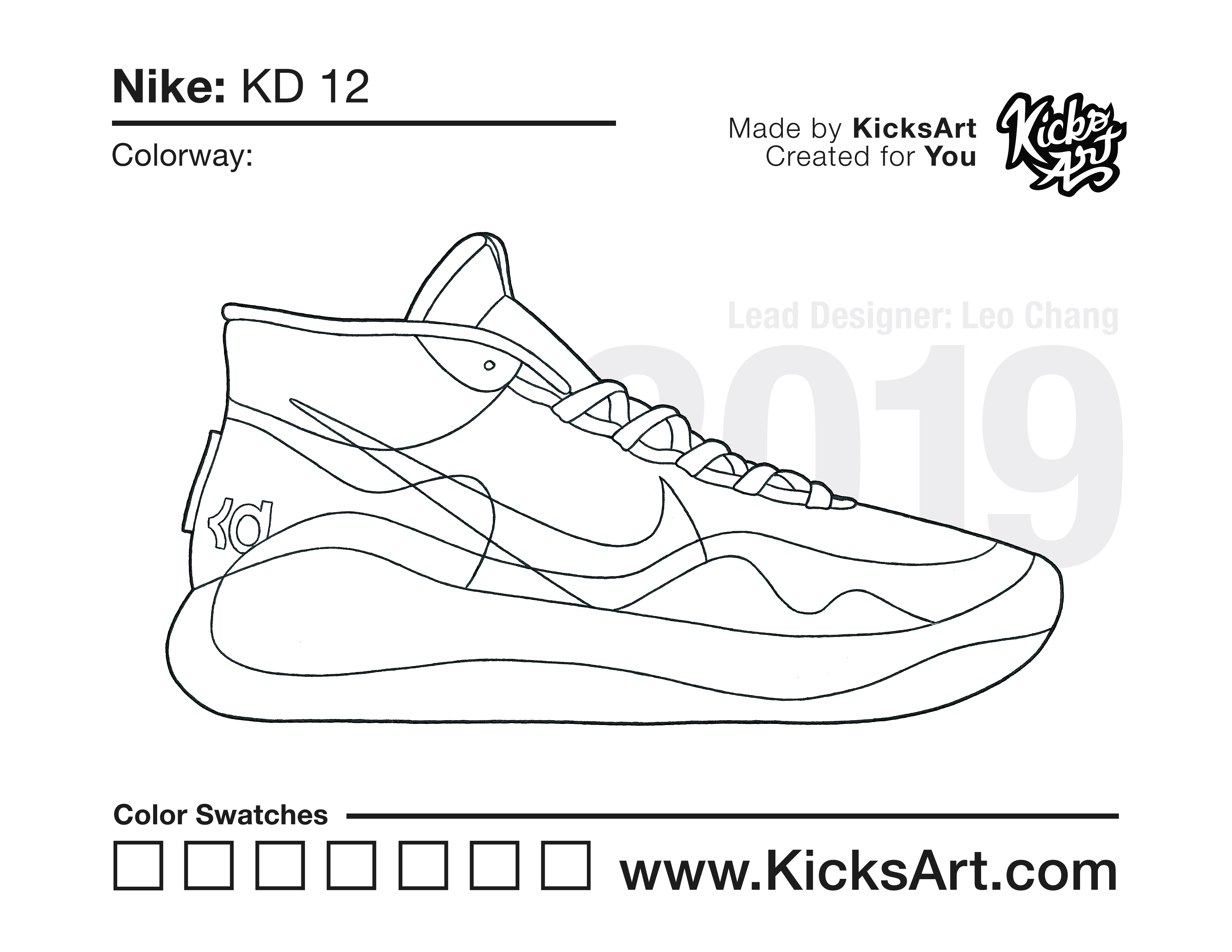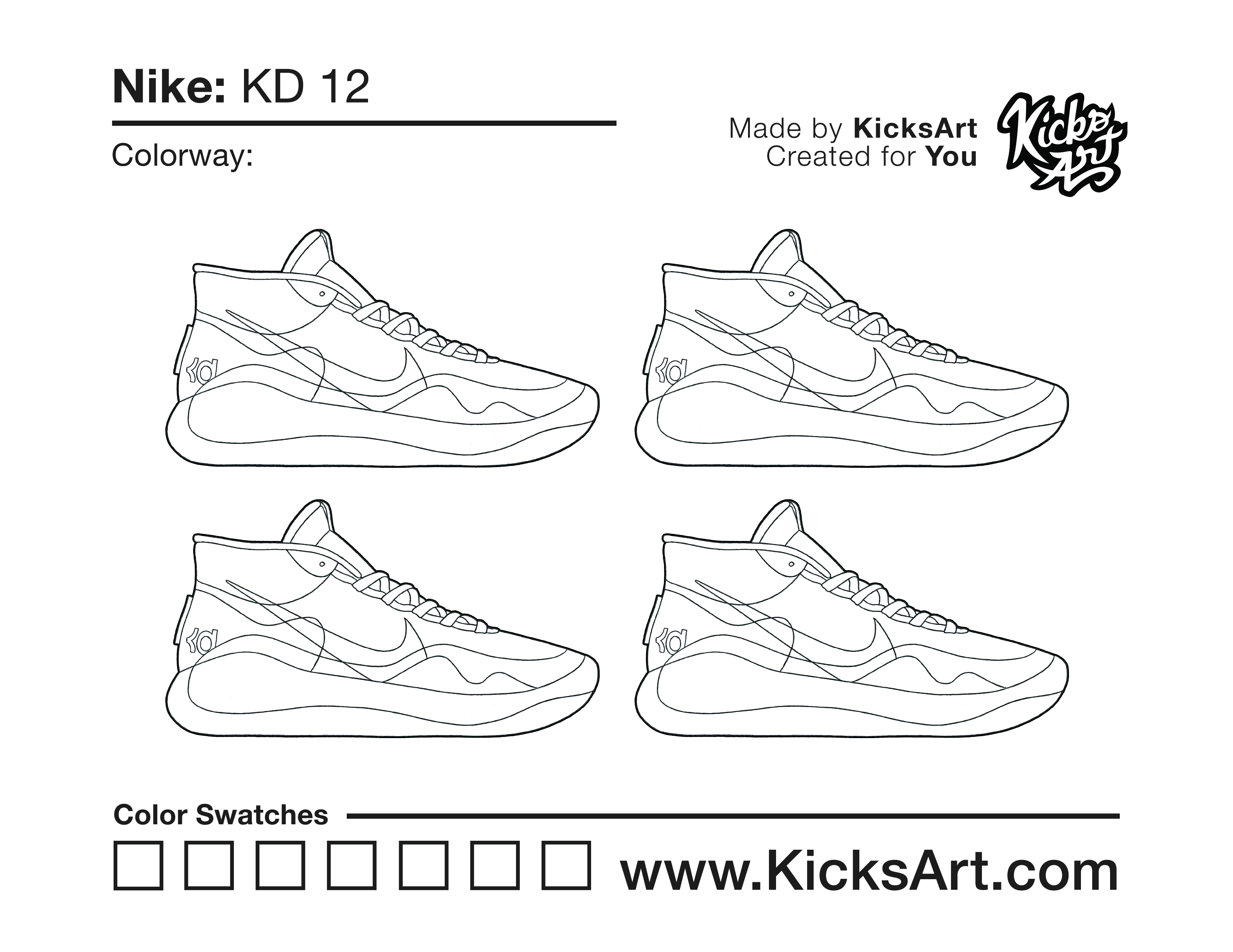 Nike KD 12 Sneaker Coloring Pages March 10, 2020 kicksart05 For any sneaker coloring page, click on the button above the image to start the instant download! FREE Download: Nike KD 12 Art materials can be expensive!Try out colorways on these smaller templates so your supplies can last longer! Nike KD 12 (4UP) Nike KD 12 (Drawing Guide) Drawing Guide (Page 2)