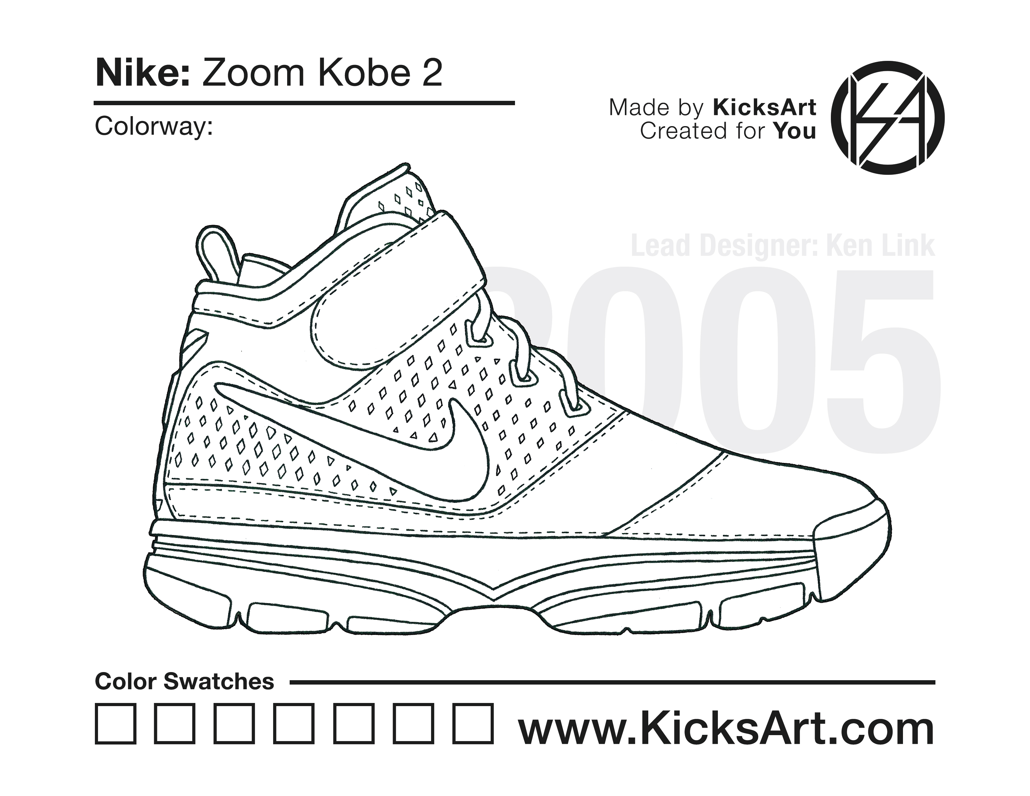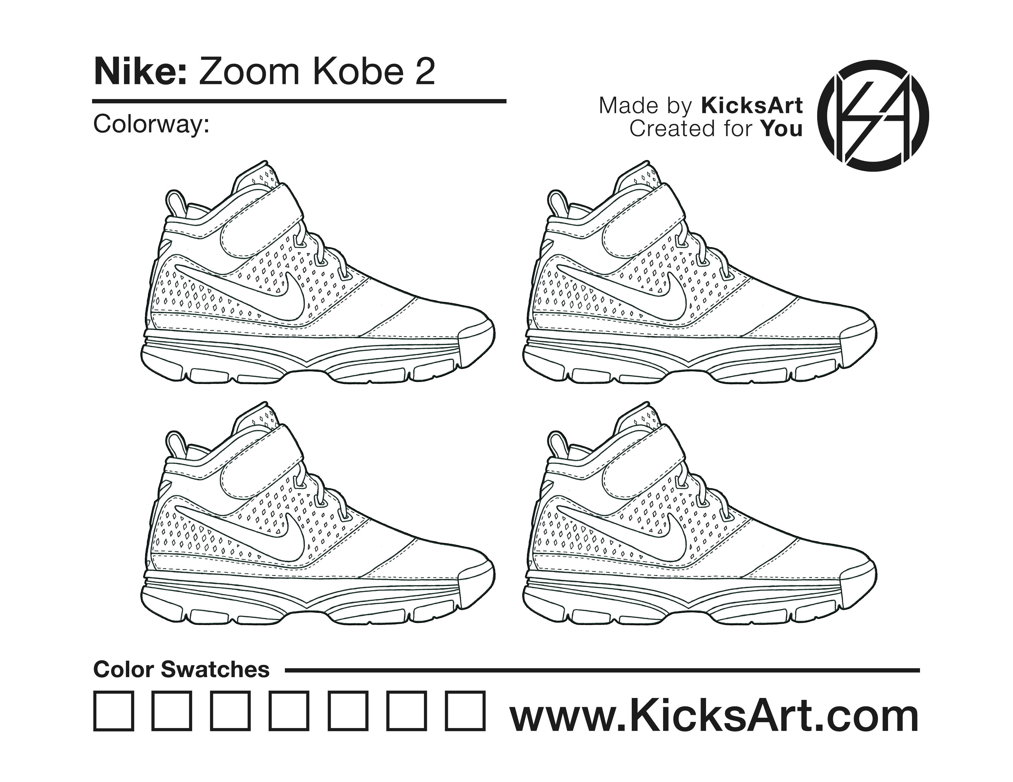 Nike Kobe 2 Sneaker Coloring Pages March 9, 2019 kicksart05 For any sneaker coloring page, click on the button above the image to start the instant download! FREE Download: Nike Kobe 2 Art materials can be expensive!Try out colorways on these smaller templates so your supplies can last longer! Nike Kobe 2 (4UP)