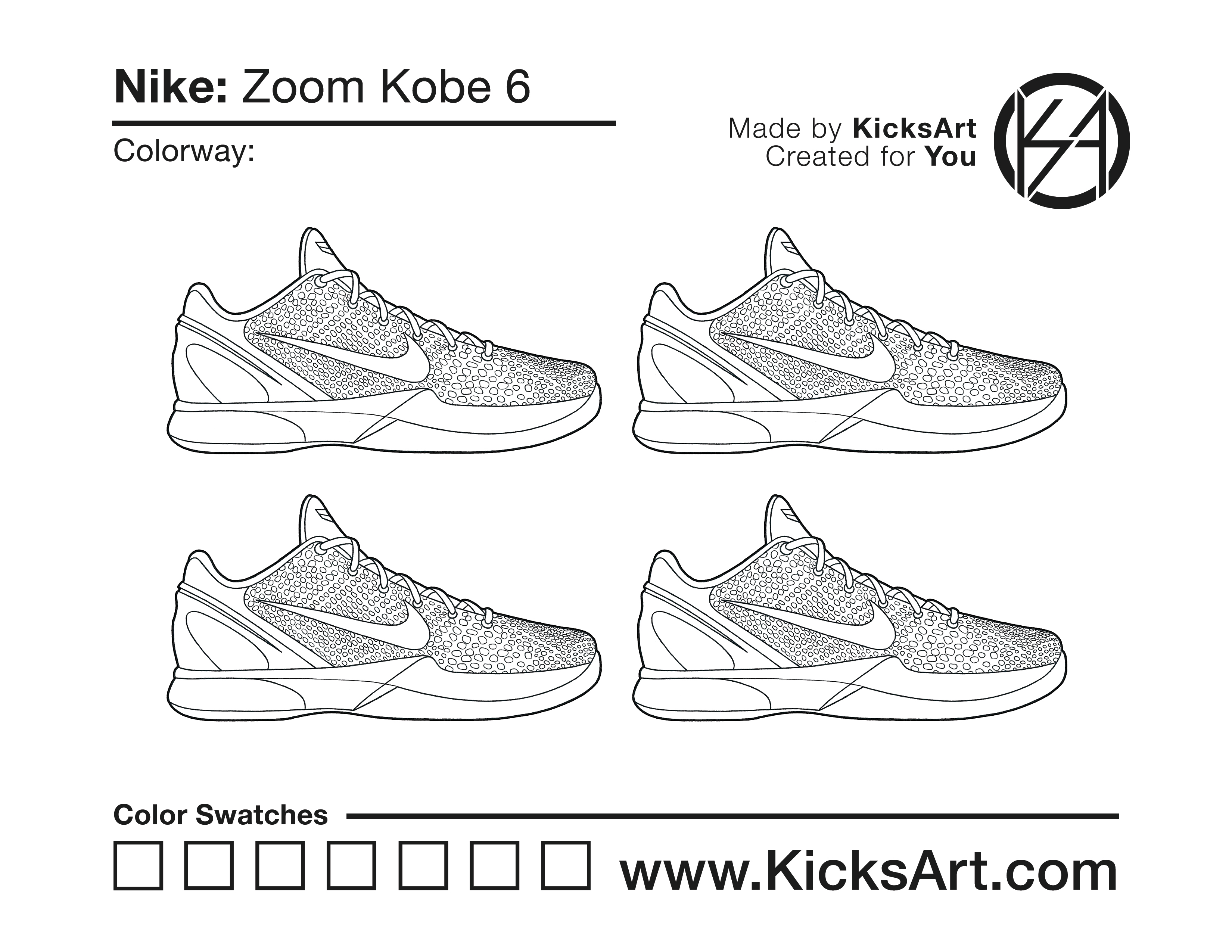 Nike Kobe 6 Sneaker Coloring Pages March 9, 2019 kicksart05 For any sneaker coloring page, click on the button above the image to start the instant download! FREE Download: Nike Kobe 6 Art materials can be expensive!Try out colorways on these smaller templates so your supplies can last longer! Nike Kobe 6 (4UP)