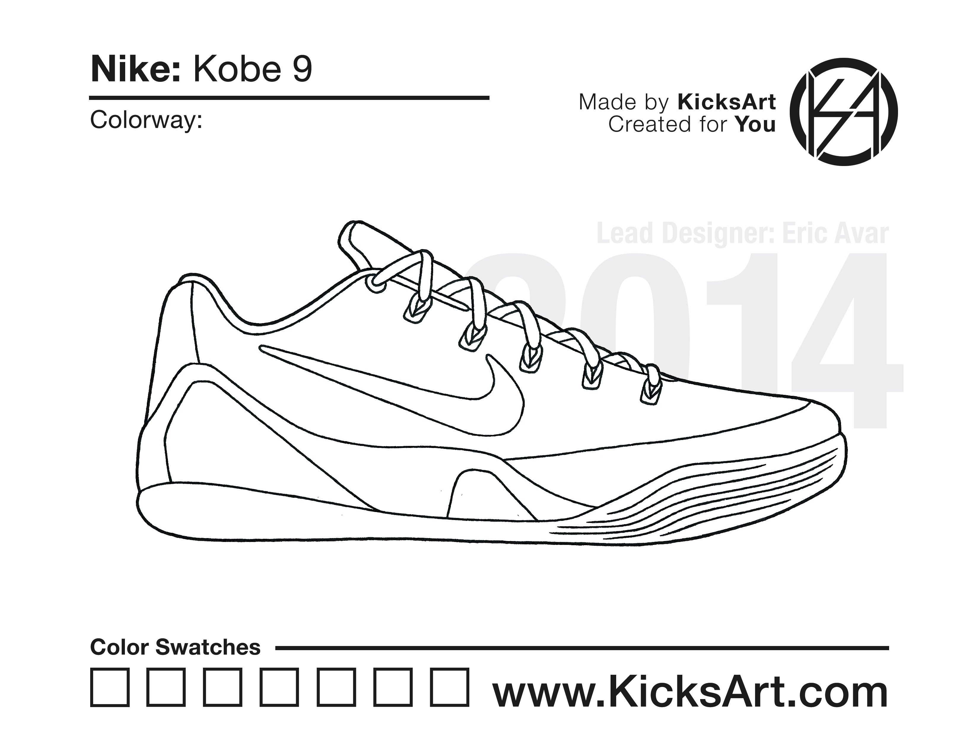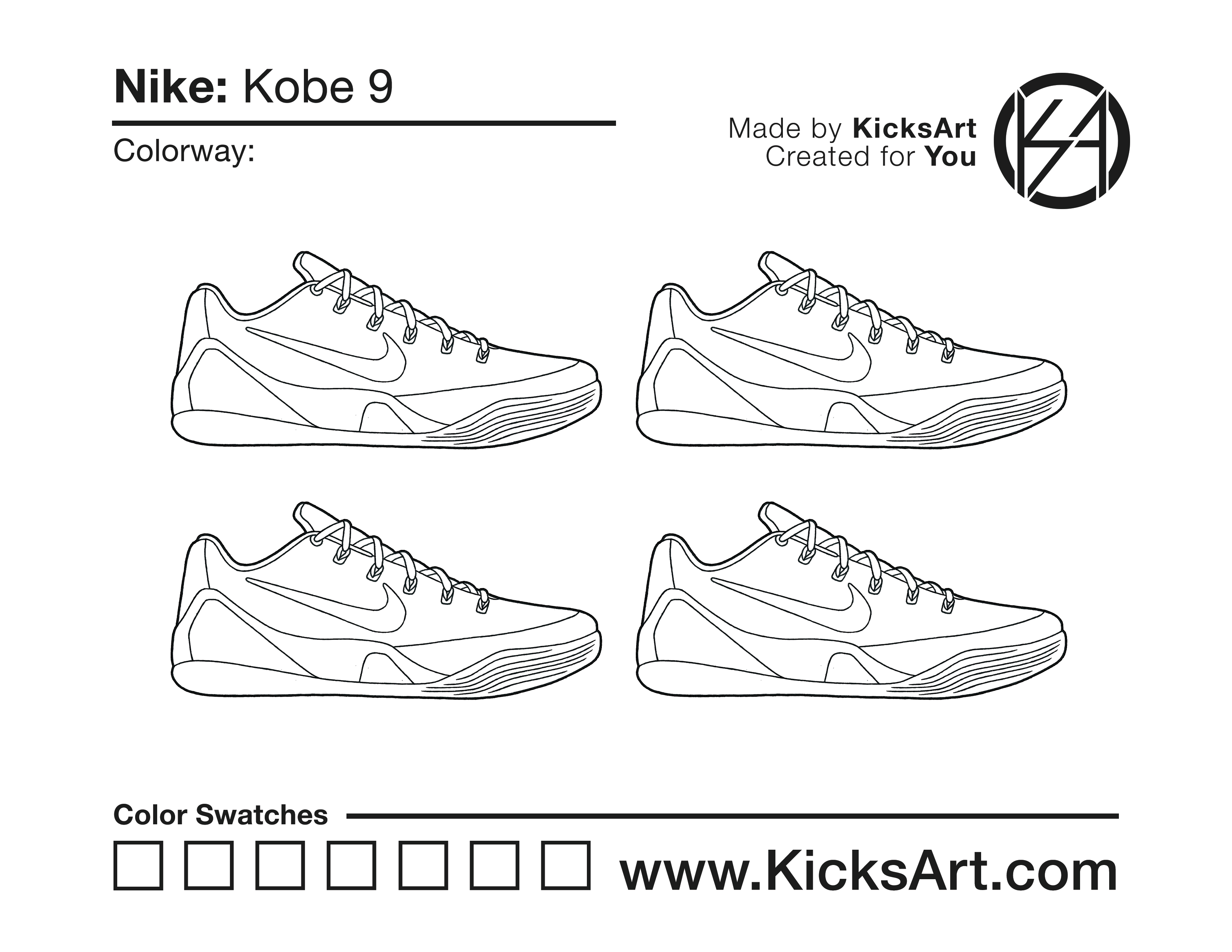 Nike Kobe 9 Sneaker Coloring Pages March 9, 2019 kicksart05 For any sneaker coloring page, click on the button above the image to start the instant download! FREE Download: Nike Kobe 9 Art materials can be expensive!Try out colorways on these smaller templates so your supplies can last longer! Nike Kobe 9 (4UP)