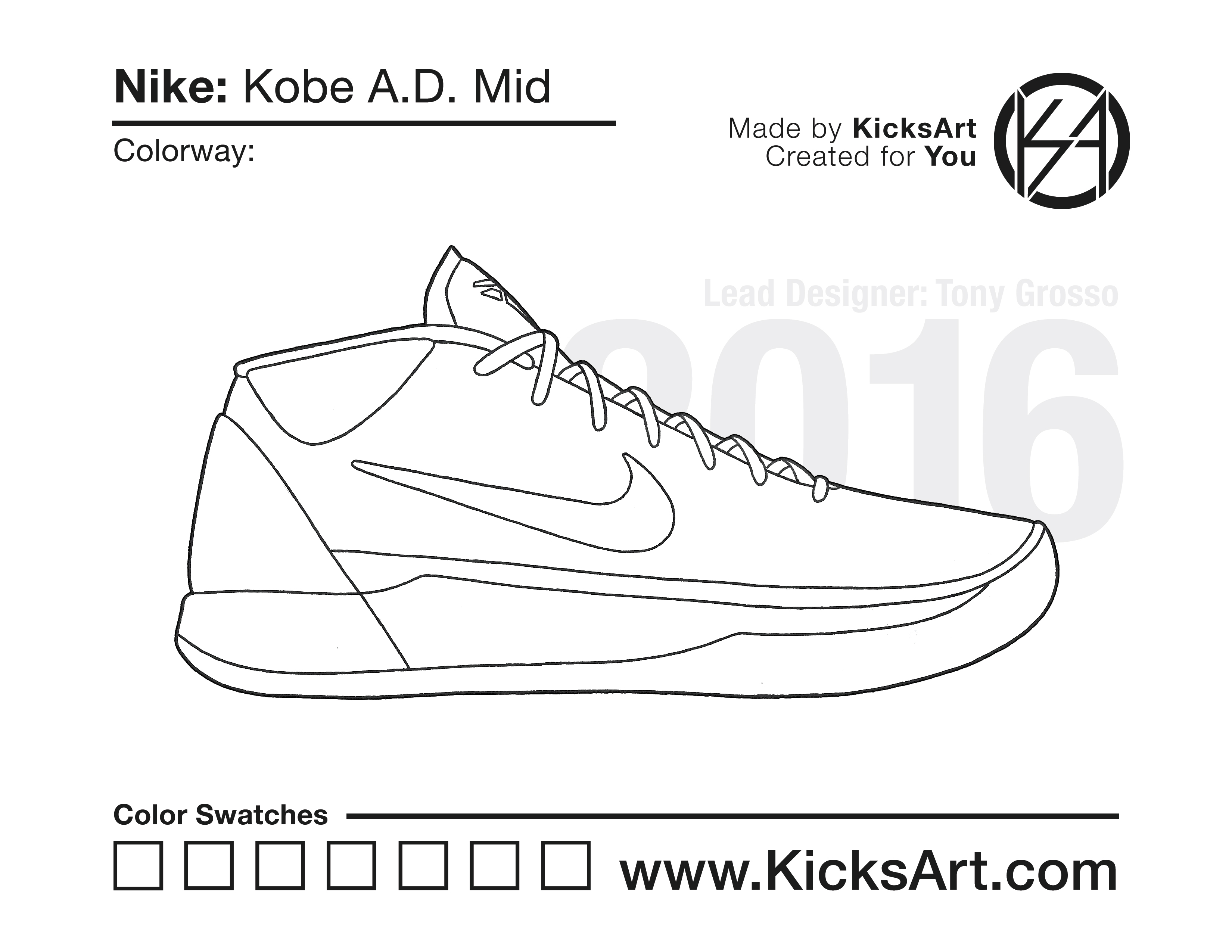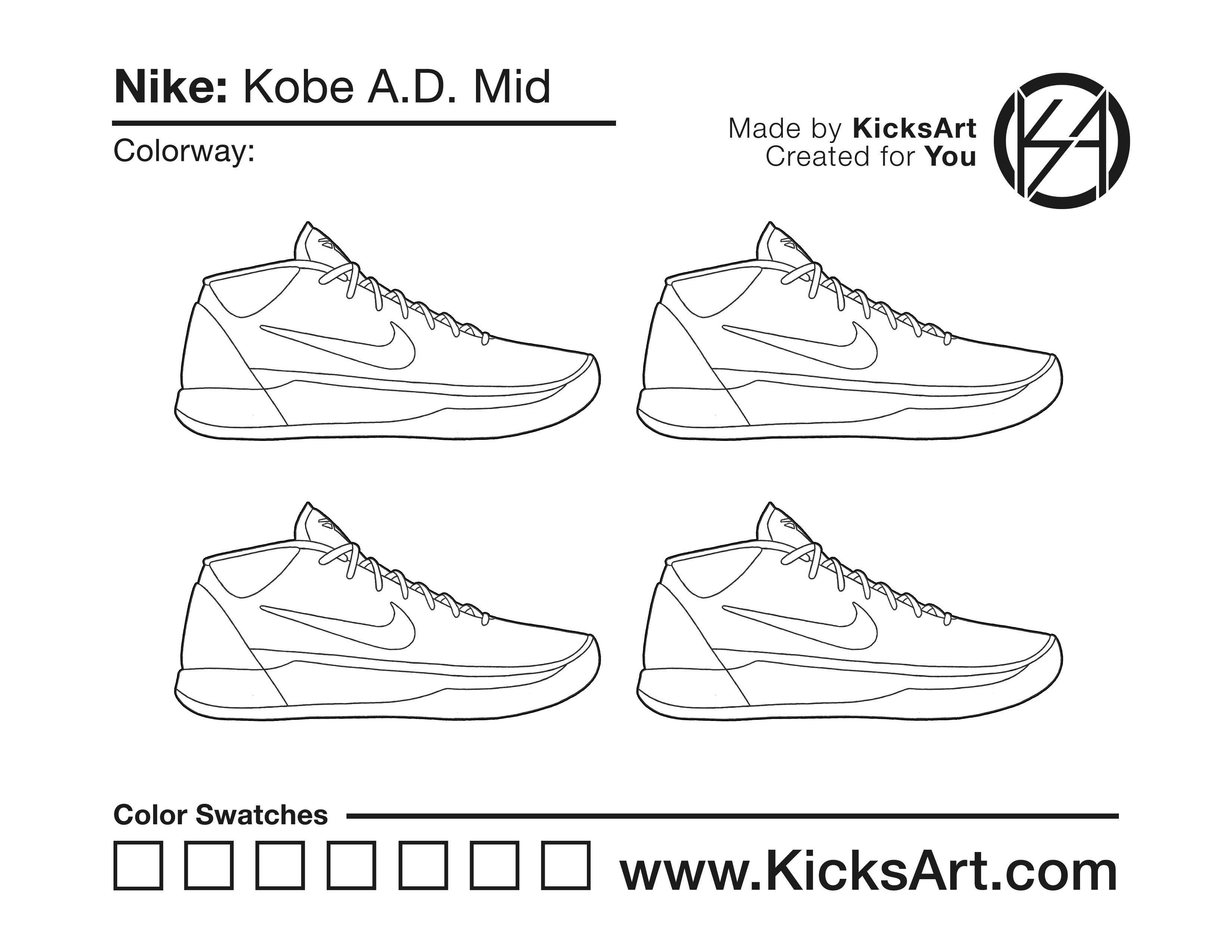 Nike Kobe A.D. Mid Sneaker Coloring Pages March 9, 2019 kicksart05 For any sneaker coloring page, click on the button above the image to start the instant download! FREE Download: Nike Kobe A.D. Mid Art materials can be expensive!Try out colorways on these smaller templates so your supplies can last longer! Nike Kobe A.D. Mid (4UP)