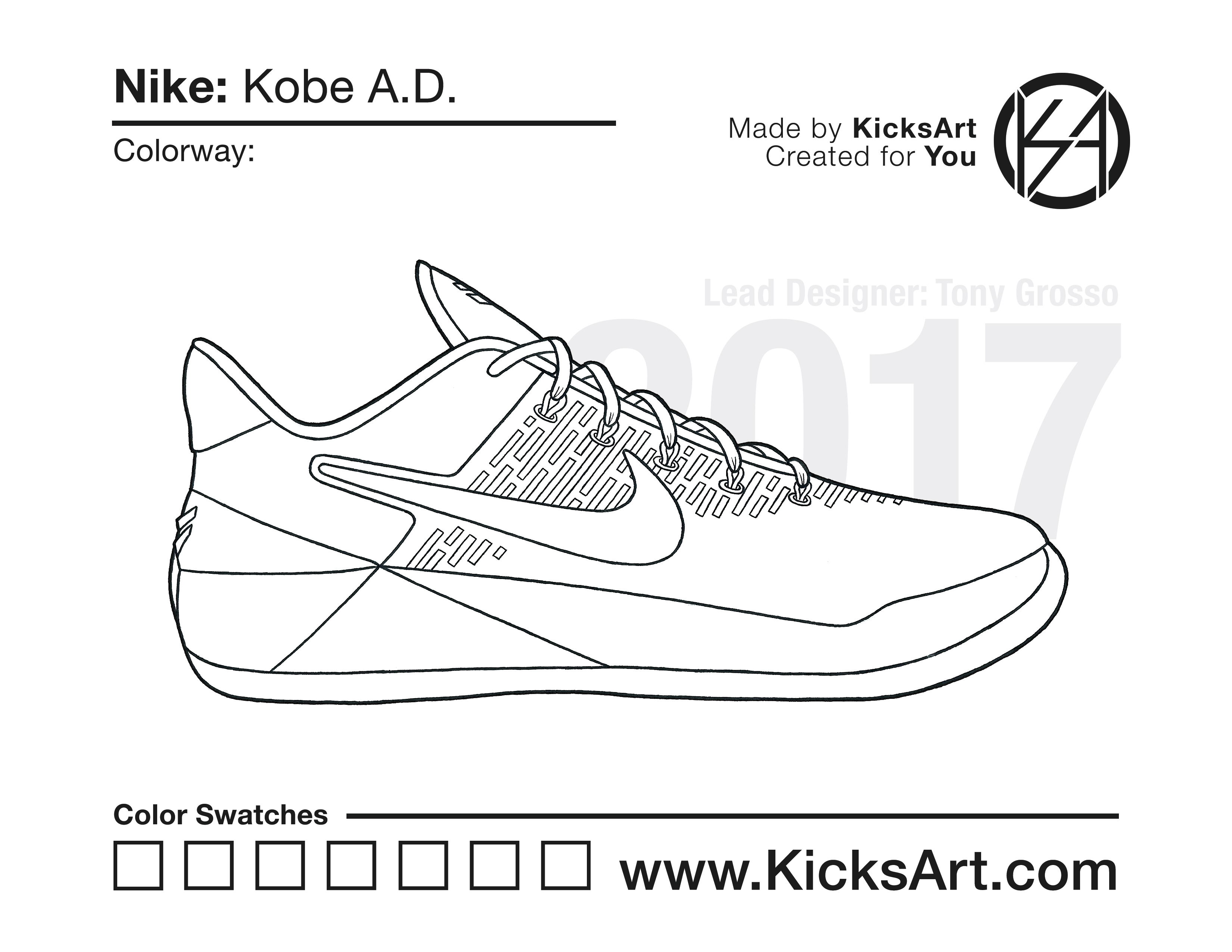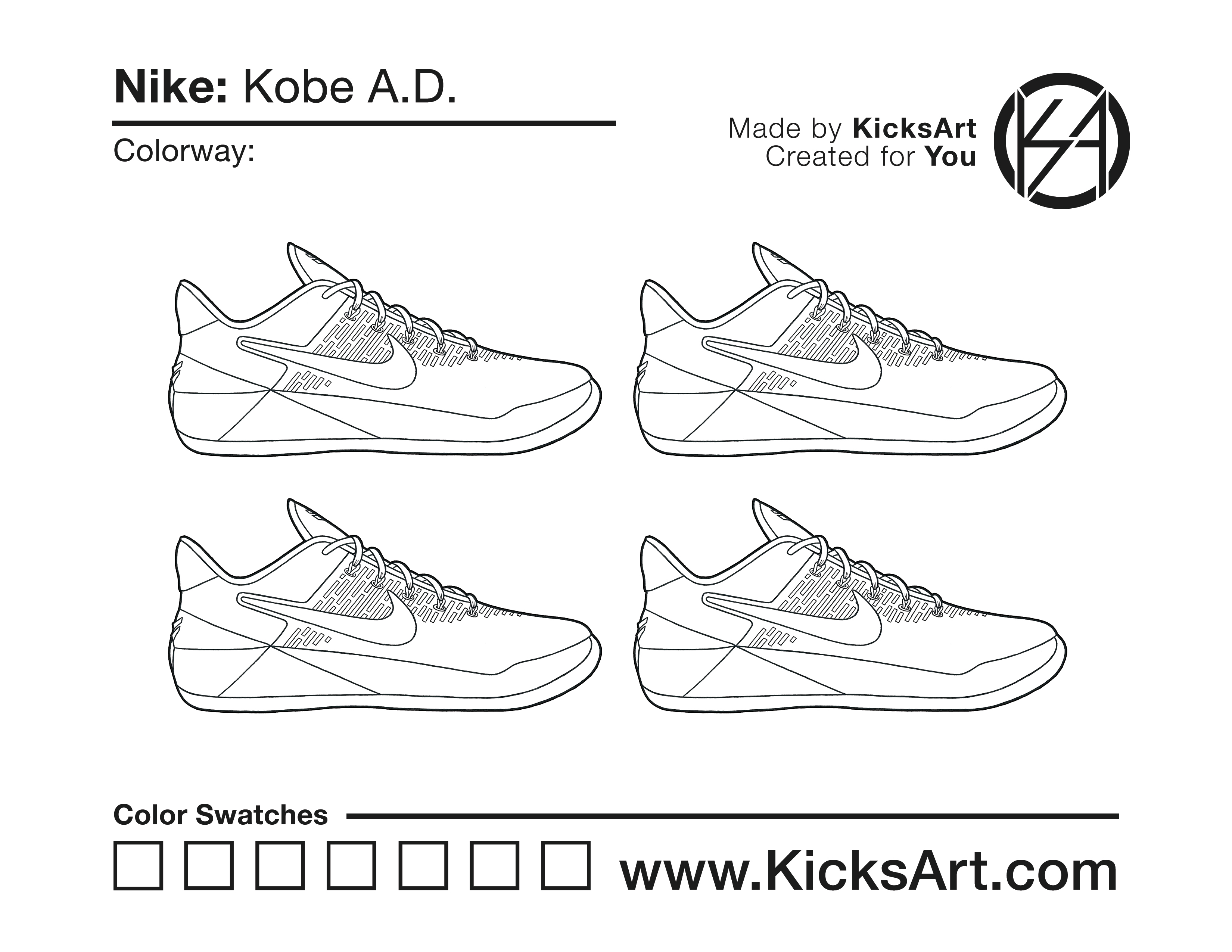 Nike Kobe A.D. Sneaker Coloring Pages March 9, 2019 kicksart05 For any sneaker coloring page, click on the button above the image to start the instant download! FREE Download: Nike Kobe A.D. Art materials can be expensive!Try out colorways on these smaller templates so your supplies can last longer! Nike Kobe A.D. (4UP)
