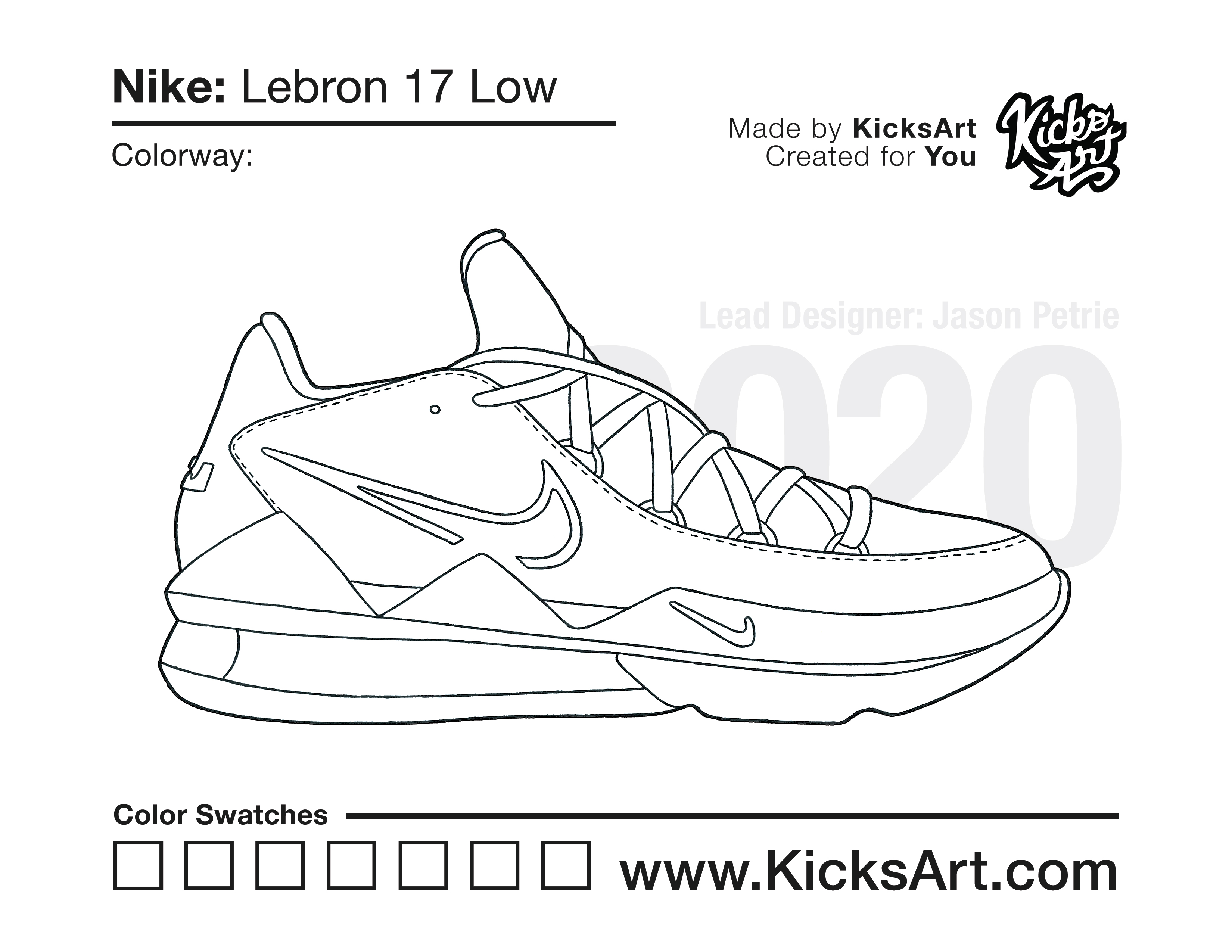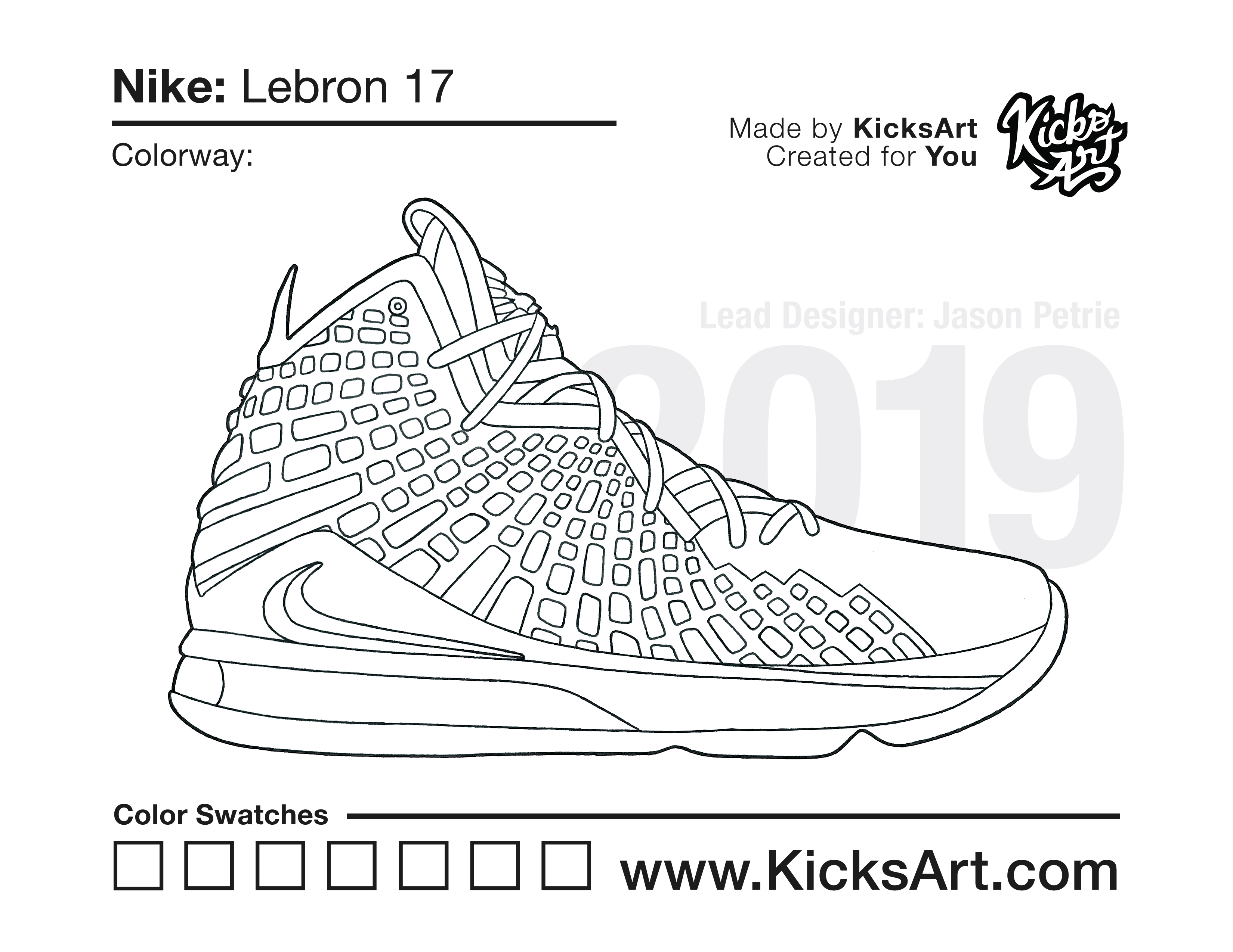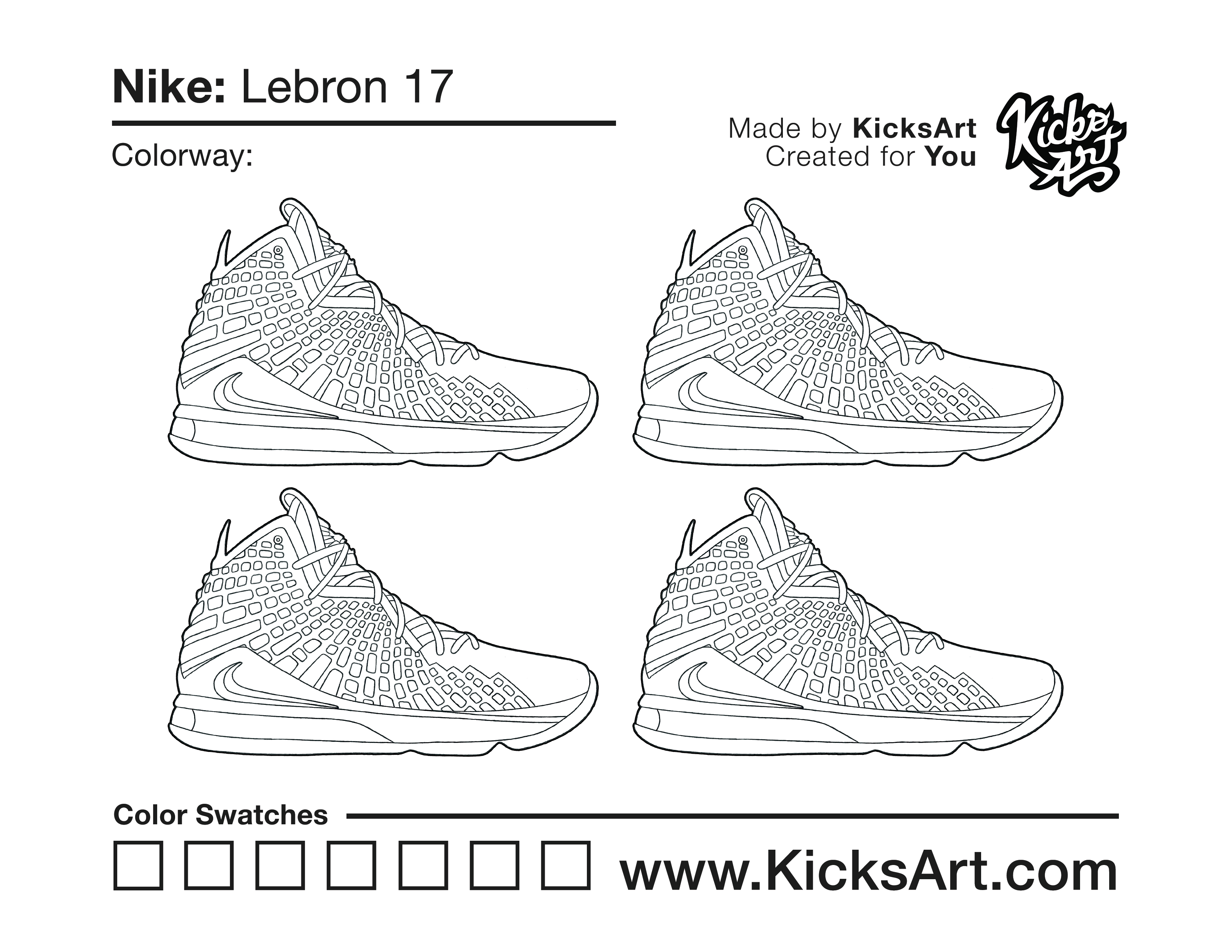 Nike Lebron 17 Sneaker Coloring Pages March 23, 2020 kicksart05 For any sneaker coloring page, click on the button above the image to start the instant download! FREE Download: Nike Lebron 17 Art materials can be expensive!Try out colorways on these smaller templates so your supplies can last longer! Nike Lebron 17 (4UP) Additional Variants Nike Lebron 17 Low