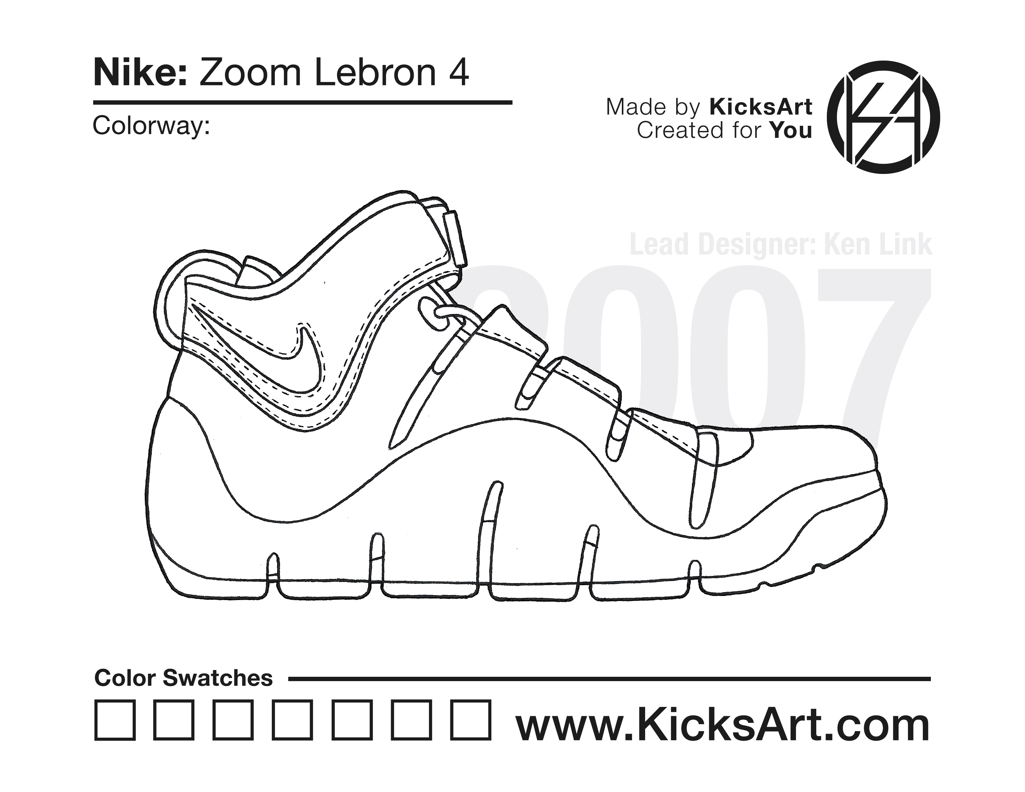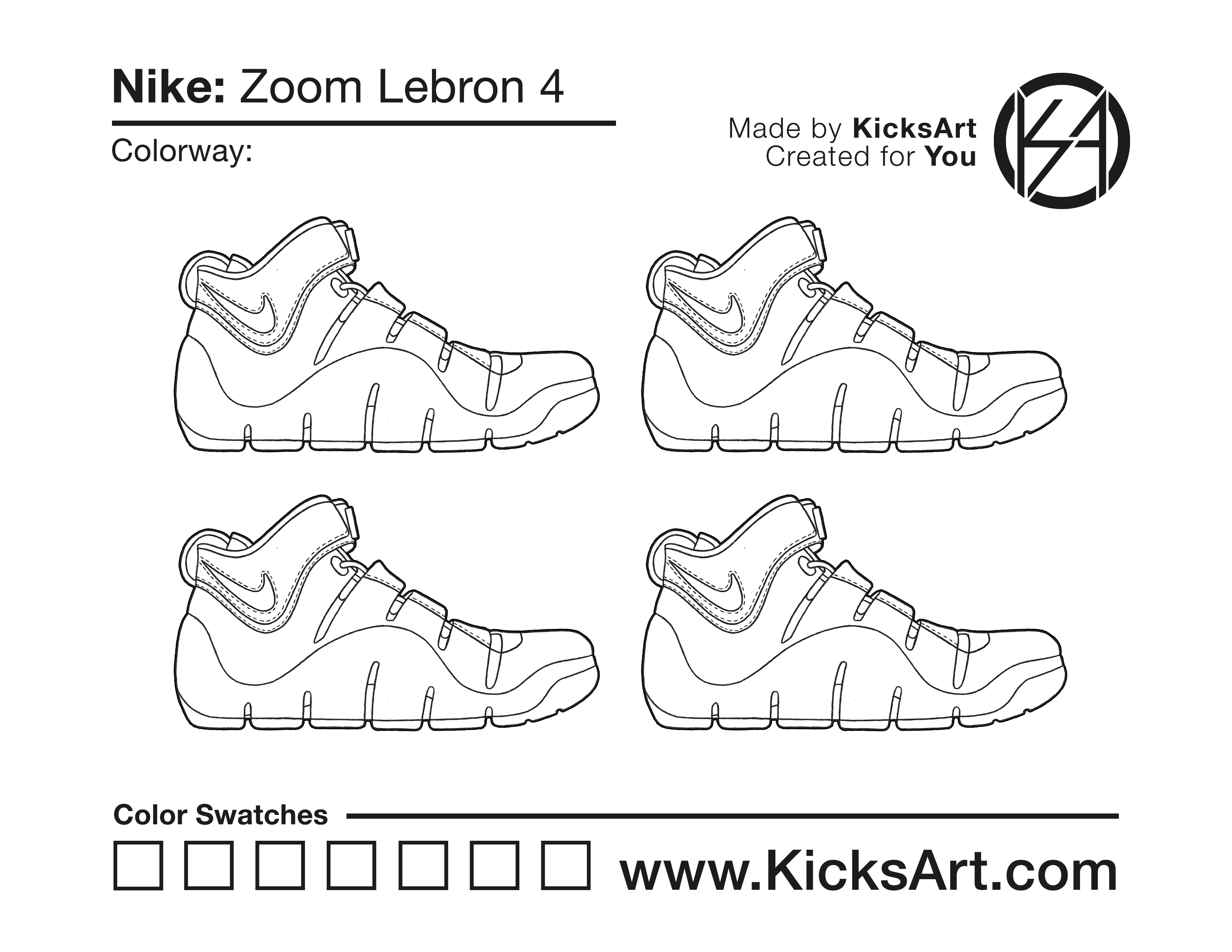Nike Lebron 4 Sneaker Coloring Pages March 5, 2019 kicksart05 For any sneaker coloring page, click on the button above the image to start the instant download! FREE Download: Nike Lebron 4 Art materials can be expensive!Try out colorways on these smaller templates so your supplies can last longer! Nike Lebron 4 (4UP)
