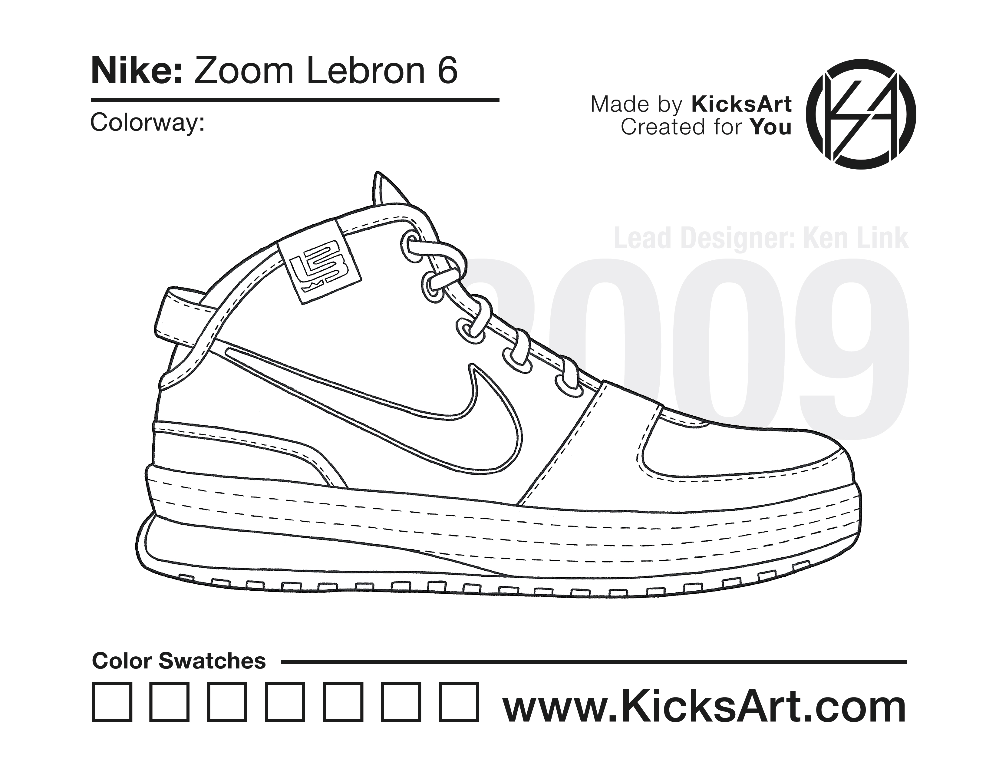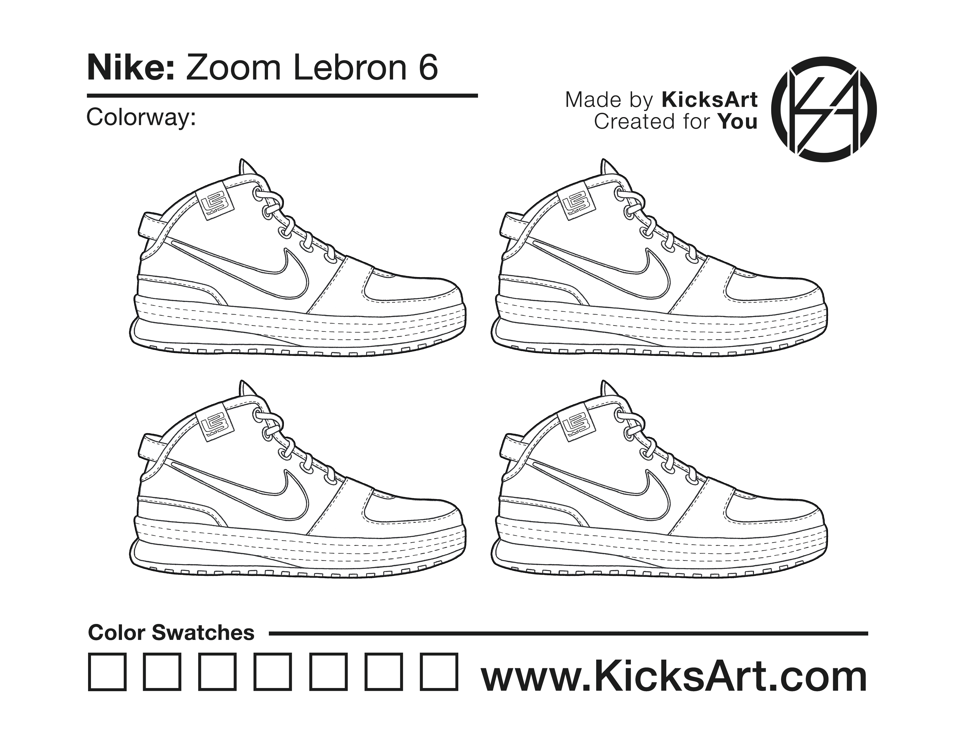 Nike Lebron 6 Sneaker Coloring Pages March 5, 2019 kicksart05 For any sneaker coloring page, click on the button above the image to start the instant download! FREE Download: Nike Lebron 6 Art materials can be expensive!Try out colorways on these smaller templates so your supplies can last longer! Nike Lebron 6 (4UP)