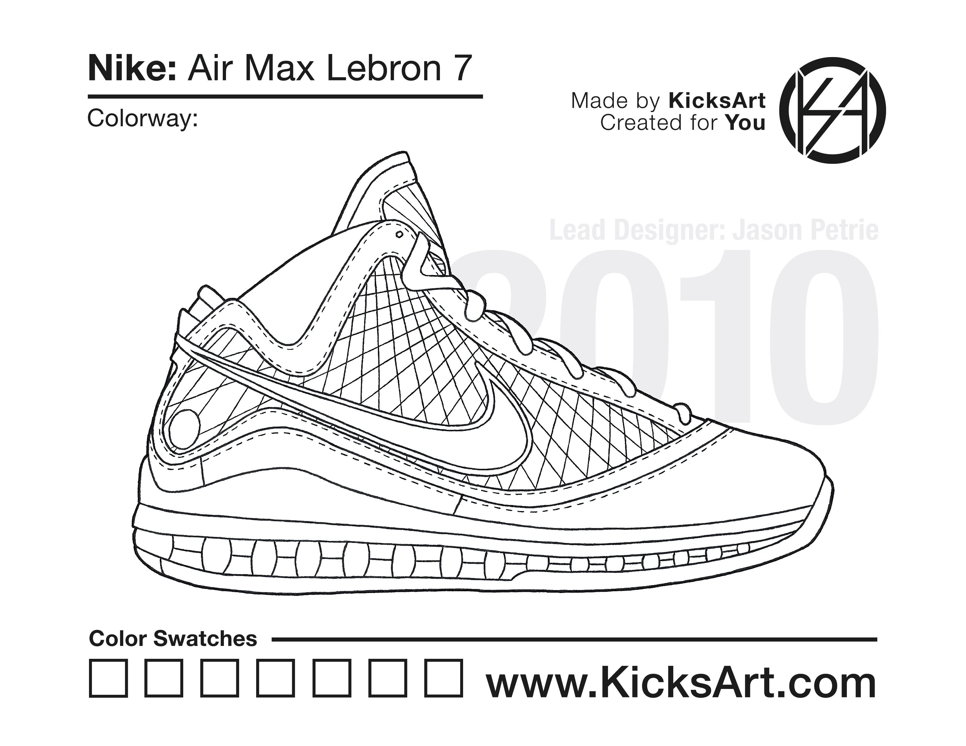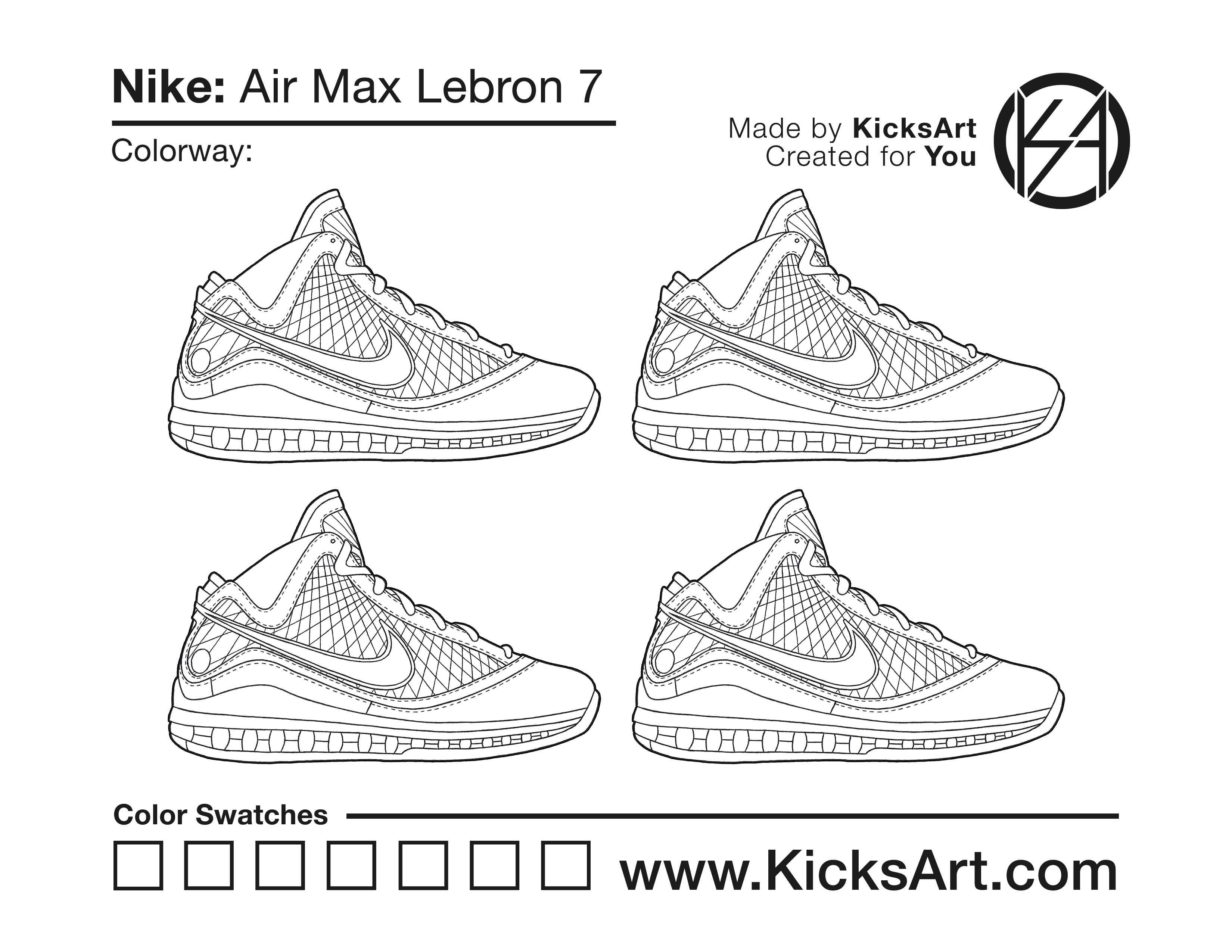 Nike Lebron 7 Sneaker Coloring Pages March 5, 2019 kicksart05 For any sneaker coloring page, click on the button above the image to start the instant download! FREE Download: Nike Lebron 7 Art materials can be expensive!Try out colorways on these smaller templates so your supplies can last longer! Nike Lebron 7 (4UP) Nike Lebron 7 (Drawing Guide) Drawing Guide (Page 2)