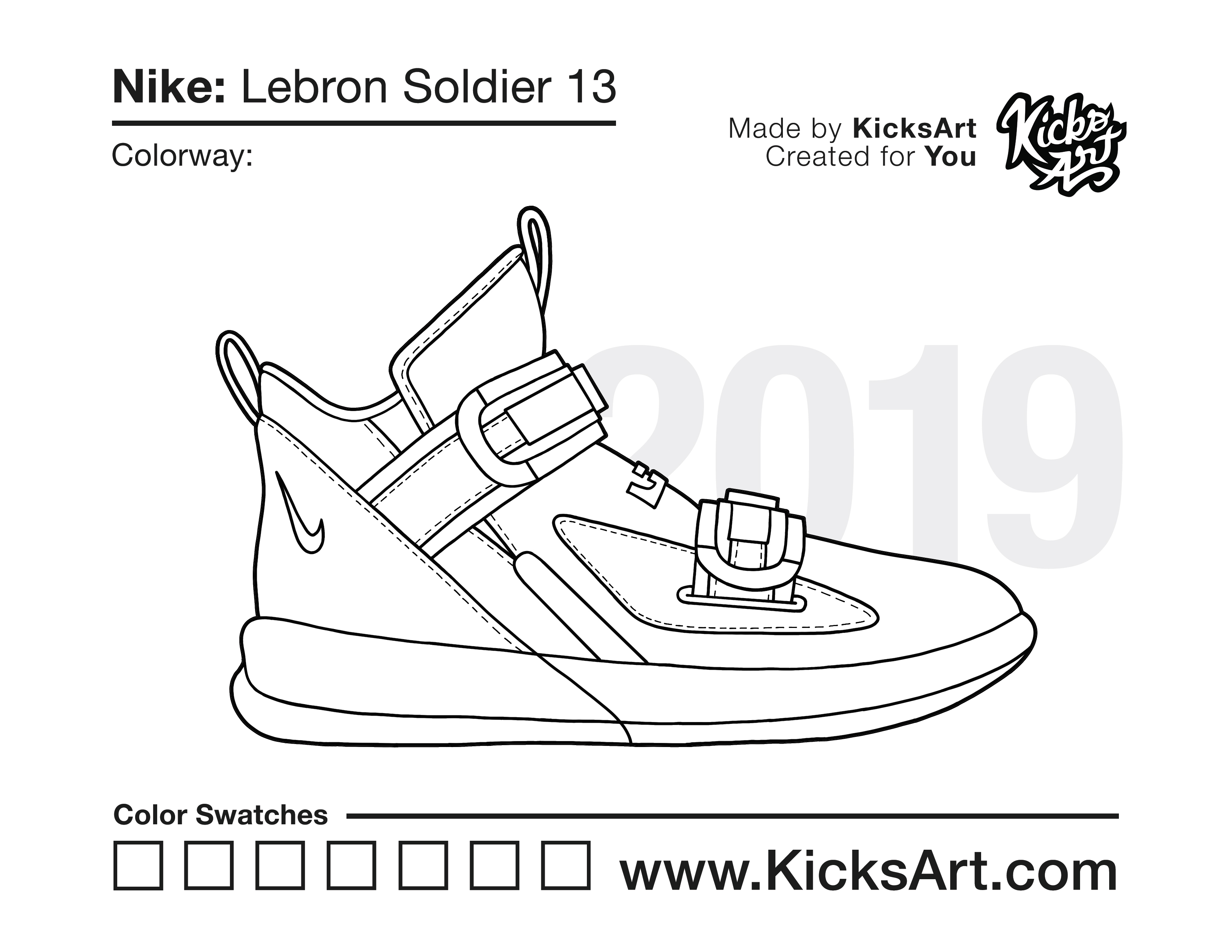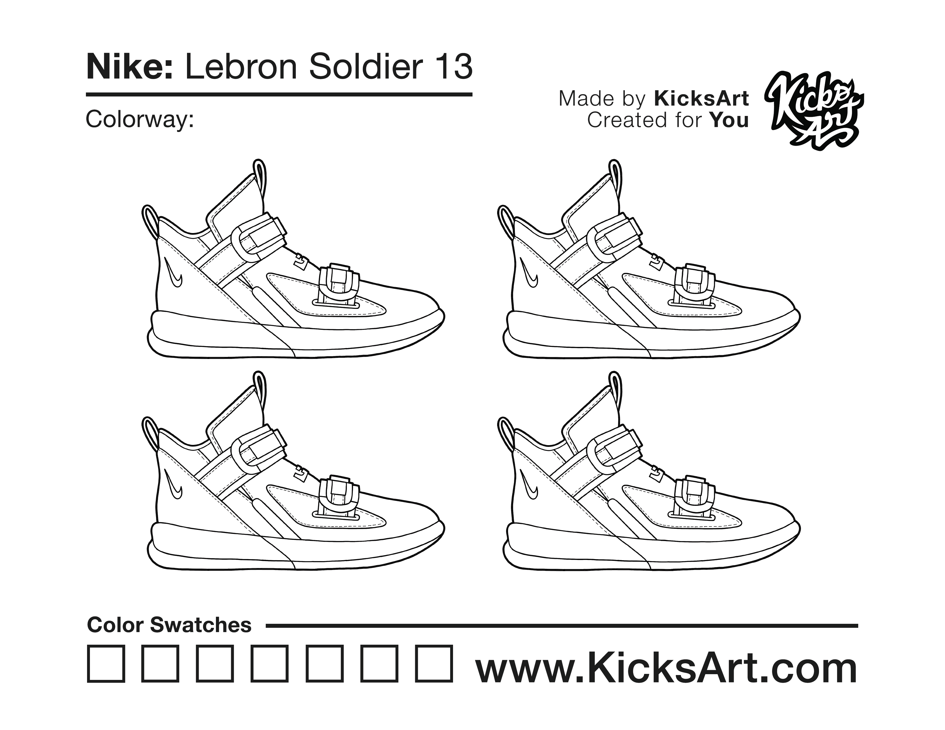 Nike Lebron Soldier 13 Sneaker Coloring Pages February 3, 2021 kicksart05 For any sneaker coloring page, click on the button above the image to start the instant download! FREE Download: Nike Lebron Soldier 13 Art materials can be expensive!Try out colorways on these smaller templates so your supplies can last longer! Nike Lebron Soldier 13 (4UP)