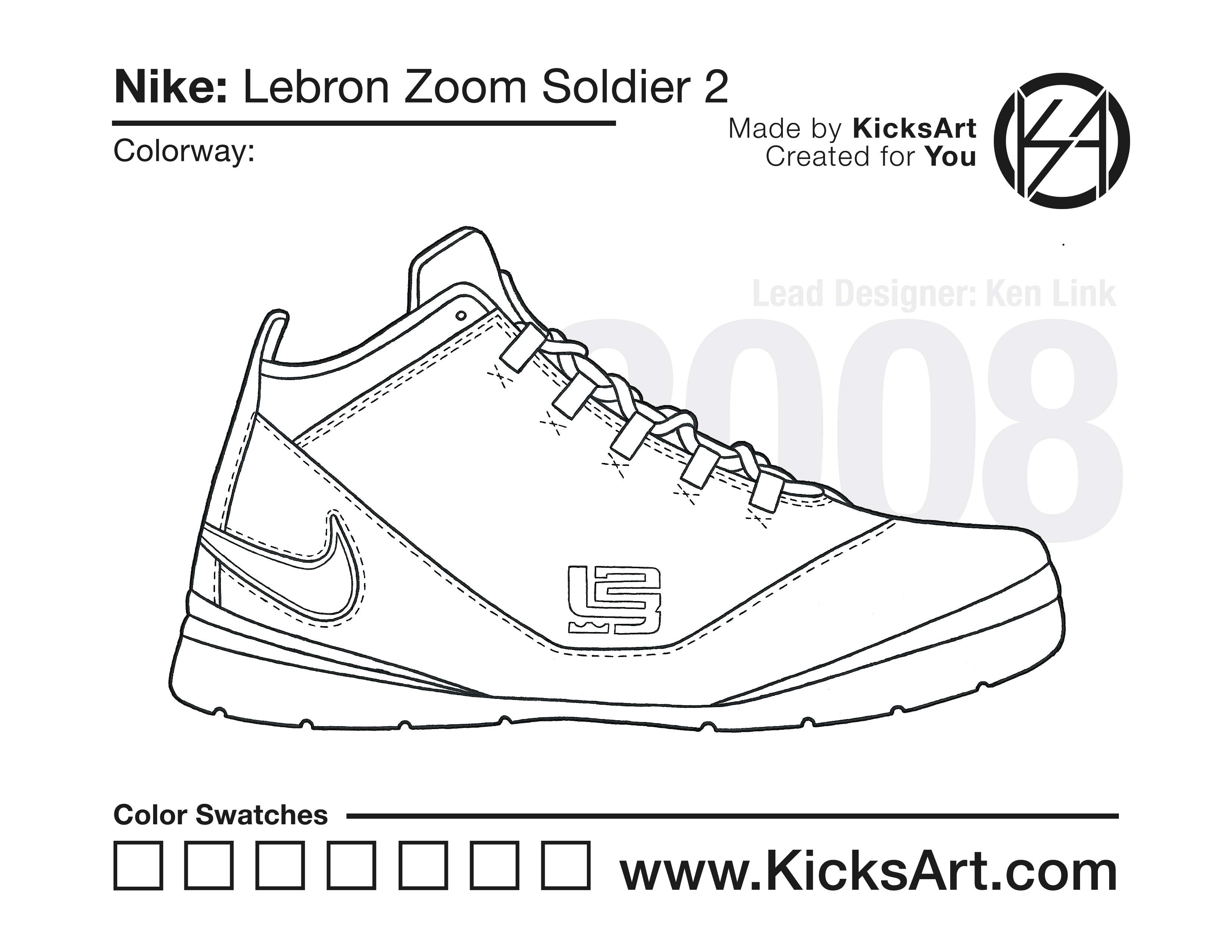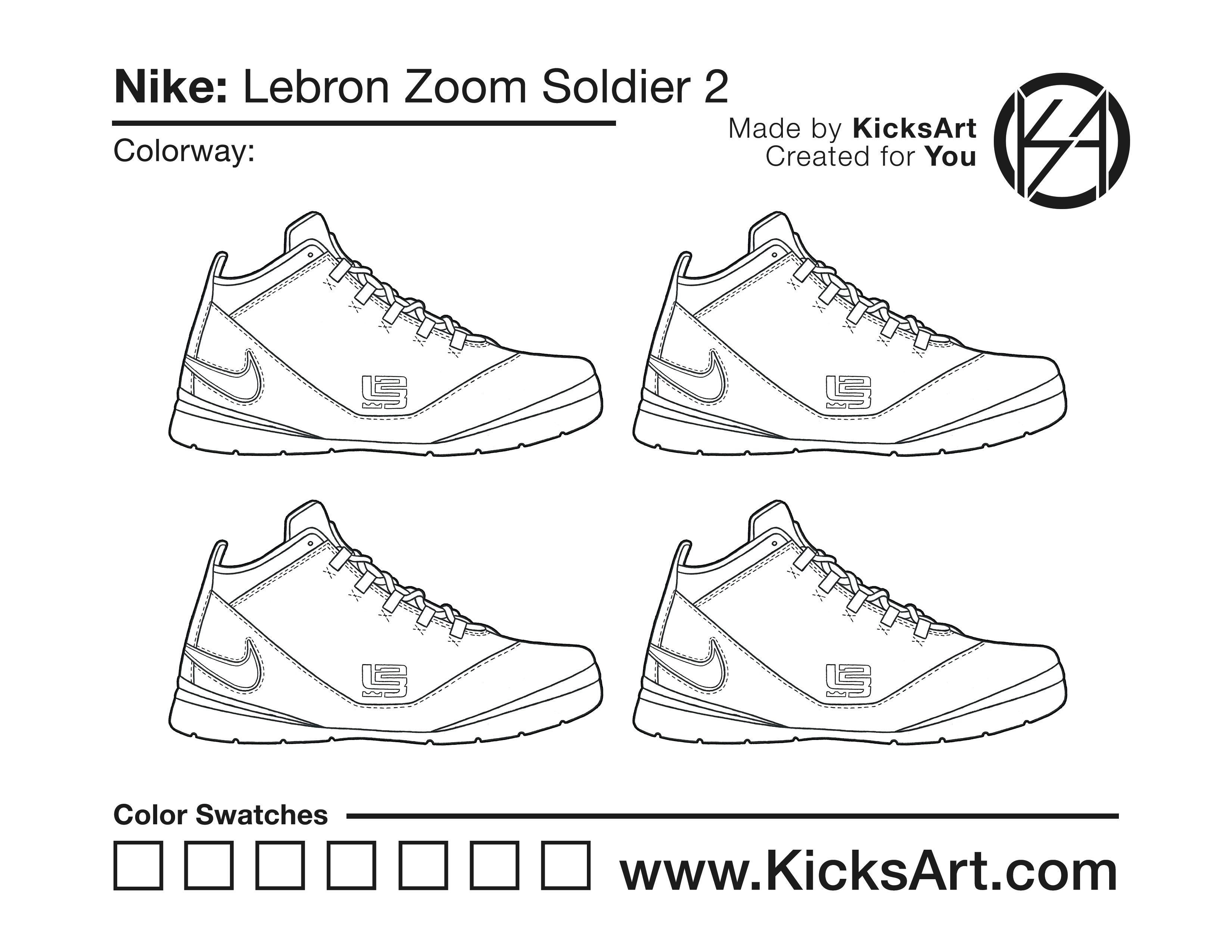 Nike Lebron Soldier 2 Sneaker Coloring Pages March 5, 2019 kicksart05 For any sneaker coloring page, click on the button above the image to start the instant download! FREE Download: Nike Lebron Soldier 2 Art materials can be expensive!Try out colorways on these smaller templates so your supplies can last longer! Nike Lebron Soldier 2 (4UP)