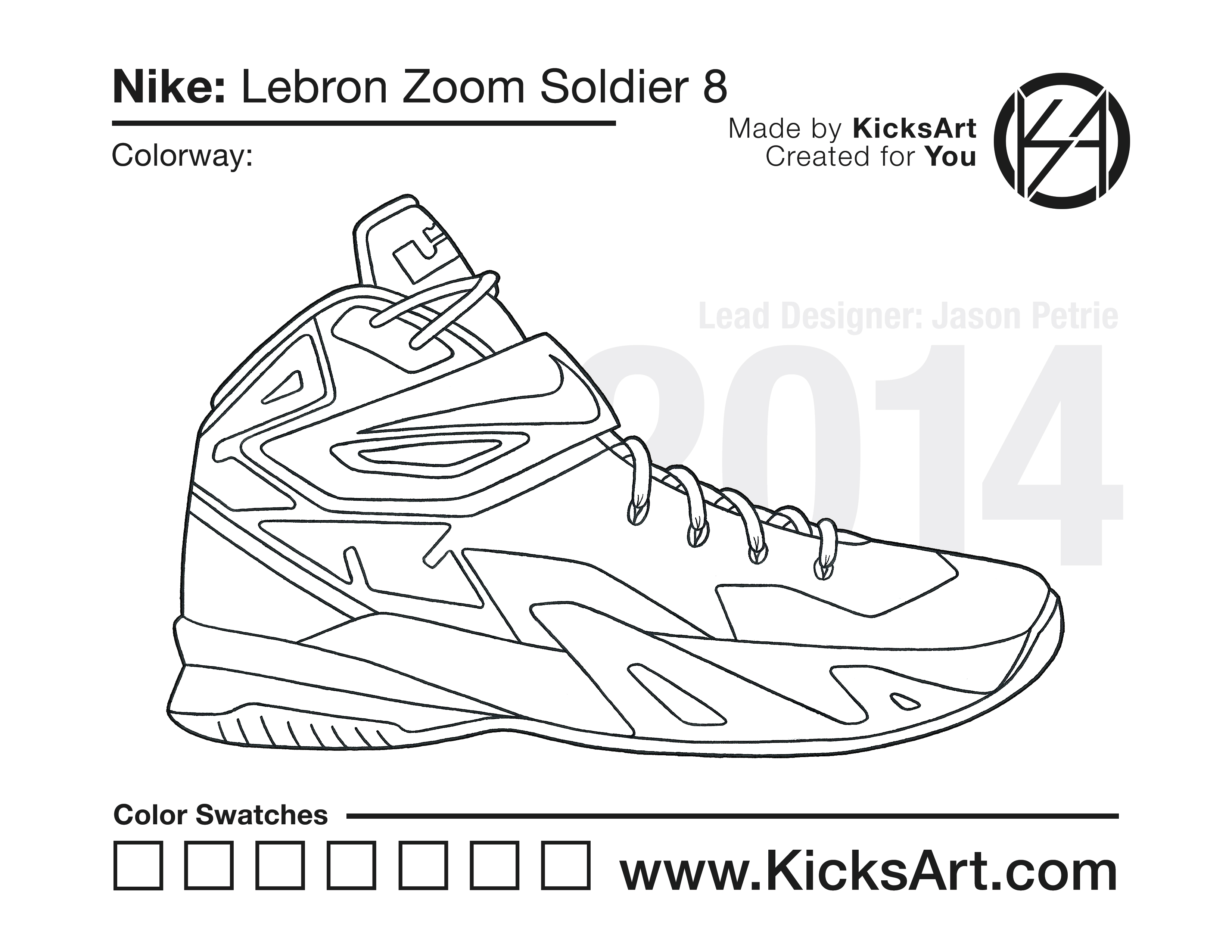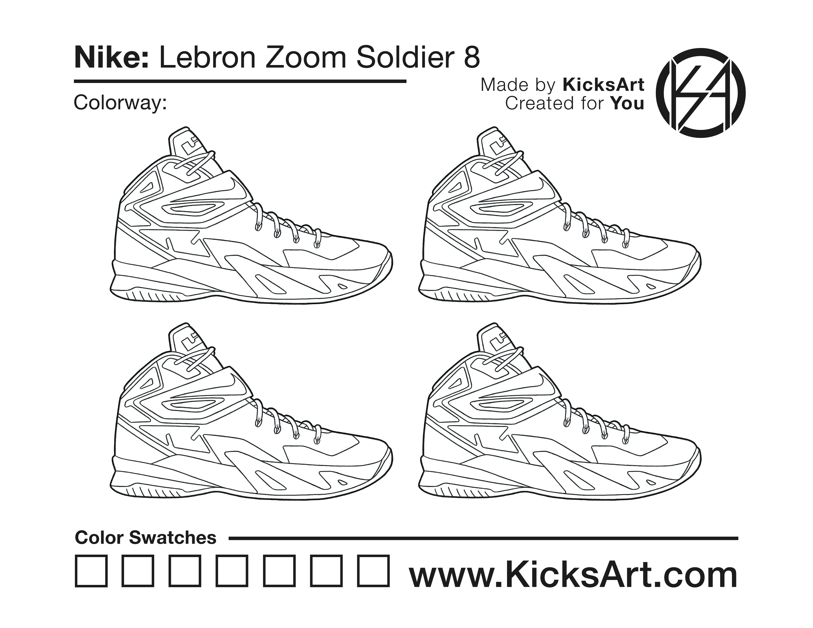 Nike Lebron Soldier 8 Sneaker Coloring Pages March 5, 2019 kicksart05 For any sneaker coloring page, click on the button above the image to start the instant download! FREE Download: Nike Lebron Soldier 8 Art materials can be expensive!Try out colorways on these smaller templates so your supplies can last longer! Nike Lebron Soldier 8 (4UP)