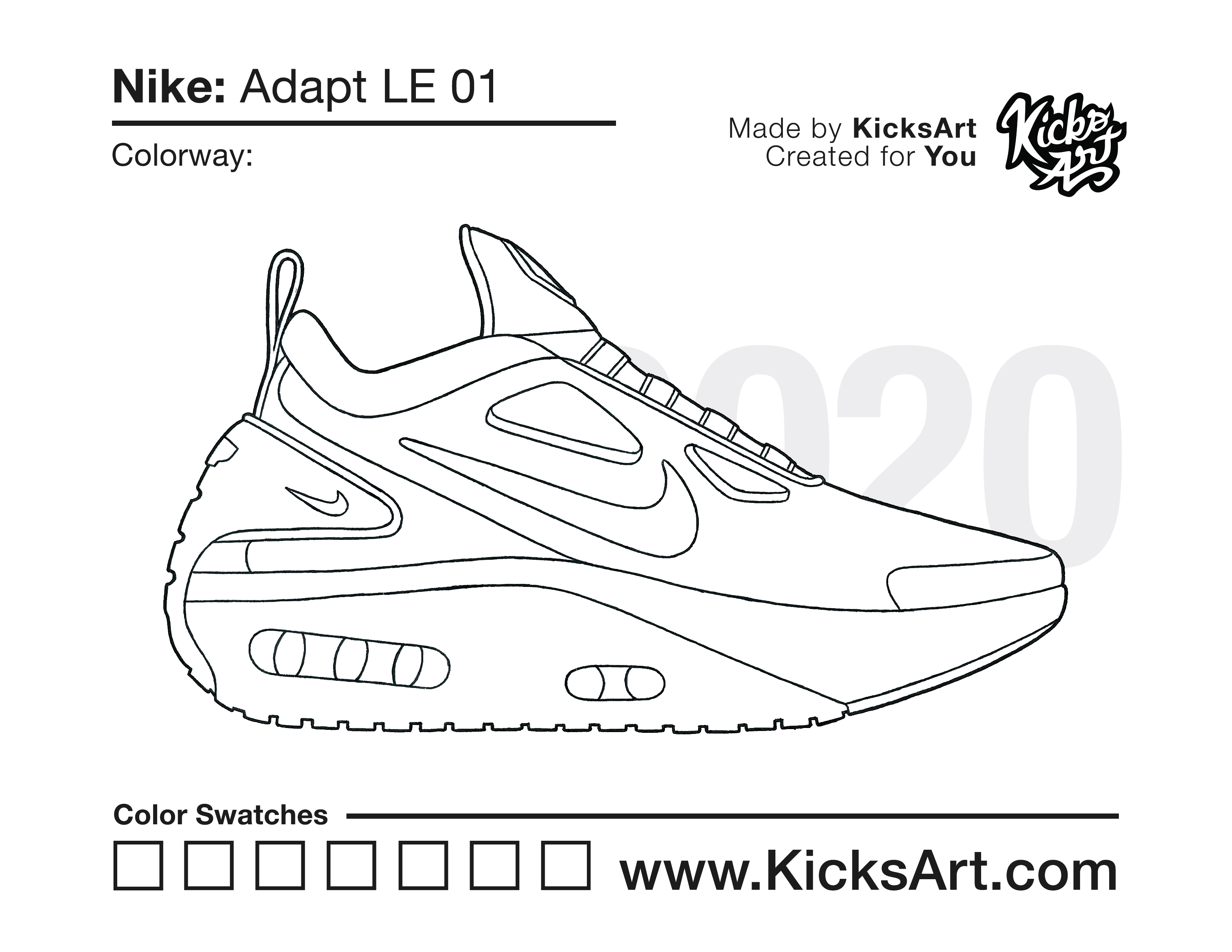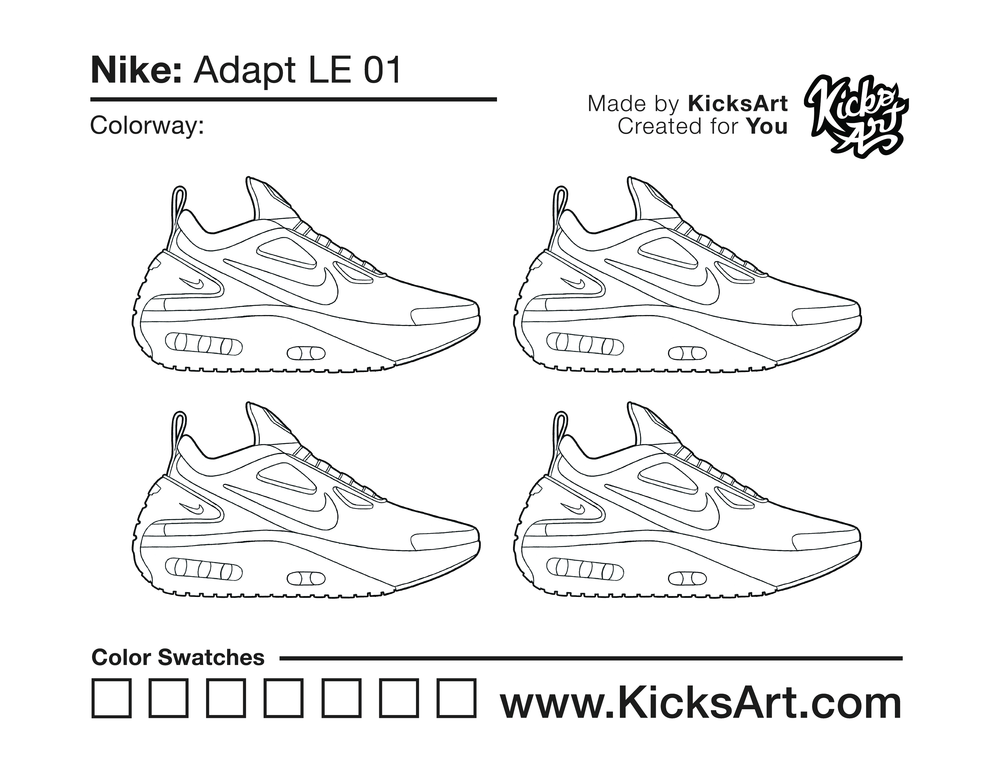 Nike Adapt LE 01 Sneaker Coloring Pages April 2, 2020 kicksart05 For any sneaker coloring page, click on the button above the image to start the instant download! FREE Download: Nike Adapt LE 01 Art materials can be expensive!Try out colorways on these smaller templates so your supplies can last longer! Nike Adapt LE 01 (4UP)