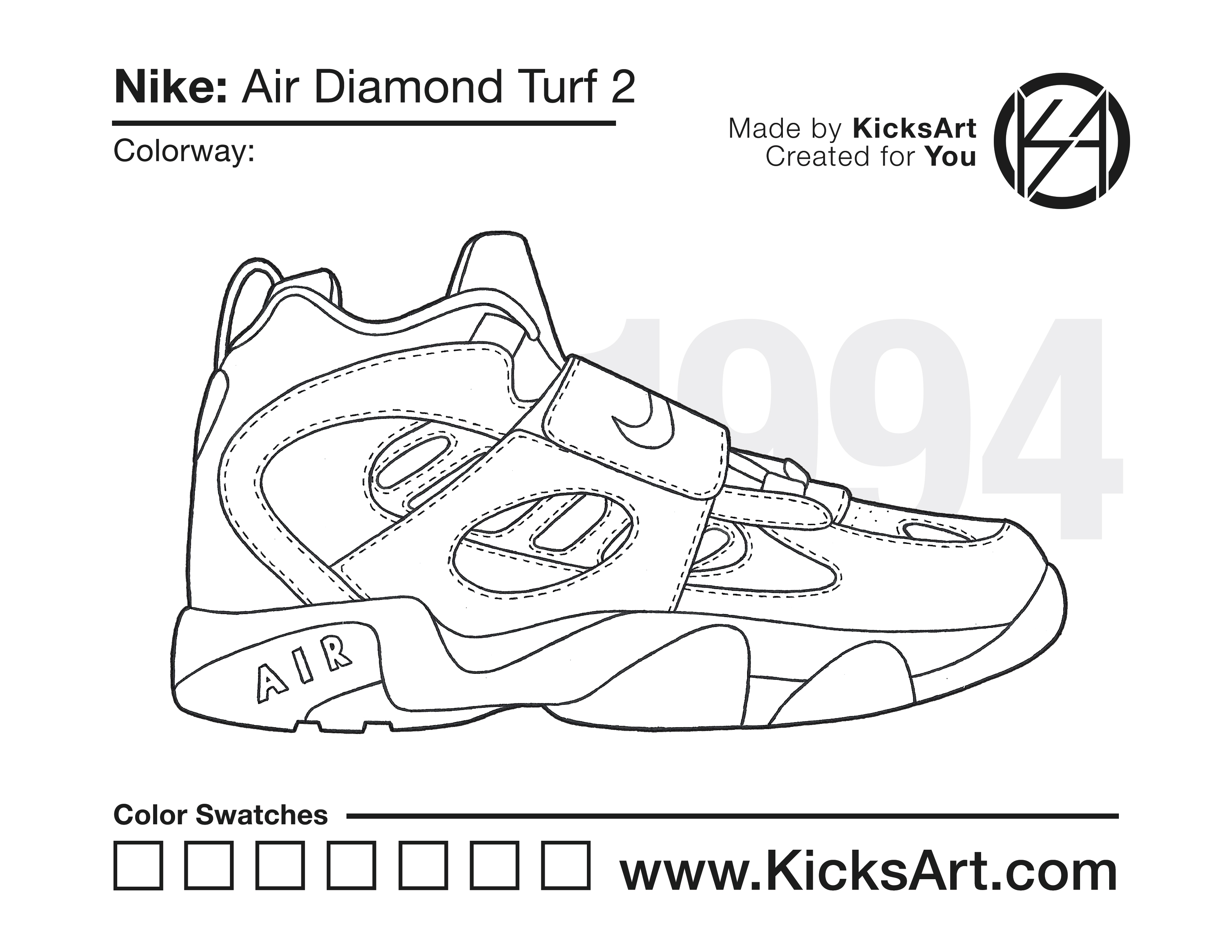 Nike Air Diamond Turf 2 Sneaker Coloring Pages March 13, 2019 kicksart05 For any sneaker coloring page, click on the button above the image to start the instant download! FREE Download: Nike Air Diamond Turf 2 Art materials can be expensive!Try out colorways on these smaller templates so your supplies can last longer! Nike Air Diamond Turf 2 (4UP)