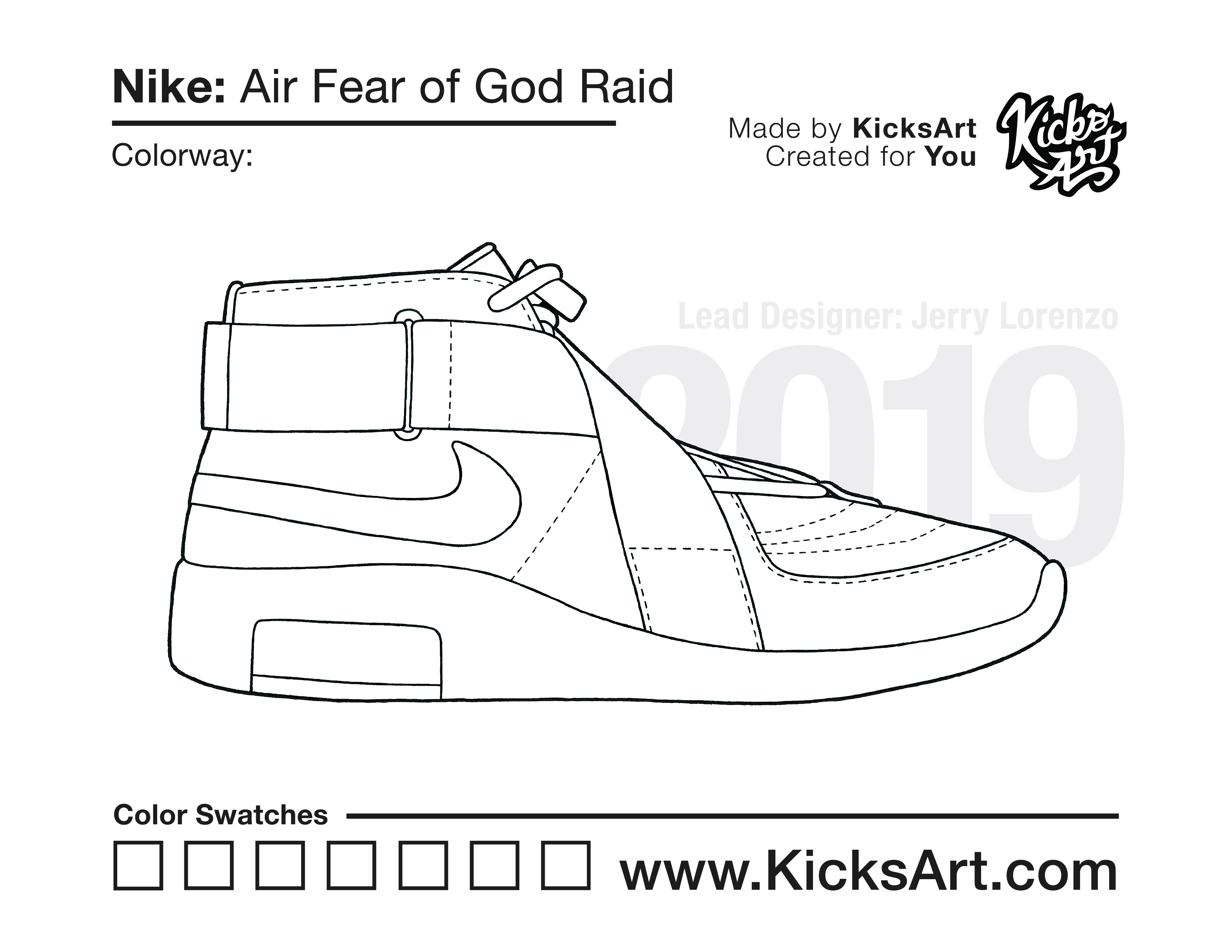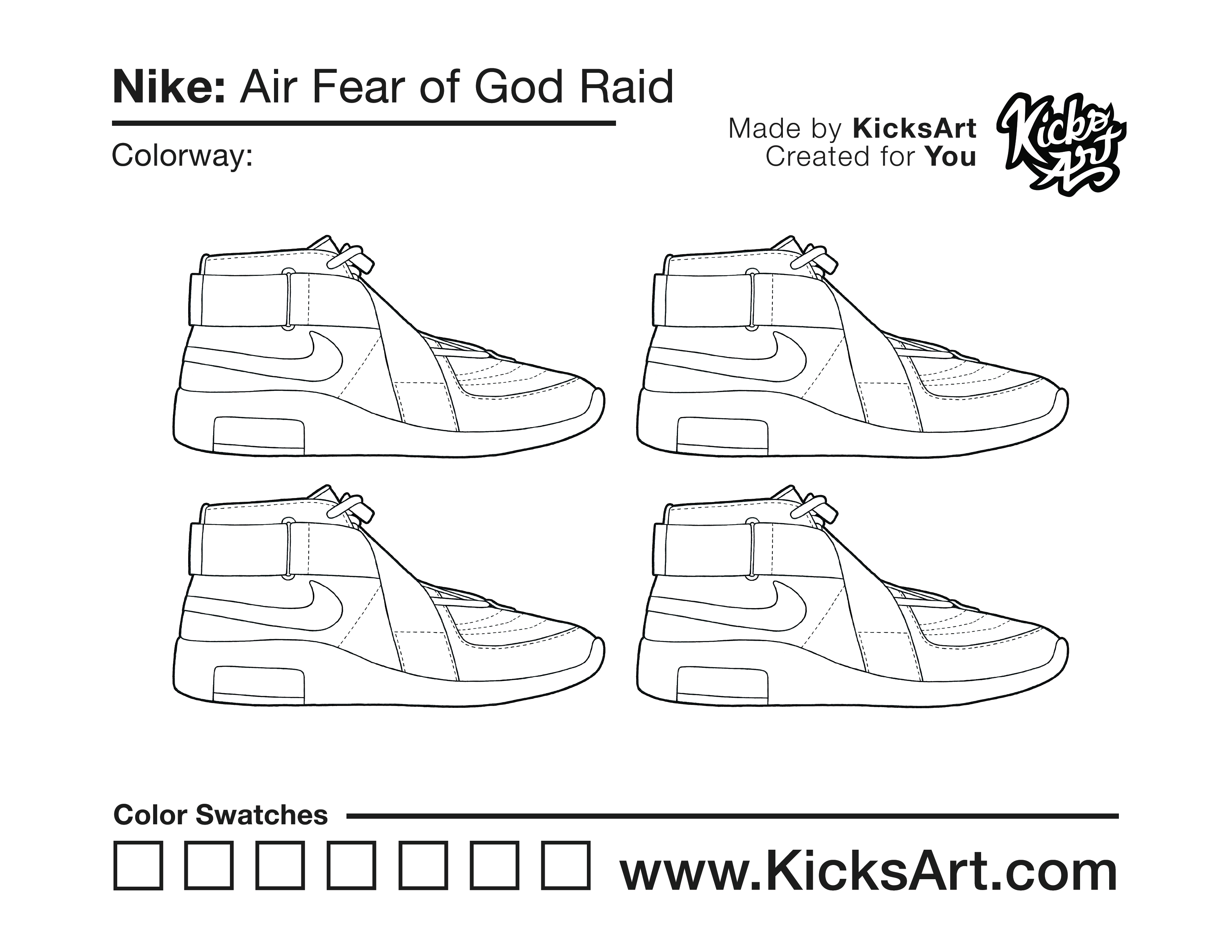 Nike Air Fear of God Raid Sneaker Coloring Pages September 1, 2020 kicksart05 For any sneaker coloring page, click on the button above the image to start the instant download! FREE Download: Nike Air Fear of God Raid Art materials can be expensive!Try out colorways on these smaller templates so your supplies can last longer! Nike Air Fear of God Raid (4UP)