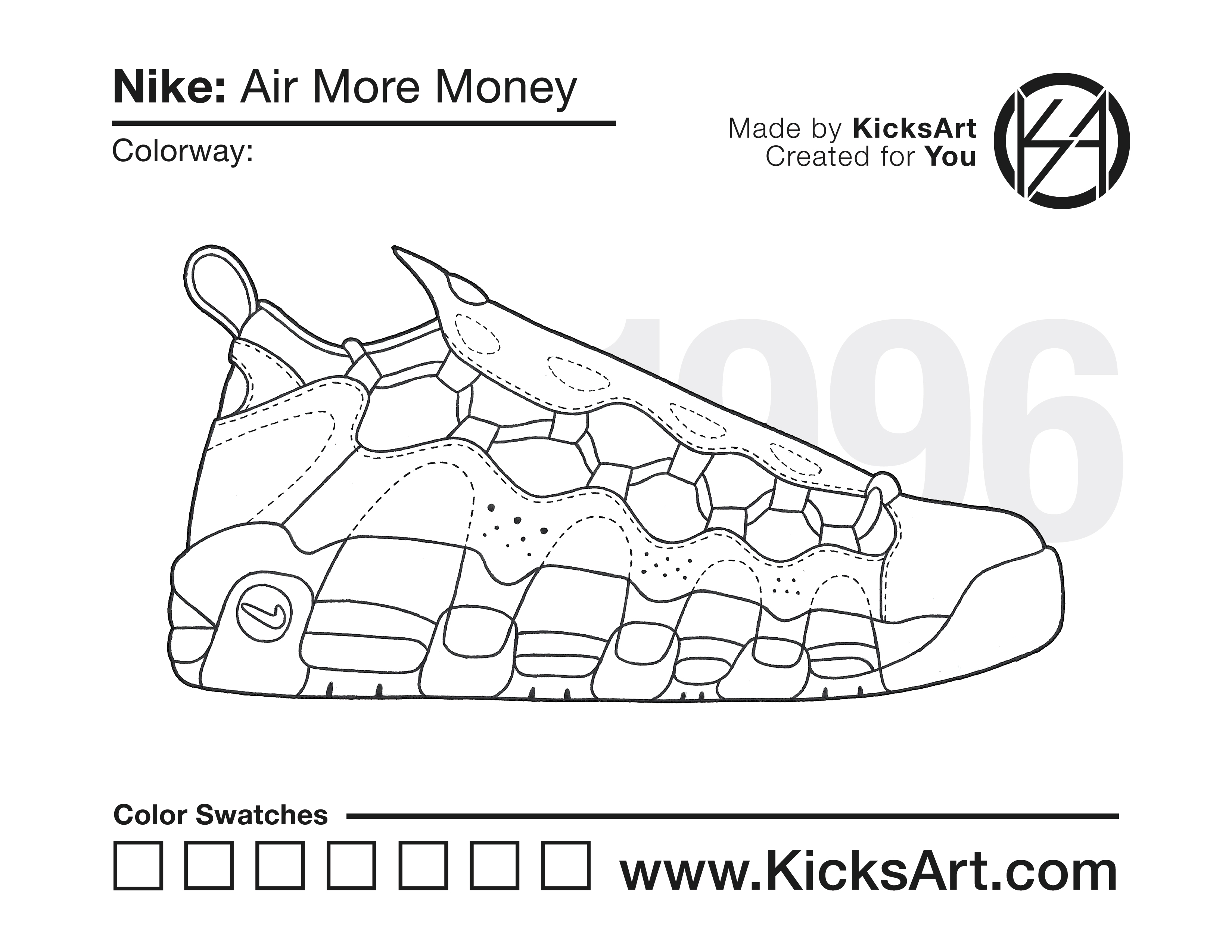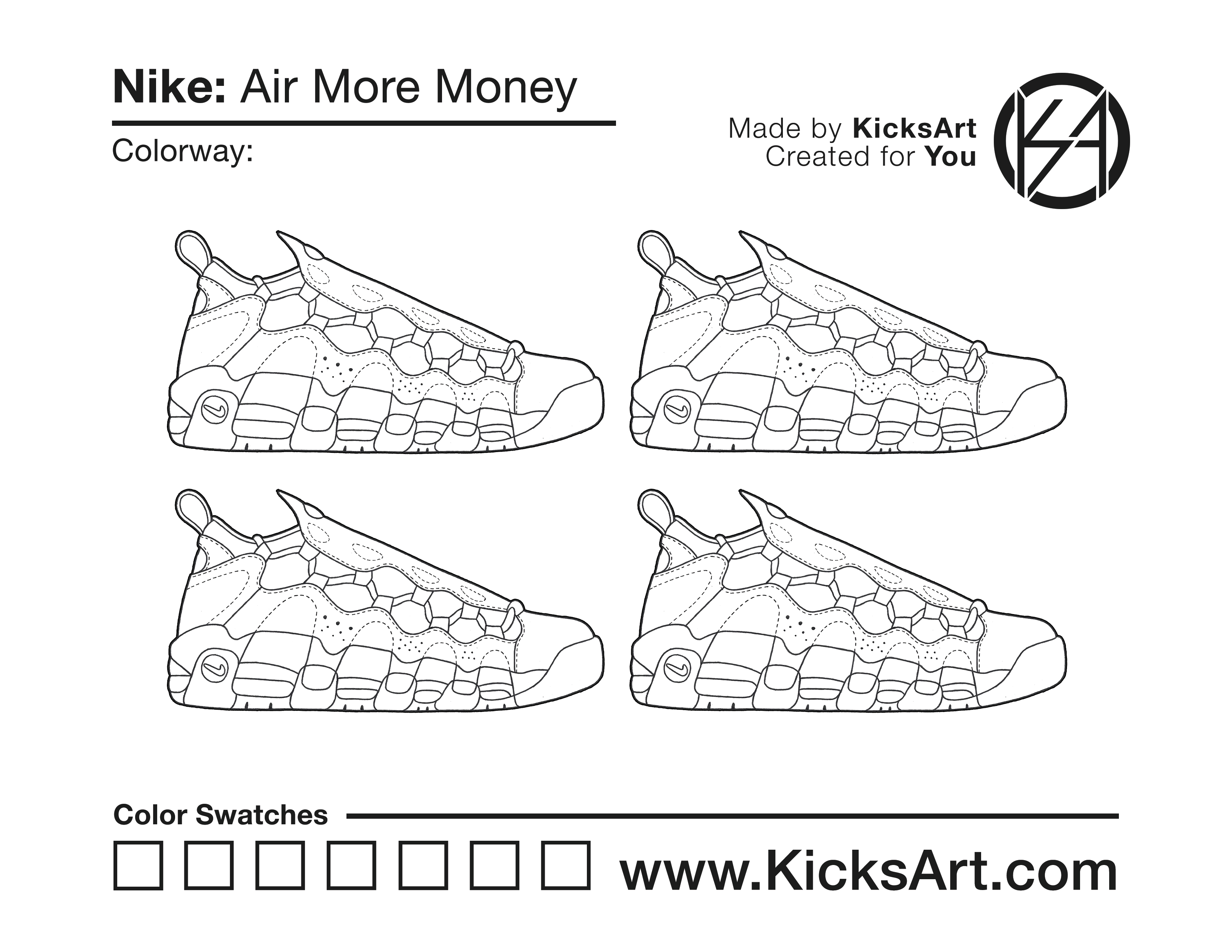 Nike Air More Money Sneaker Coloring Pages March 13, 2019 kicksart05 For any sneaker coloring page, click on the button above the image to start the instant download! FREE Download: Nike Air More Money Art materials can be expensive!Try out colorways on these smaller templates so your supplies can last longer! Nike Air More Money (4UP)
