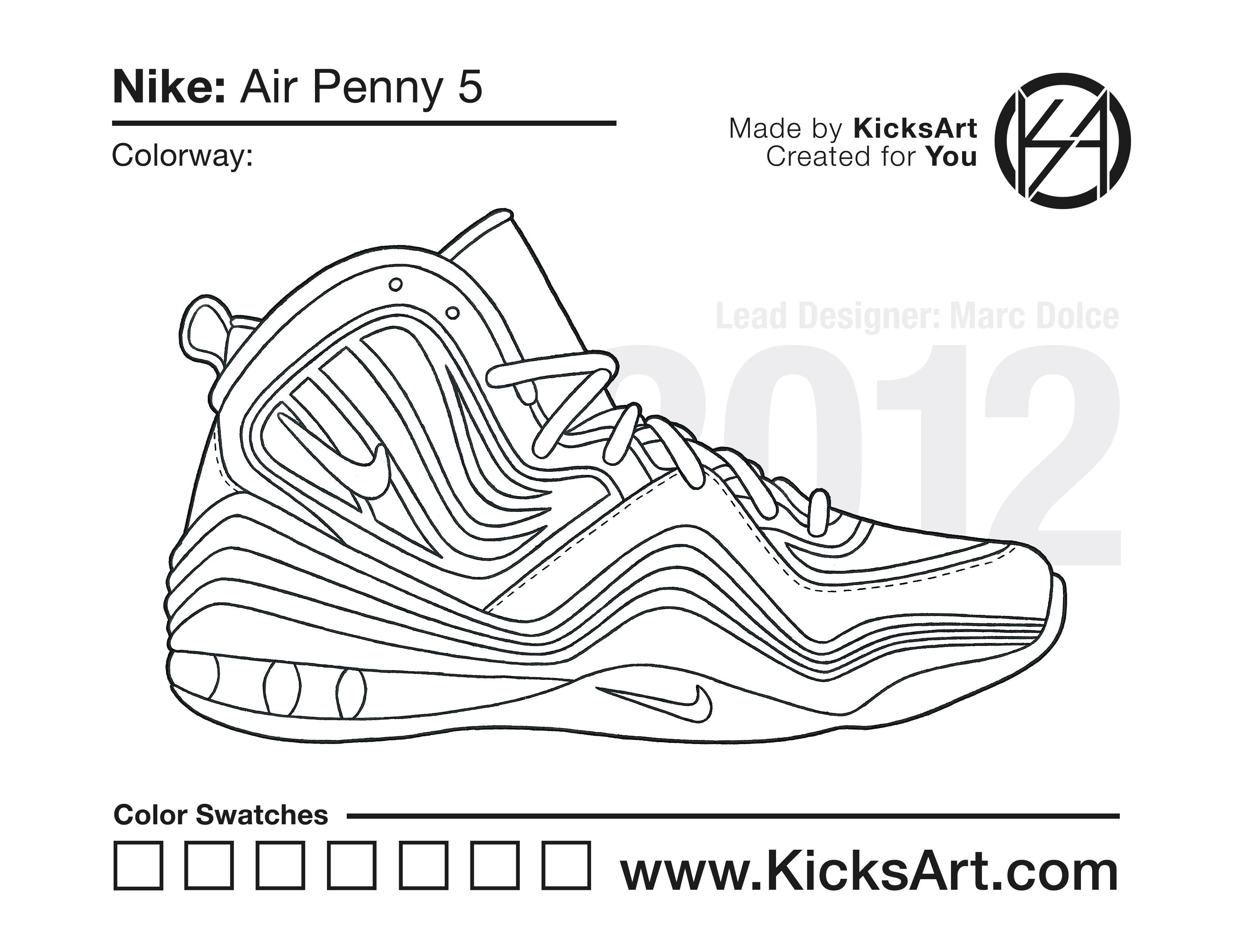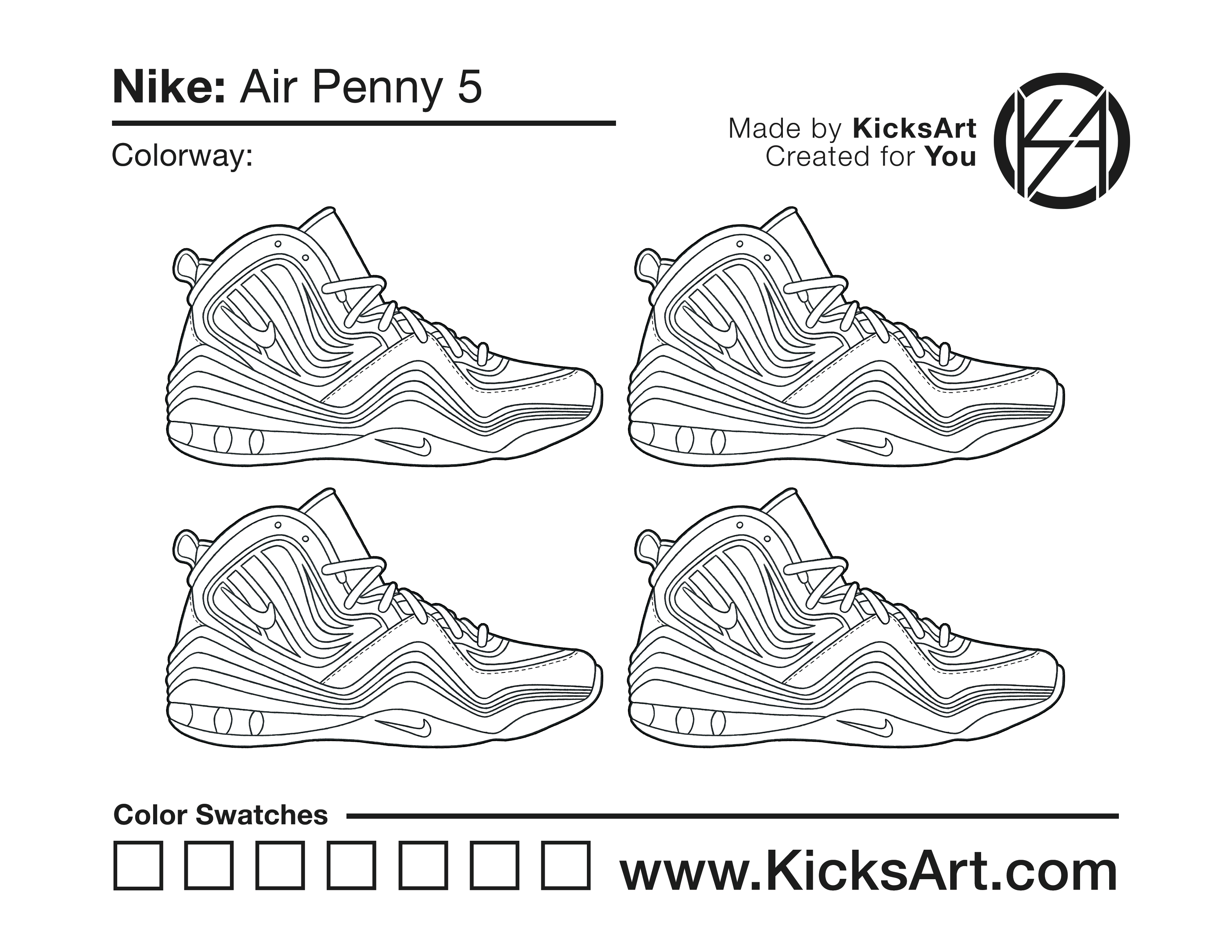 Nike Air Penny 5 Sneaker Coloring Pages March 28, 2019 kicksart05 For any sneaker coloring page, click on the button above the image to start the instant download! FREE Download: Nike Air Penny 5 Art materials can be expensive!Try out colorways on these smaller templates so your supplies can last longer! Nike Air Penny 5 (4UP)