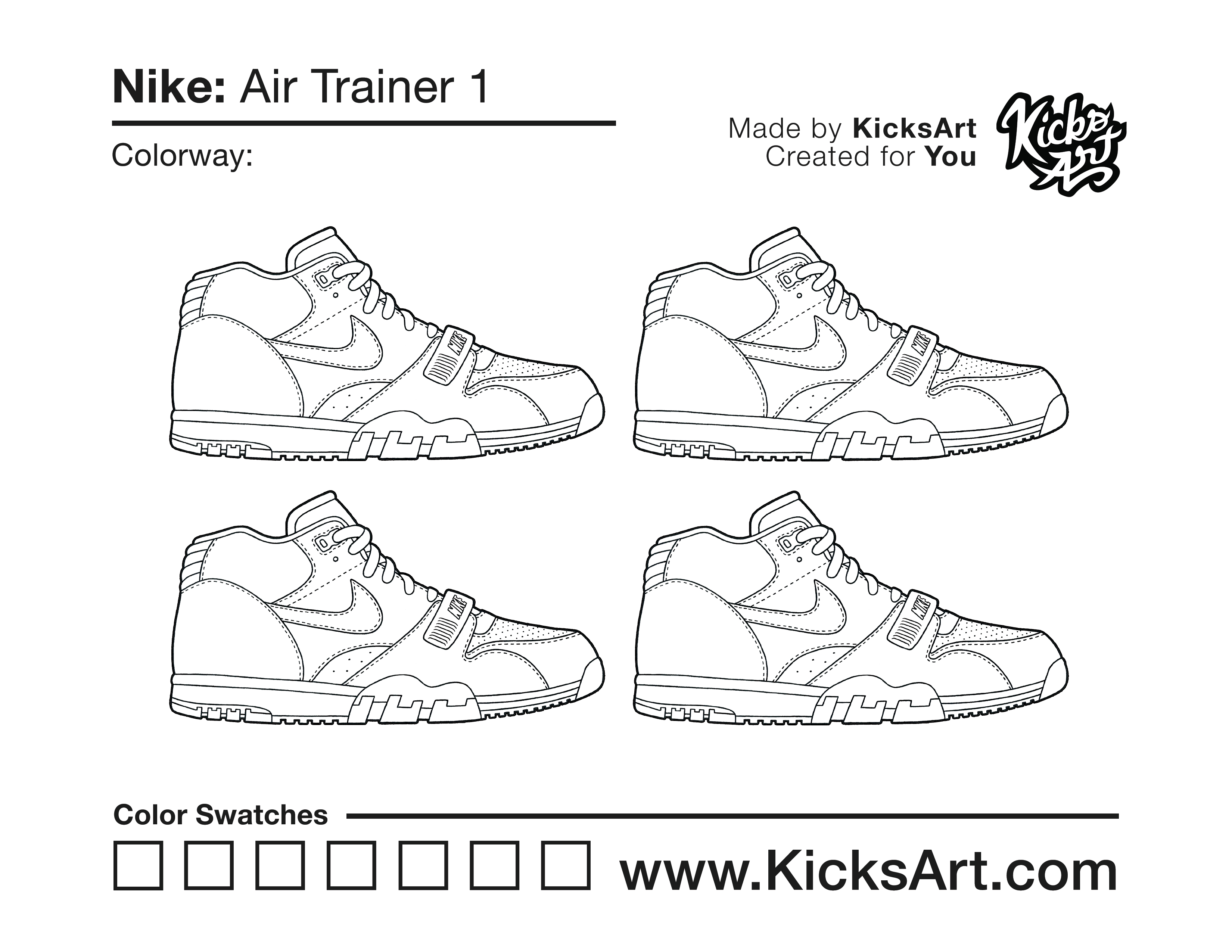 Nike Air Trainer 1 Sneaker Coloring Pages October 13, 2020 kicksart05 For any sneaker coloring page, click on the button above the image to start the instant download! FREE Download: Nike Air Trainer 1 Art materials can be expensive!Try out colorways on these smaller templates so your supplies can last longer! Nike Air Trainer 1 (4UP)