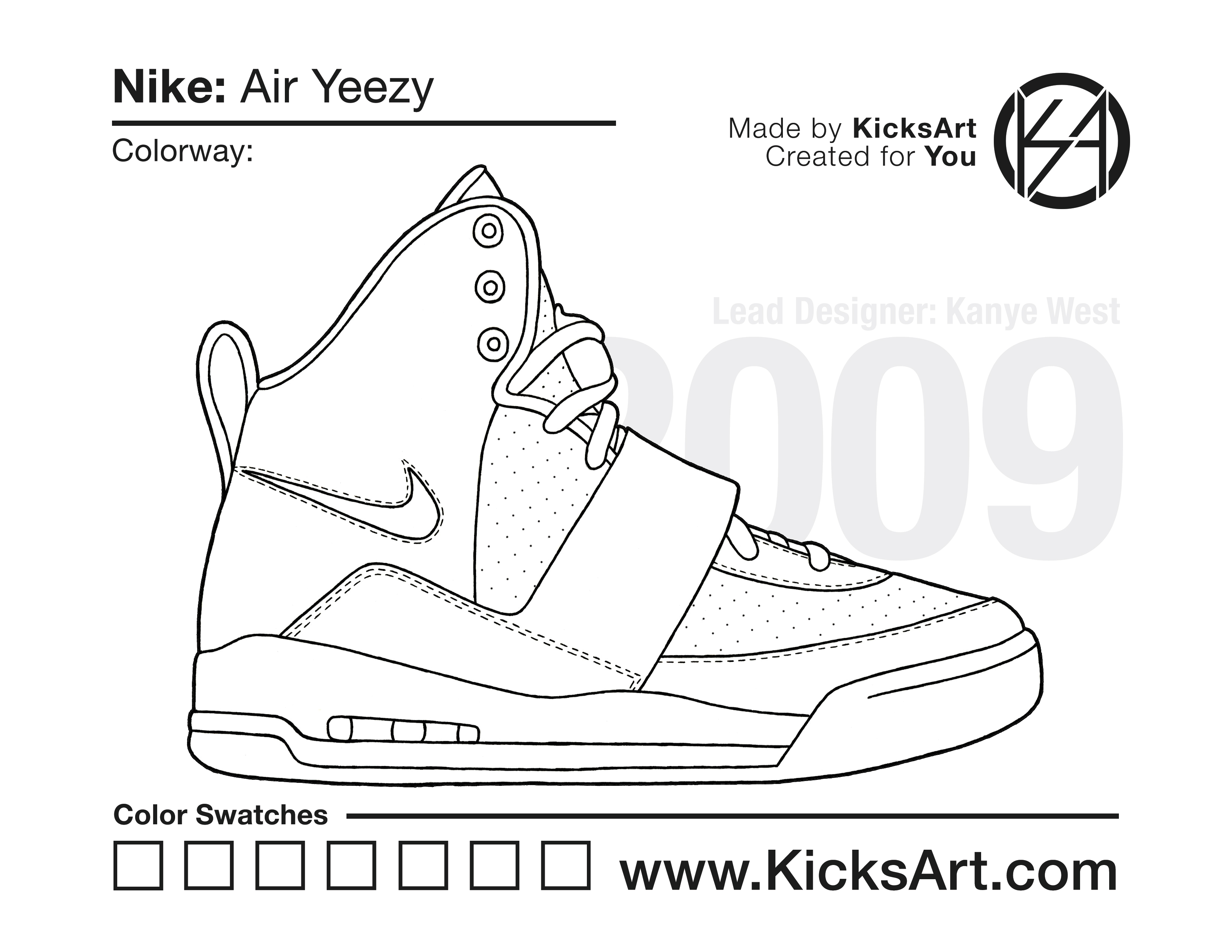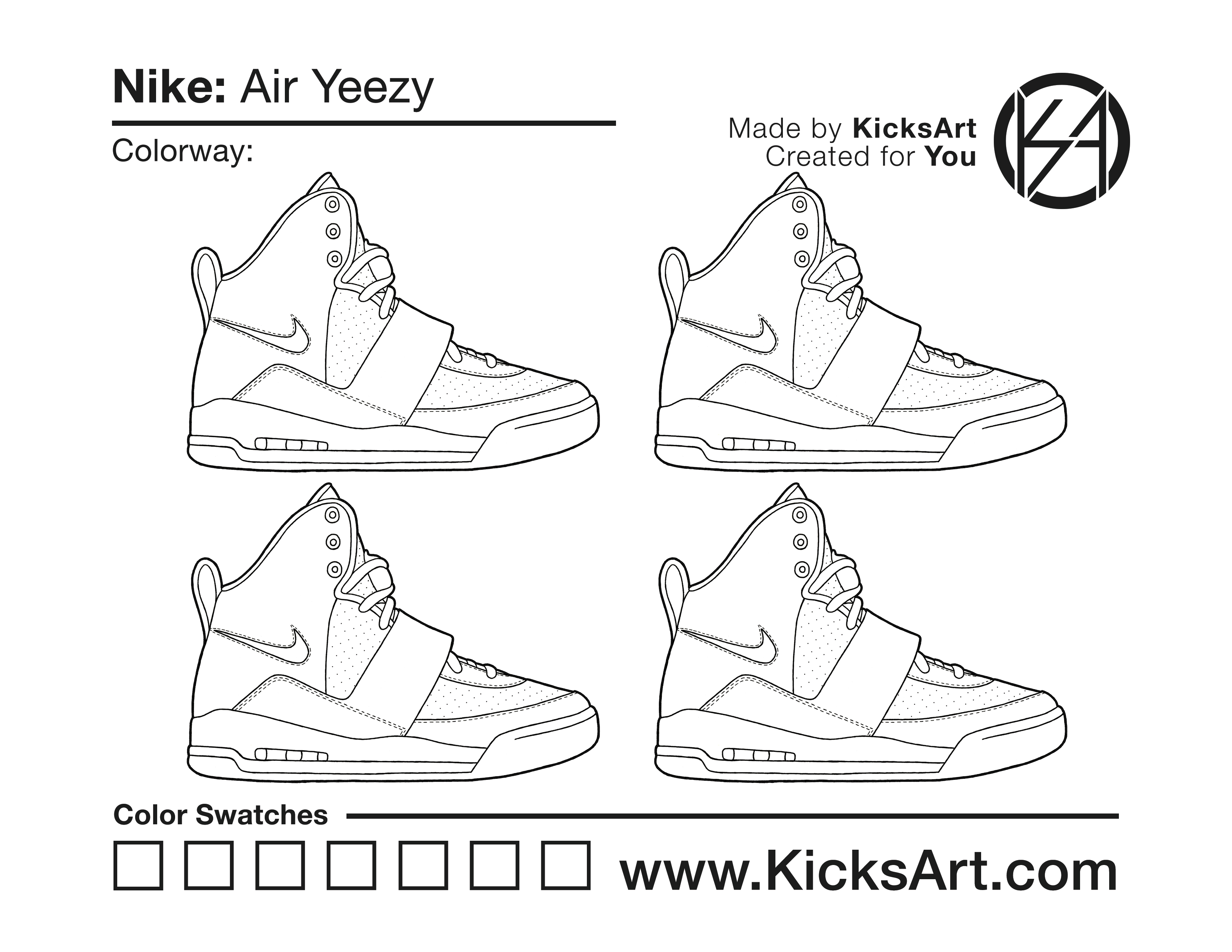 Nike Air Yeezy 1 Sneaker Coloring Pages March 13, 2019 kicksart05 For any sneaker coloring page, click on the button above the image to start the instant download! FREE Download: Nike Air Yeezy 1 Art materials can be expensive!Try out colorways on these smaller templates so your supplies can last longer! Nike Air Yeezy 1 (4UP)