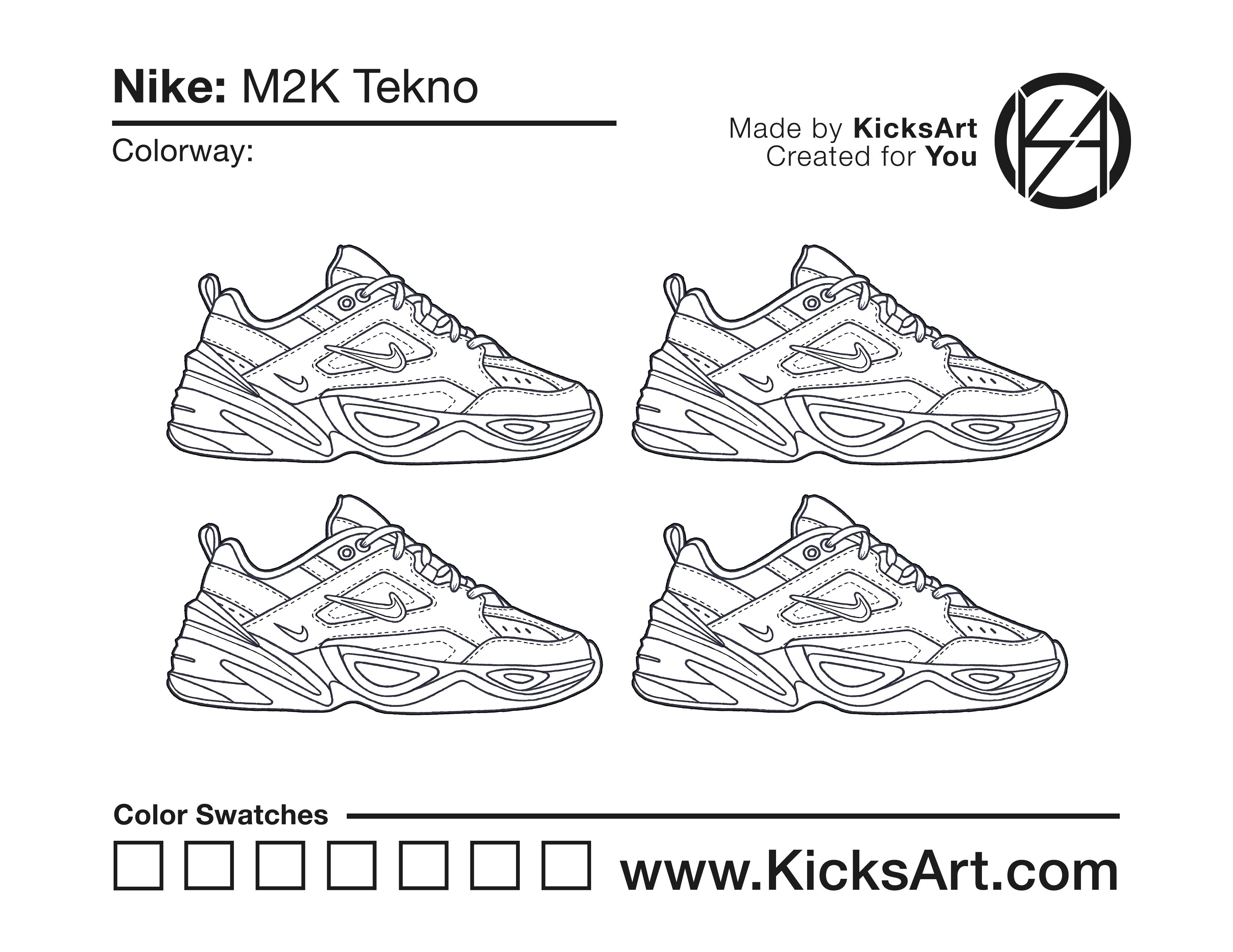 Nike M2K Tekno Sneaker Coloring Pages March 14, 2019 kicksart05 For any sneaker coloring page, click on the button above the image to start the instant download! FREE Download: Nike M2K Tekno Art materials can be expensive!Try out colorways on these smaller templates so your supplies can last longer! Nike M2K Tekno (4UP)