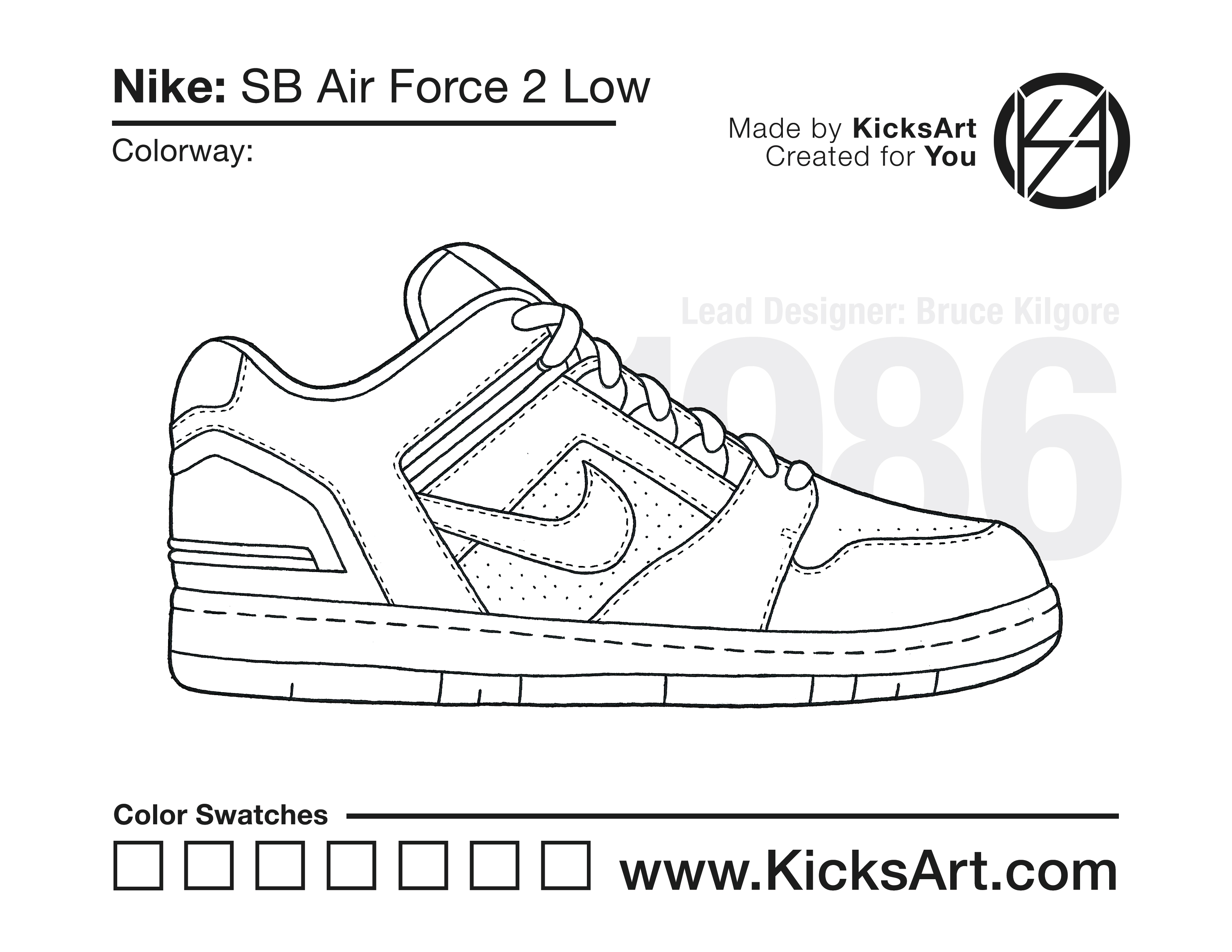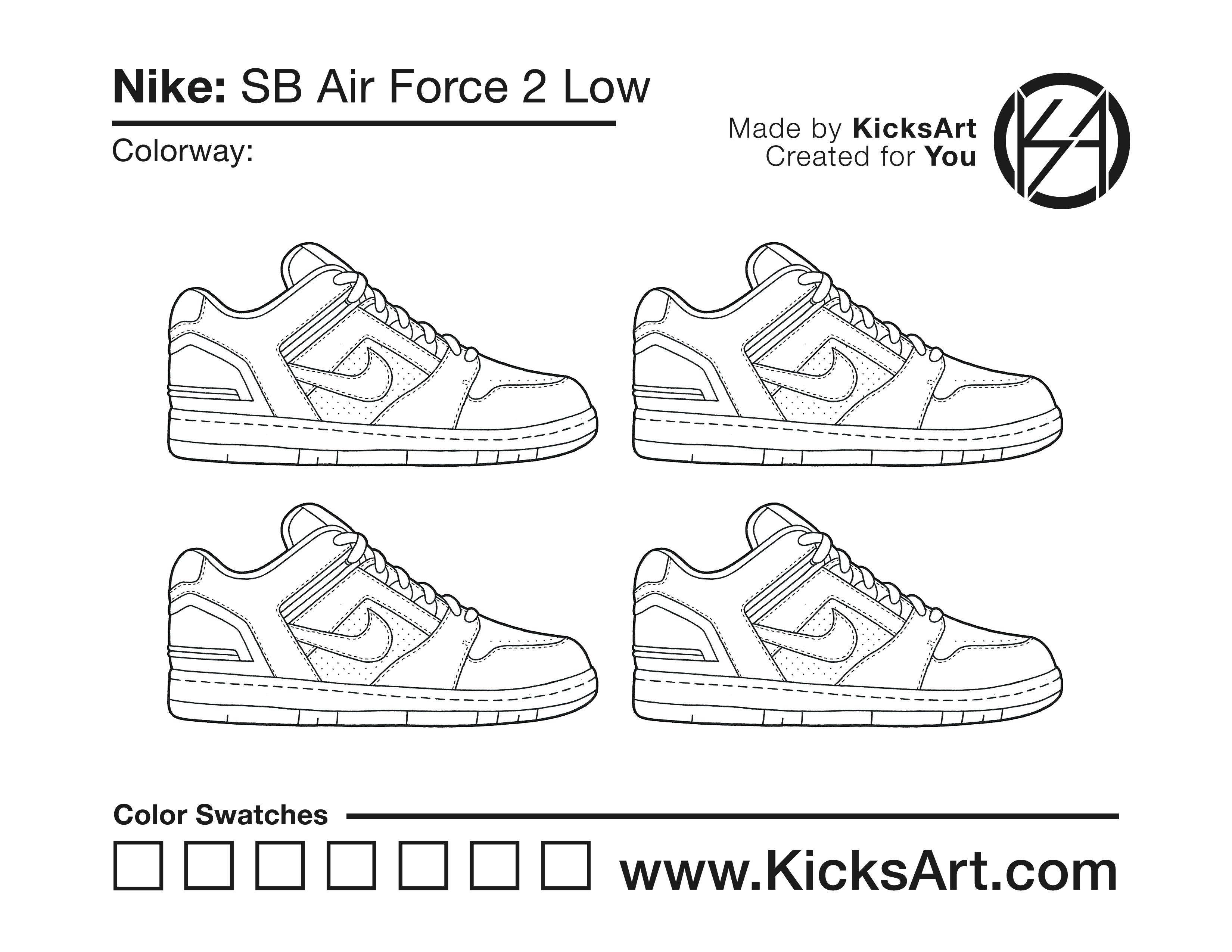 Nike SB Air Force 2 Low Sneaker Coloring Pages March 14, 2019 kicksart05 For any sneaker coloring page, click on the button above the image to start the instant download! FREE Download: Nike SB Air Force 2 Low Art materials can be expensive!Try out colorways on these smaller templates so your supplies can last longer! Nike SB Air Force 2 Low (4UP)