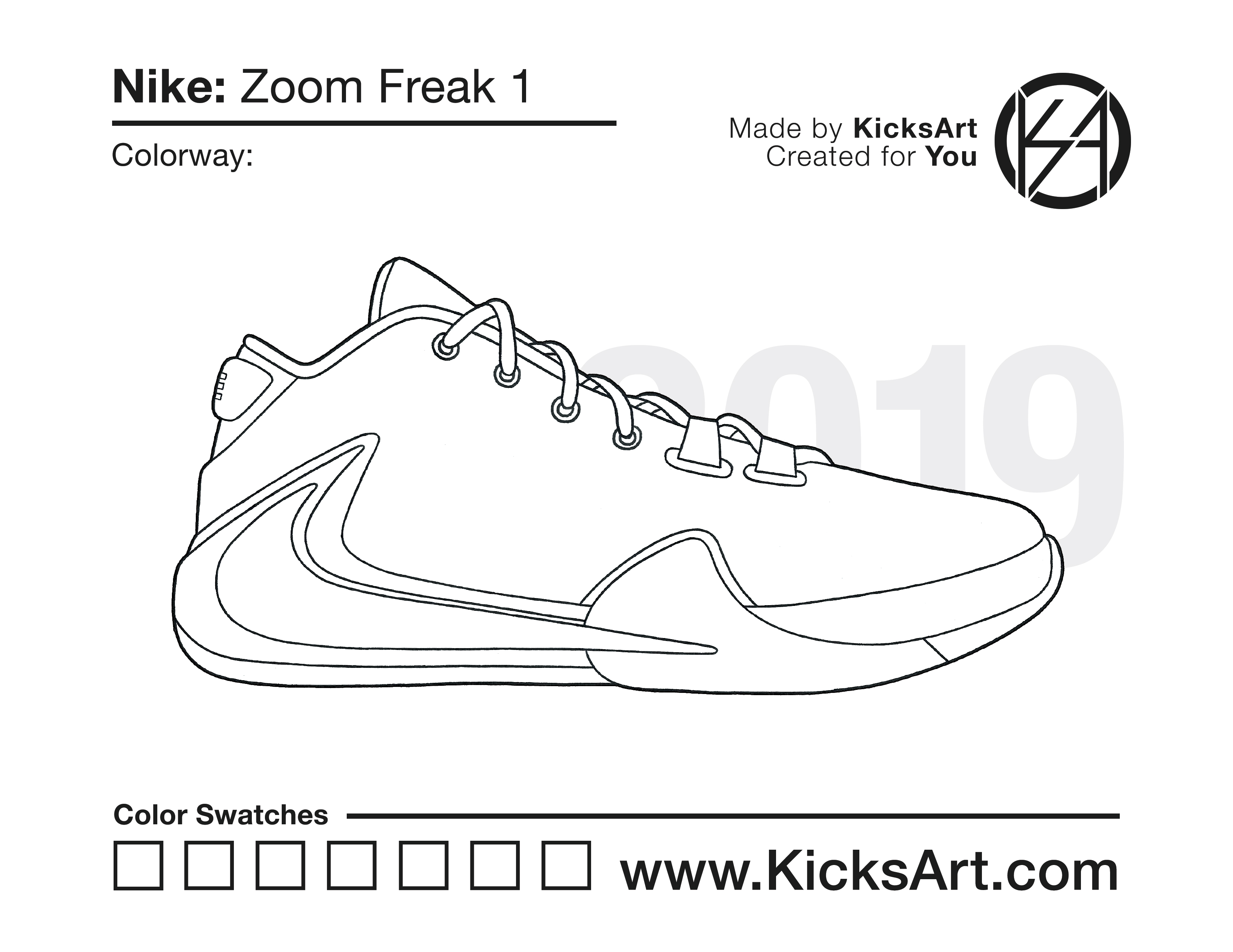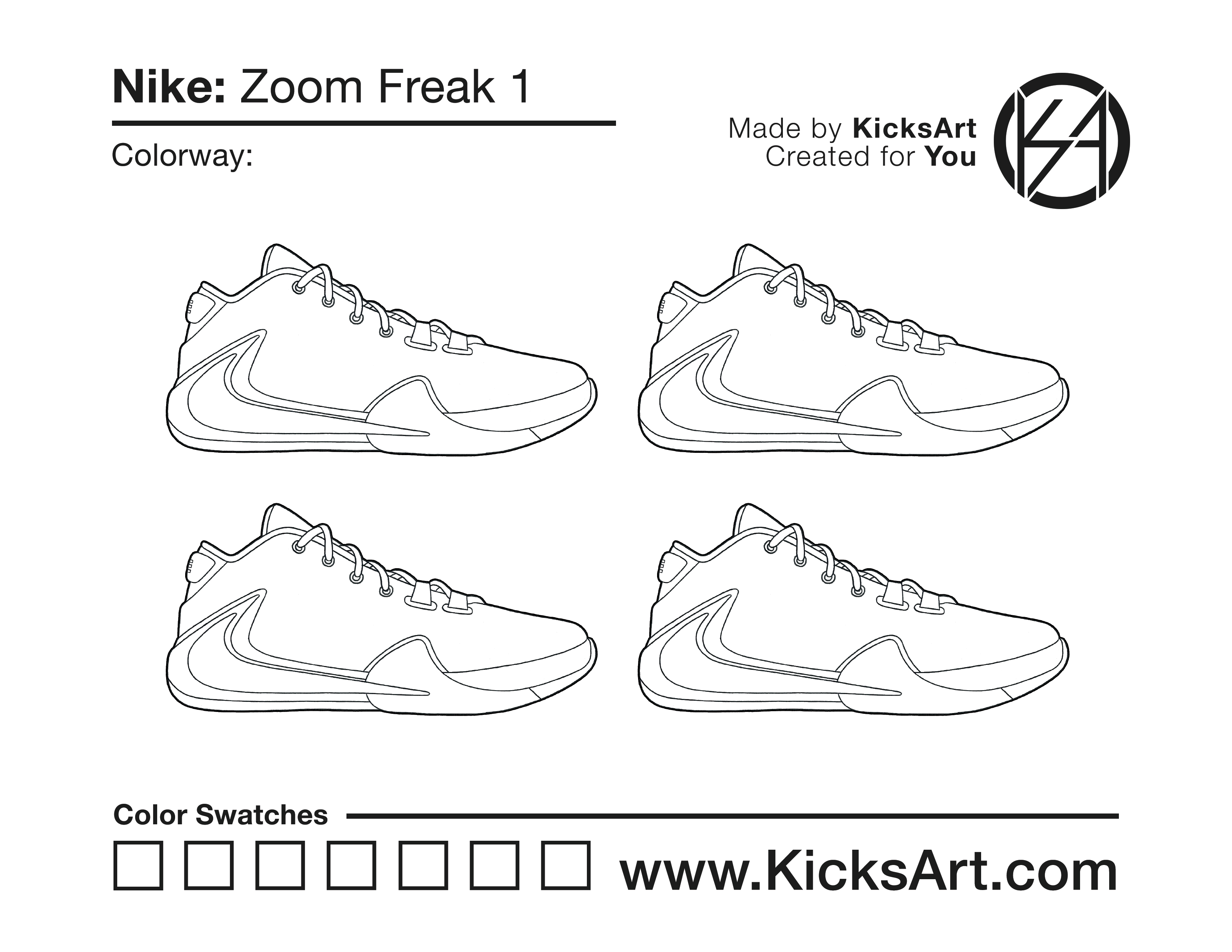 Nike Zoom Freak 1 Sneaker Coloring Pages July 21, 2019 kicksart05 For any sneaker coloring page, click on the button above the image to start the instant download! FREE Download: Nike Zoom Freak 1 Art materials can be expensive!Try out colorways on these smaller templates so your supplies can last longer! Nike Zoom Freak 1 (4UP) Nike Zoom Freak 1 (Drawing Guide) Drawing Guide (Page 2)