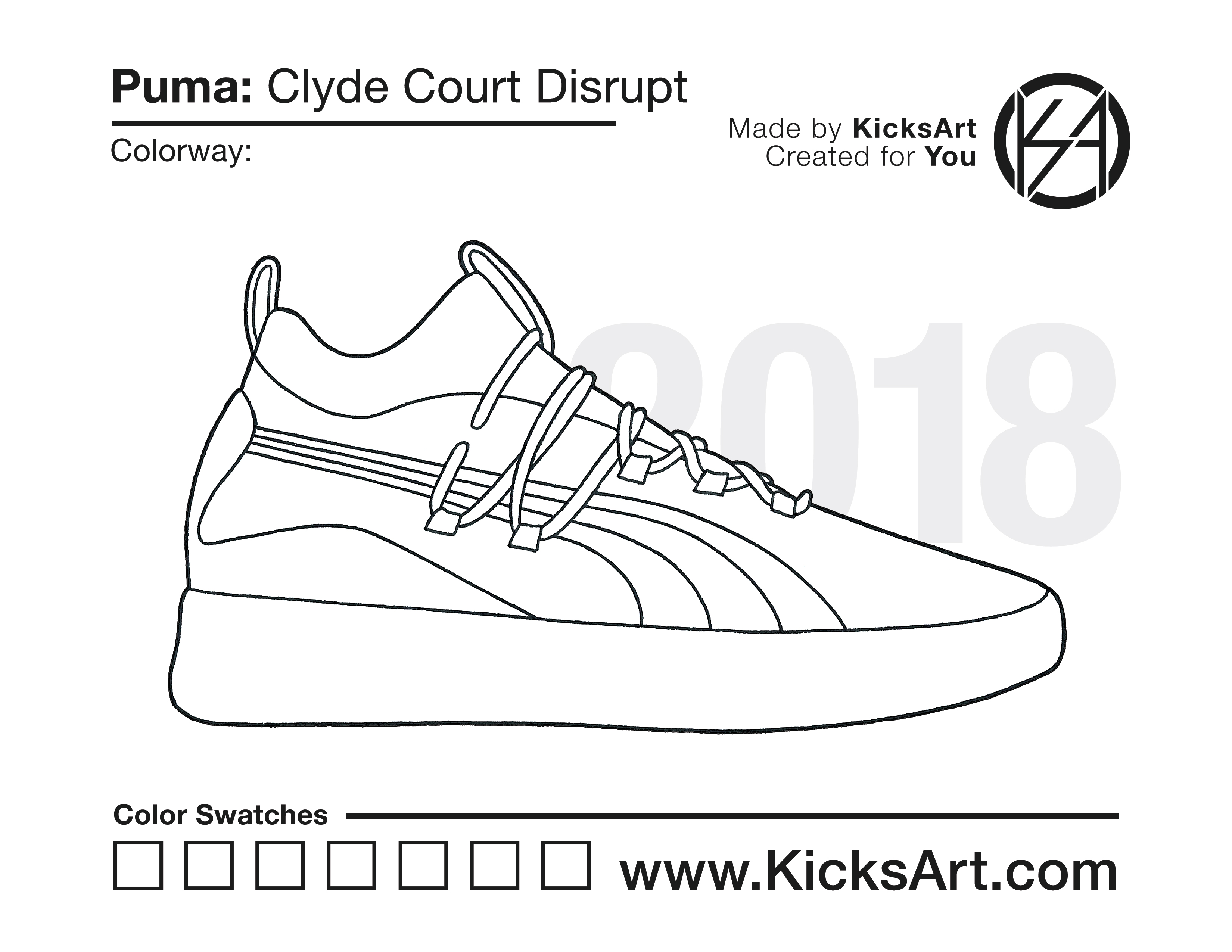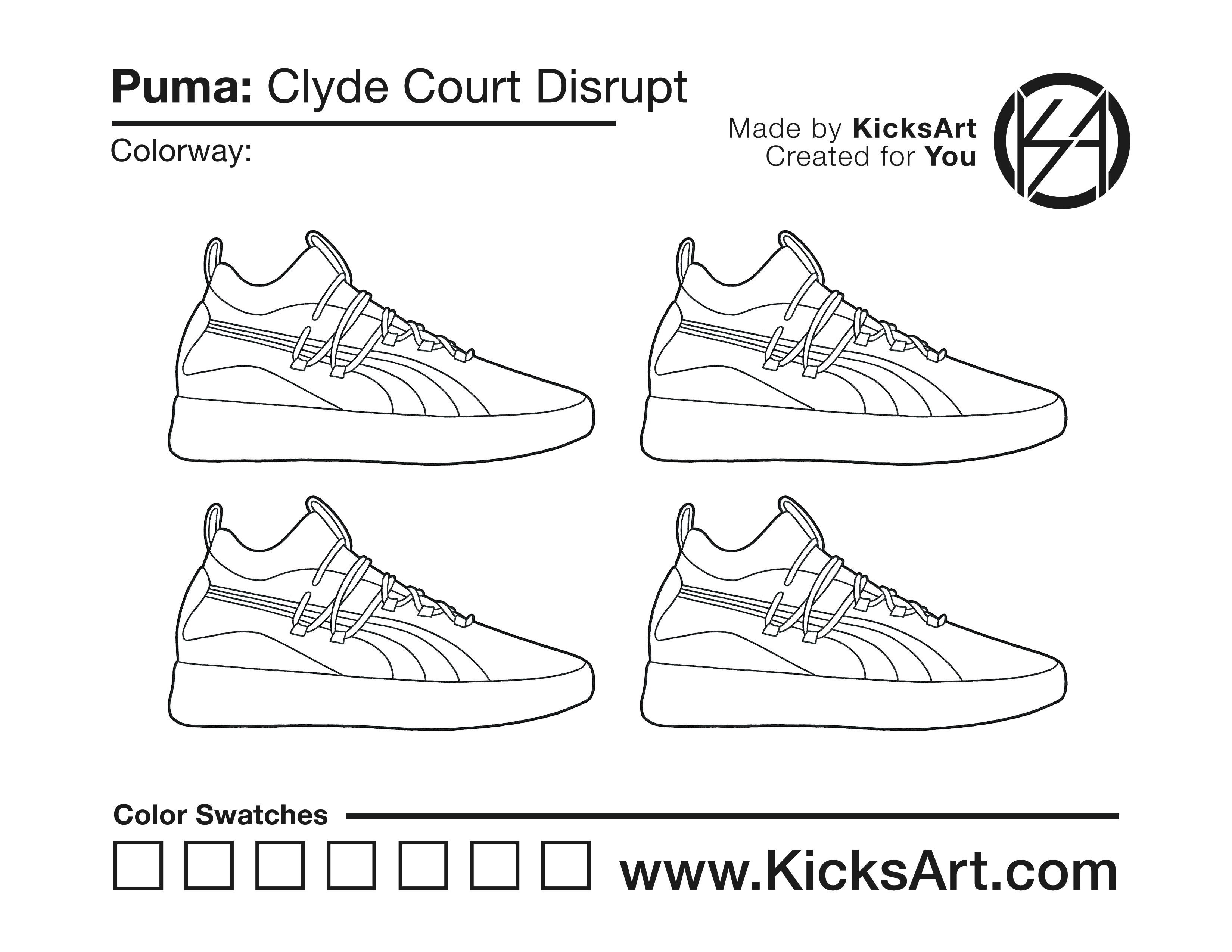Puma Clyde Court Disrupt Sneaker Coloring Pages March 18, 2019 kicksart05 For any sneaker coloring page, click on the button above the image to start the instant download! FREE Download: Puma Clyde Court Disrupt Art materials can be expensive!Try out colorways on these smaller templates so your supplies can last longer! Puma Clyde Court Disrupt (4UP)