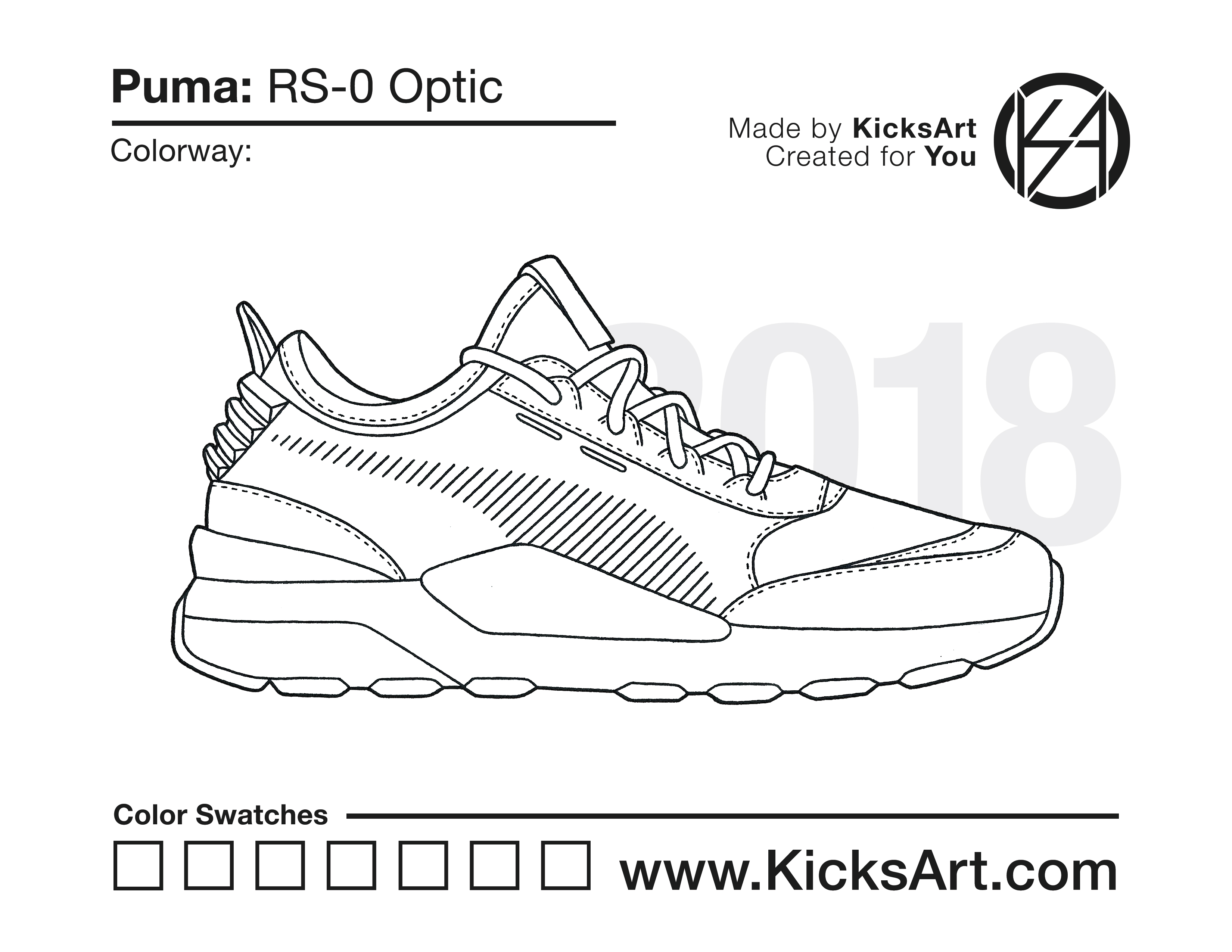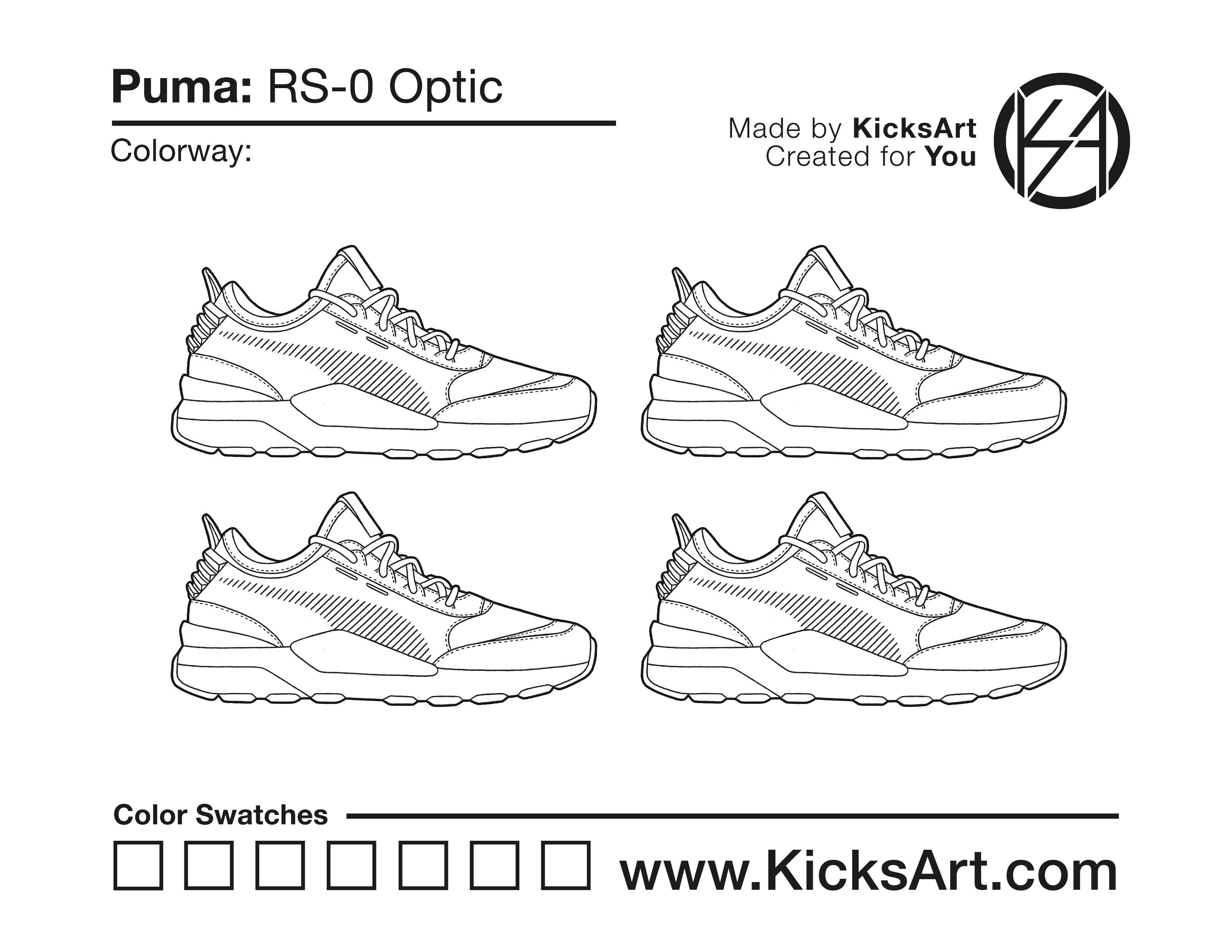 Puma RS-0 Optic Sneaker Coloring Pages March 18, 2019 kicksart05 For any sneaker coloring page, click on the button above the image to start the instant download! FREE Download: Puma RS-0 Optic Art materials can be expensive!Try out colorways on these smaller templates so your supplies can last longer! Puma RS-0 Optic (4UP)