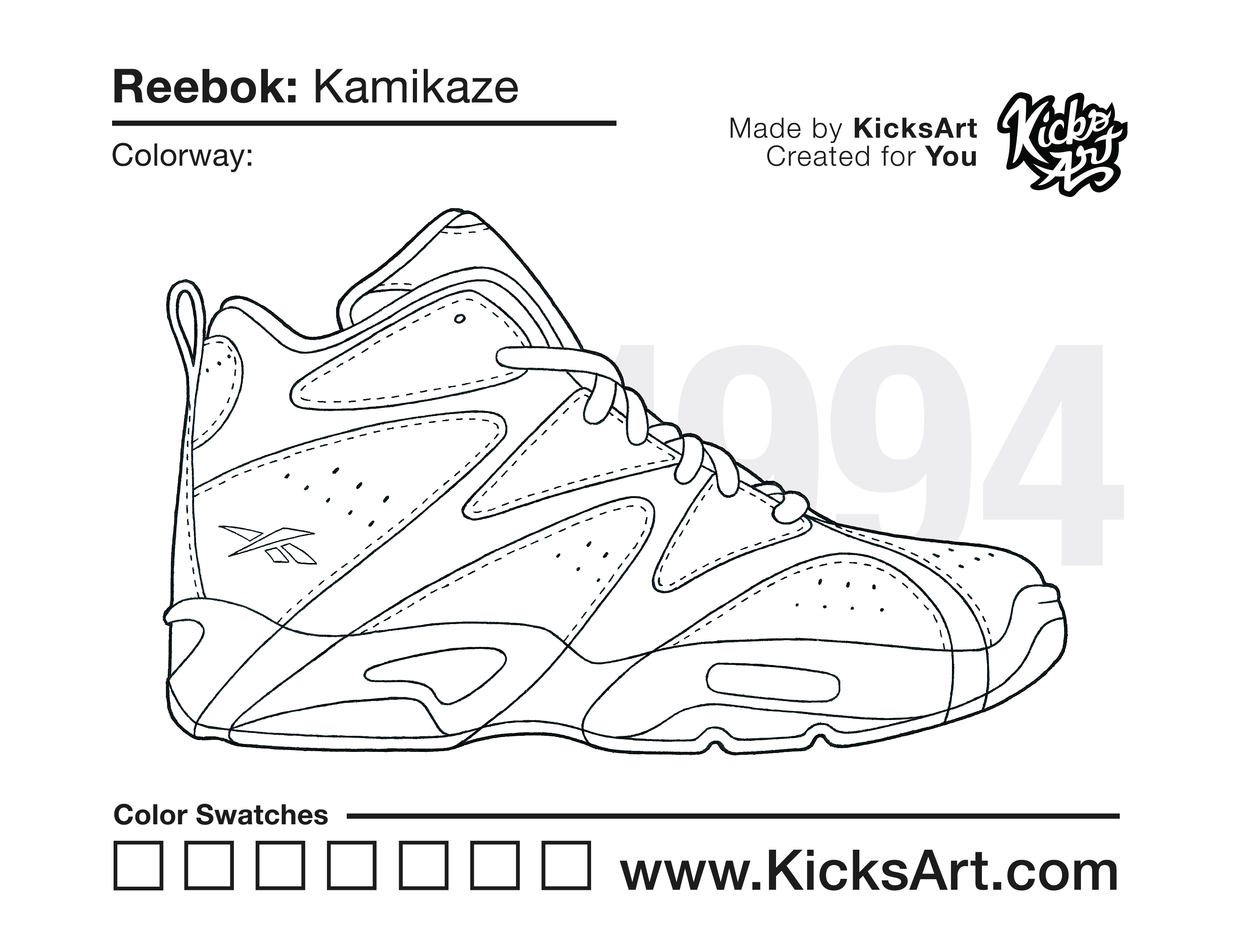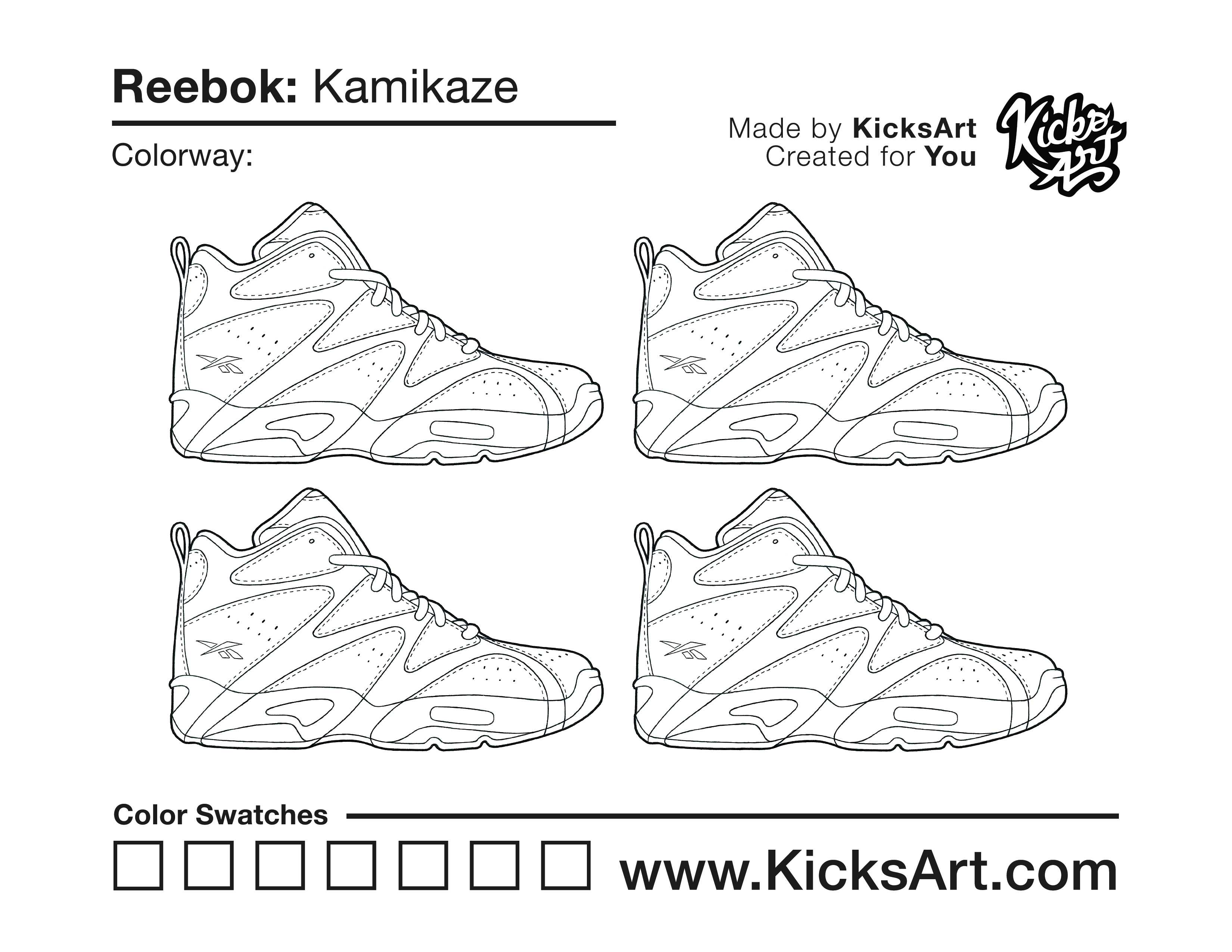 Reebok Kamikaze Sneaker Coloring Pages April 19, 2020 kicksart05 For any sneaker coloring page, click on the button above the image to start the instant download! FREE Download: Reebok Kamikaze Art materials can be expensive!Try out colorways on these smaller templates so your supplies can last longer! Reebok Kamikaze (4UP)